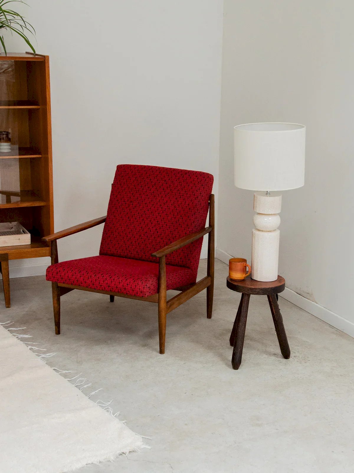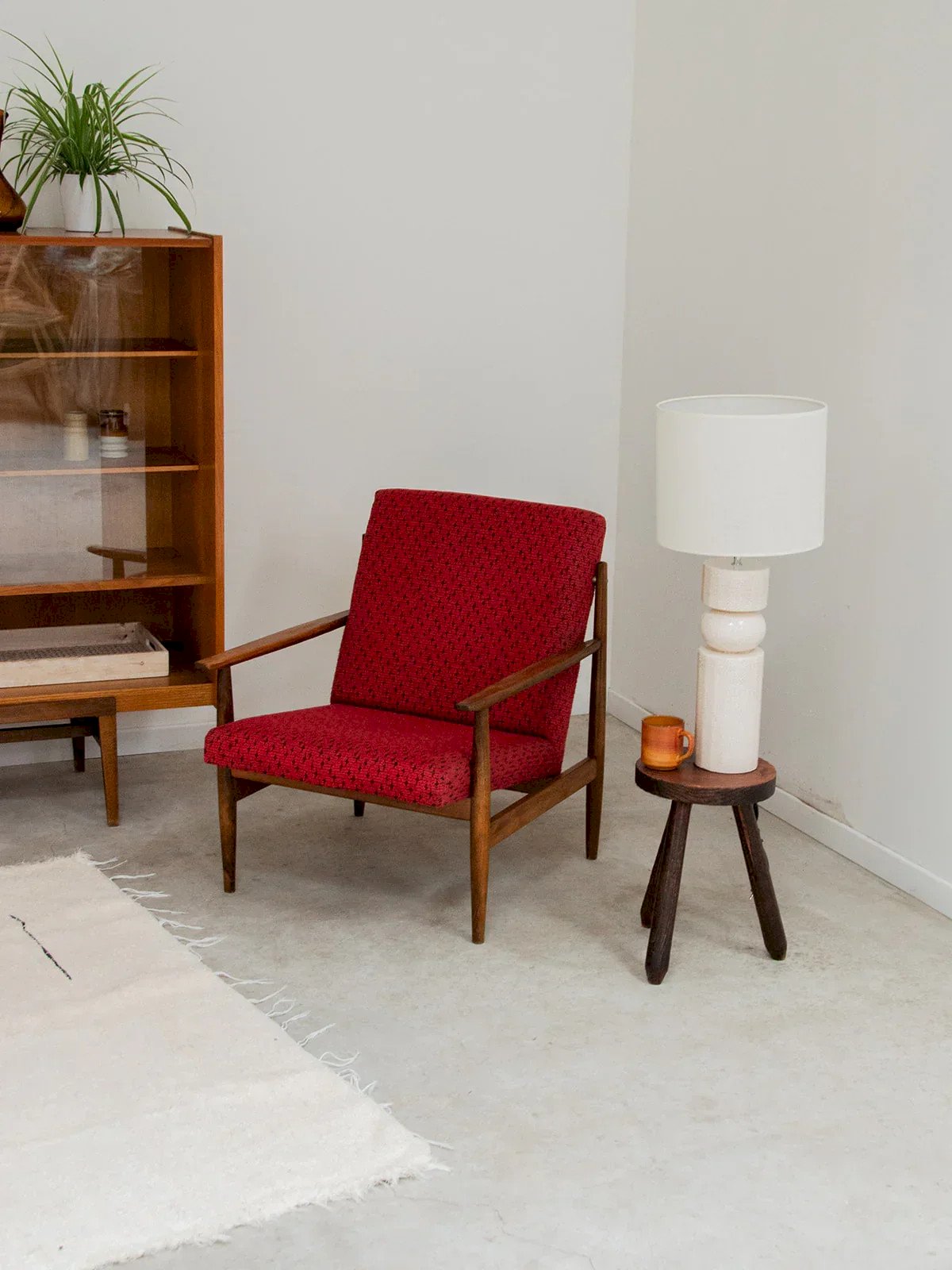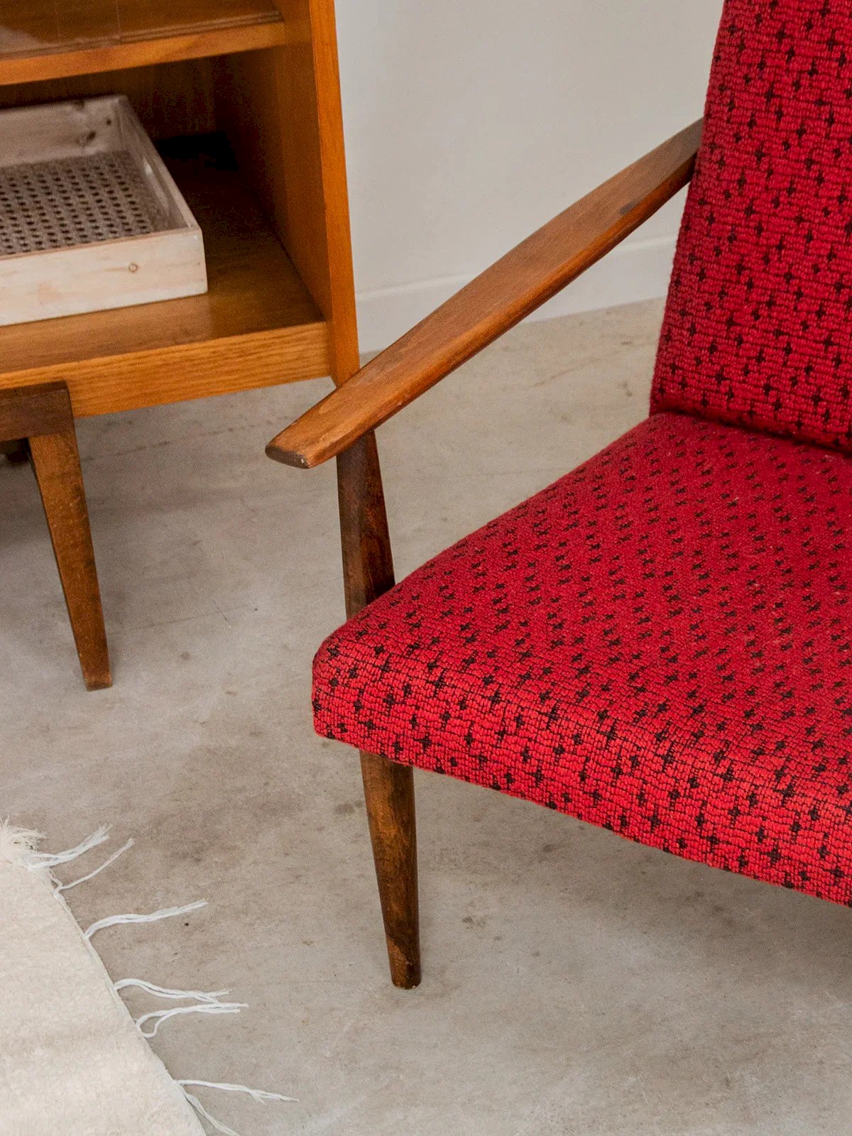 Discover this dark wood armchair with a simple and elegant style, perfect for enhancing your interior. Its red fabric seat and backrest add a touch of warmth and character. The curved armrests emphasize its soft lines, while the round legs provide discreet stability and timeless charm. A comfortable piece full of personality. Sold individually, two quantities are available. Length: 63 cm Width: 72 cm Height: 77 cm Seat height: 38 cm Depth: 63 cm Seat depth: 48 cm Condition: Used: Item that has been used. Item showing some superficial signs of wear, fully operational and functioning correctly. It may be a display model or an item returned to the store after a short period of use. Any imperfections should be noted. Color: Multicolor Height: Wood, Fabric Width: Armchairs and lounge chairs Brand: Debongout Type: Vintage product Material: Wood, Fabric Style: Contemporary