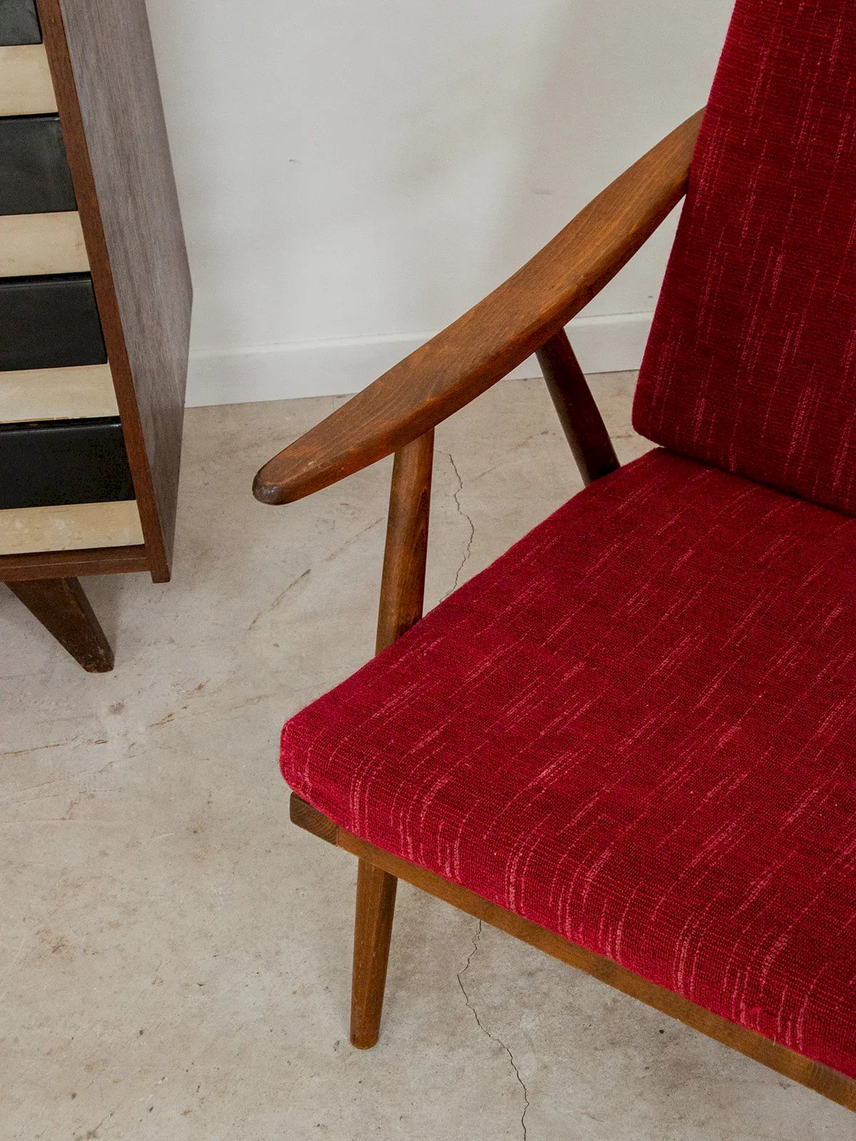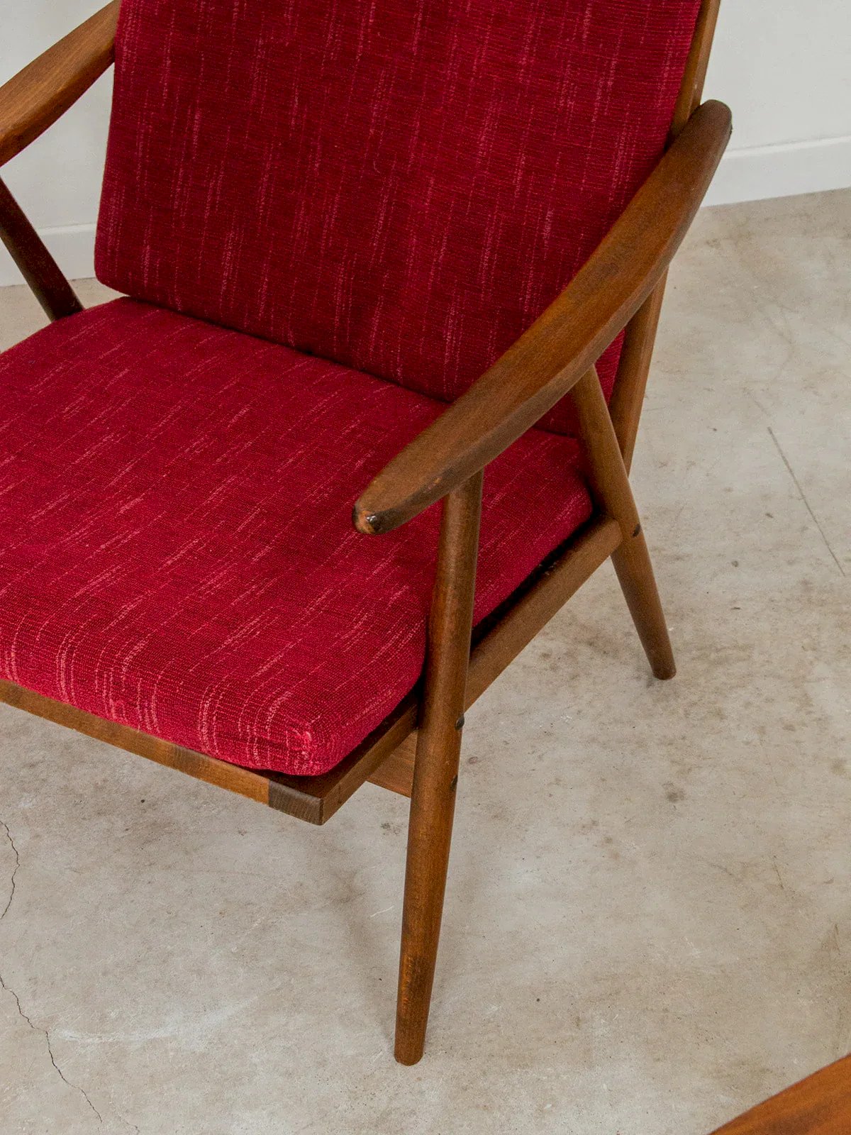 Discover our elegant dark wood armchair, combining comfort and style. This piece of furniture fits perfectly into any space. The red cushions add a pop of vibrant color, making this armchair ideal for brightening up your interior decor. It will charm you with its appeal and friendliness. Add a warm note to your living room with this timeless armchair! Sold individually, two quantities are available. Length: 60 cm Width: 62 cm Height: 77 cm Seat height: 42 cm Condition: Used: Item has been used. Item shows some superficial signs of wear... Used: Item has been used. Item shows some superficial signs of wear, fully operational and functioning correctly. It may be a display model or an item returned to the store after a short period of use. possible imperfections. Color: Multicolor Height: Wood, Fabric Width: Armchairs and Lounge Chairs Brand: Debongout Type: Thrifted product Material: Wood, Fabric Style: Contemporary