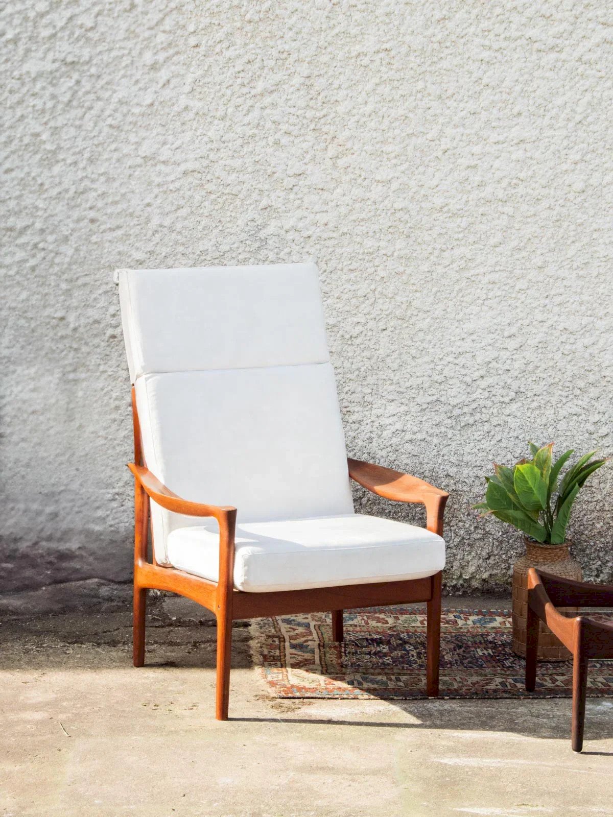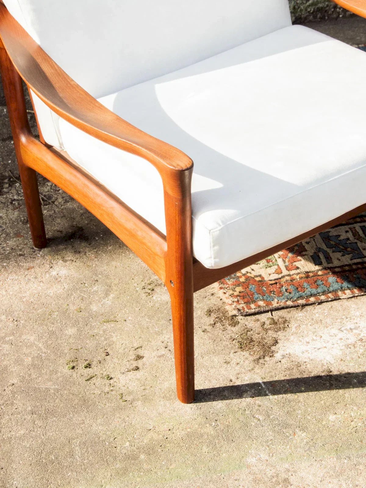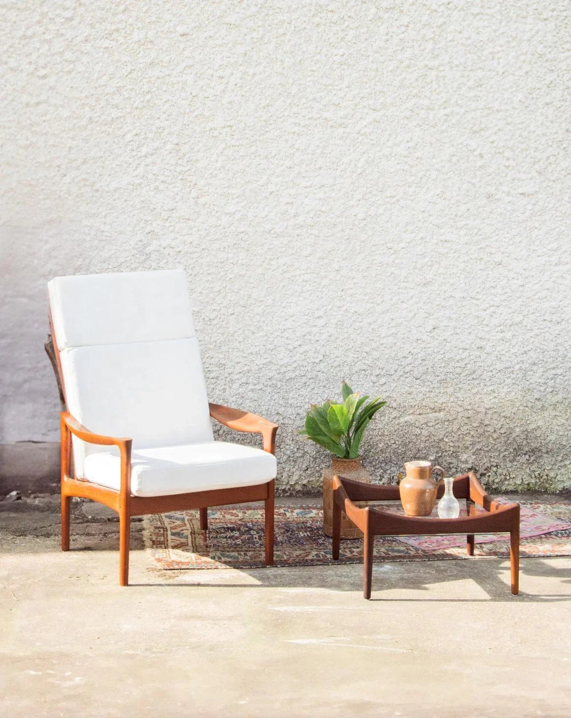 Discover this vintage armchair with Scandinavian design, signed by designer Kristian Illum Wikkelsø, dating back to the 1960s. Its elegant wooden frame supports white cushions, adding a touch of brightness to your interior. This piece of furniture, combining comfort and style, embodies the spirit of Danish design with its simplicity and functionality. Ideal for a modern or retro living room, it will bring charm to your space. An essential piece for enthusiasts of quality Scandinavian furniture. Length: 72 cm Height: 102 cm Seat height: 43 cm Depth: 83 cm Condition: Used item. The item shows some superficial signs of wear, fully operational and functioning correctly. It may be a demonstration model or an item returned to the store after a short period of use with possible imperfections. Color: Multicolor Height: Wood, Fabric Width: Armchairs and lounge chairs Brand: Debongout Type: Vintage product Material: Wood, Fabric Style: Contemporary