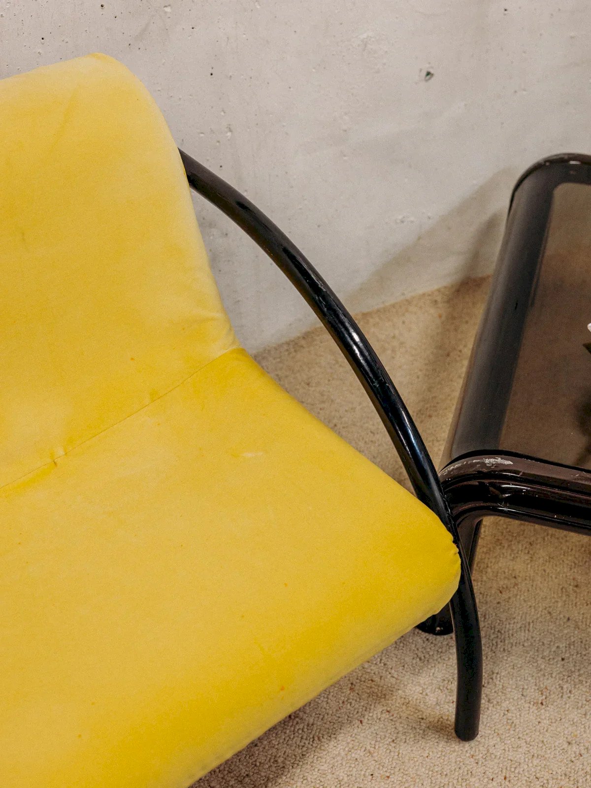 Discover our chair with bold charm, combining an elegant black metal structure with a bright yellow velvet seat. Its contemporary design is enhanced by original rear legs, giving your interior a unique and refined touch. Perfect for adding a splash of color and comfort to your living room or office, this chair is the ideal choice for those who appreciate style and functionality. Let yourself be seduced by its modern and warm appeal! Width: 67 cm Height: 74 cm Seat height: 41 cm Depth: 80 cm Seat depth: 39 cm Condition: Used: Item that has been used. Item showing some superficial wear marks, fully operational and functioning correctly. It may be a demonstration model or an item returned to the store after a short period of use. any potential imperfections. Color: Multicolor Height: Velvet, Metal Width: Armchairs and lounge chairs Brand: Debongout Type: Vintage product Material: Velvet, Metal Style: Contemporary