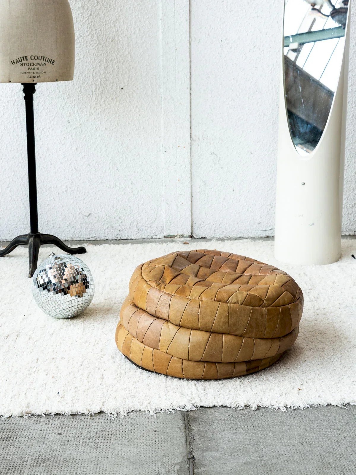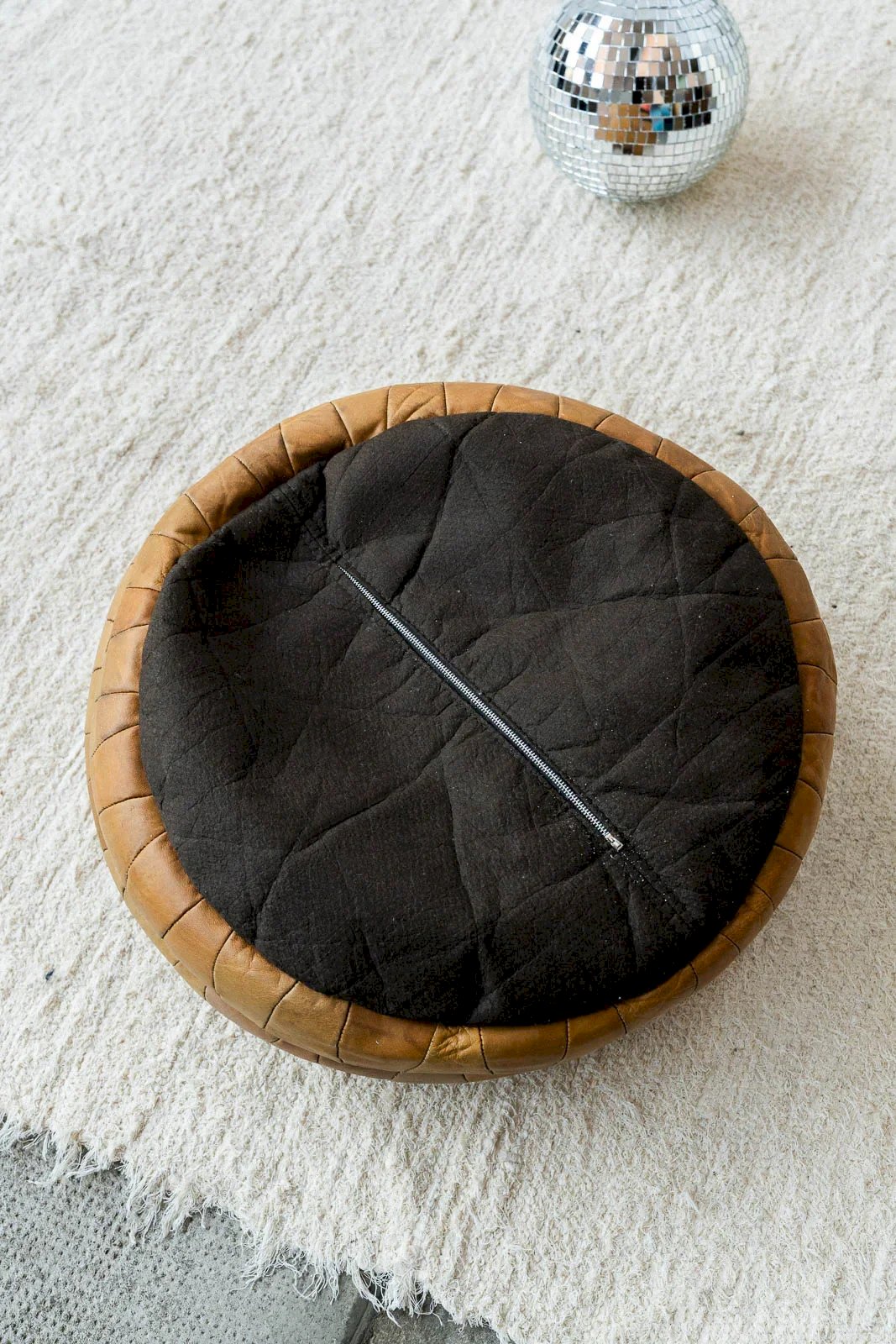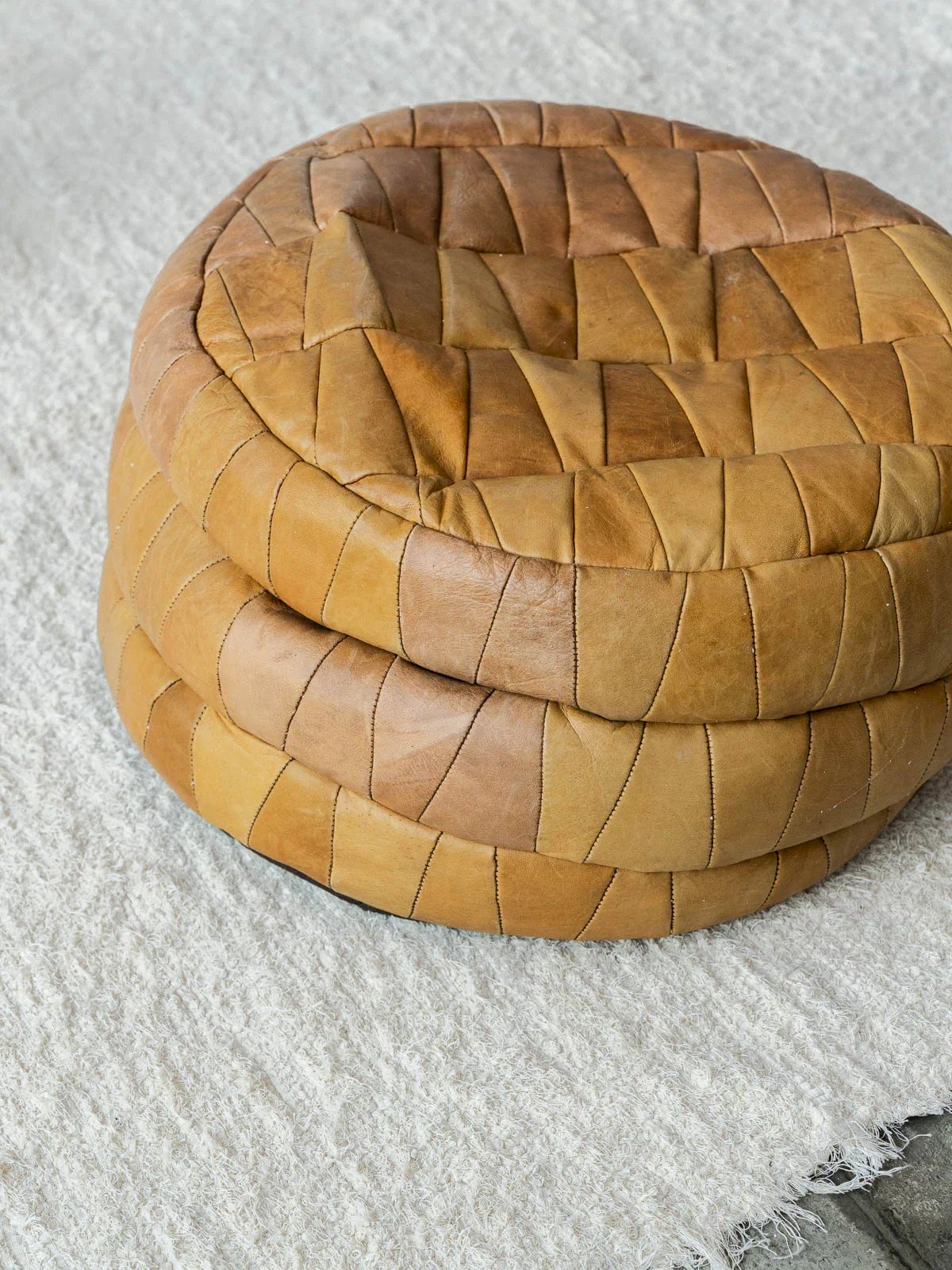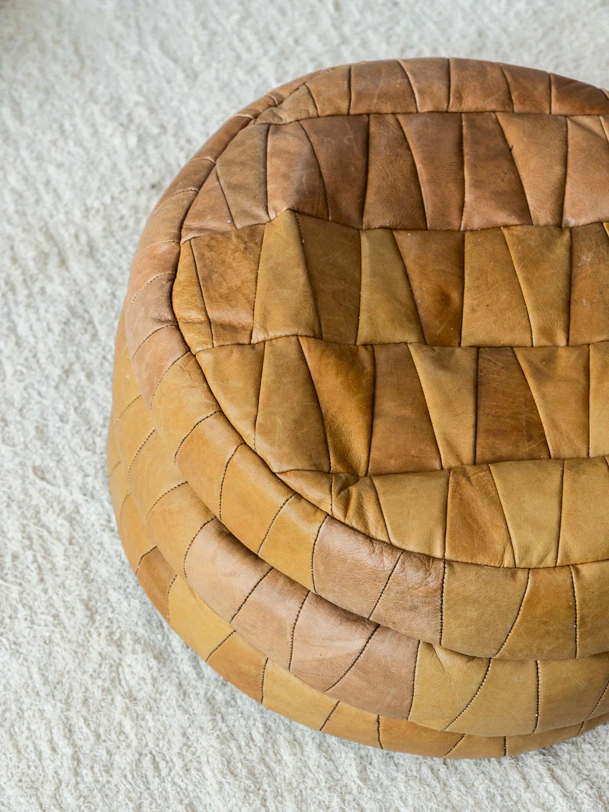 Discover our camel-colored leather pouf, attributed to De Sede, combining elegance and comfort. Its meticulous design and clean lines make it a perfect addition to any modern interior. The density of the pouf can be adjusted by adding filling beads, offering customization according to your preferences. Bring a warm and stylish touch to your space with this one-of-a-kind pouf. Height: 23 cm Diameter: 47 cm Condition: Used: Item that has been used. Item showing some superficial signs of wear,... Used: Item that has been used. Item showing some superficial signs of wear, fully operational and functioning correctly. It may be a demonstration model or an item returned to the store after a short period of use, considering any possible imperfections. Color: Multicolor Height: Contemporary Width: Leather Length: Poufs Brand: Debongout Type: Thrifted product Material: Leather Style: Contemporary Assembly required: No Assembly level: Fully assembled