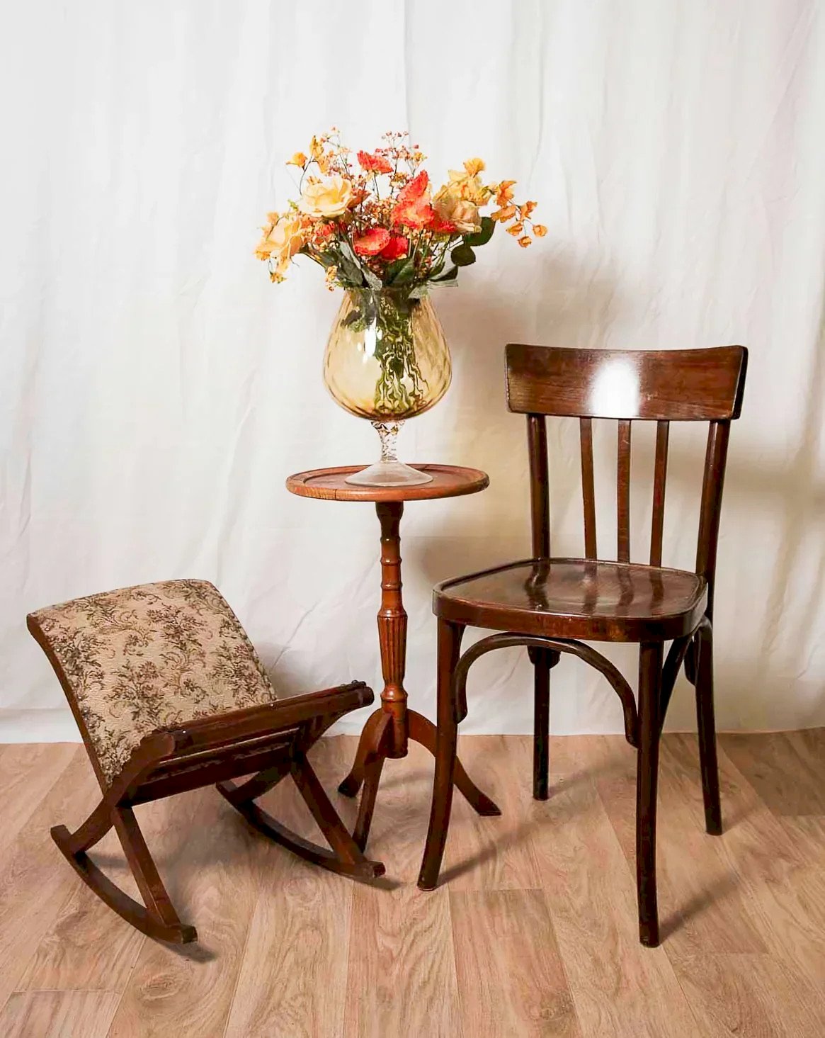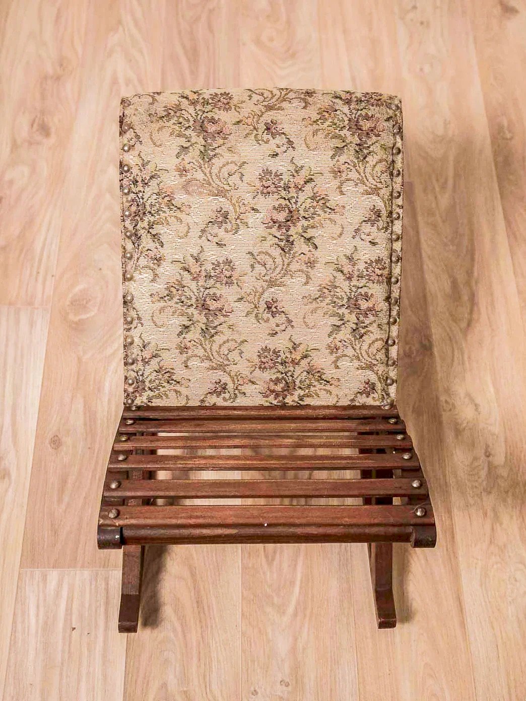 Discover this rocking footrest upholstered in a floral-patterned fabric, studded for a neat finish. Its wooden structure, accented with six rods, gives it a balanced silhouette and reliability. Compact in size, it invites a moment of softness by the fireplace, on an armchair or a lounge chair. The floral pattern adds a warm and authentic touch to the decor. Length: 53 cm Width: 33 cm Height: 40.5 cm Height from foot to ground before rocking: 31 cm Condition: Used item that has been previously used. Item showing some signs of superficial wear... Used item that has been previously used. Item showing some signs of superficial wear, fully operational and functioning correctly. It may be a display model or an item returned to the store after a short period of use. Any imperfections. Color: Multicolor Height: Contemporary Width: Wood, Fabric Length: Poufs Brand: Debongout Type: Vintage product Material: Wood, Fabric Style: Contemporary Assembly required: No Assembly level: Fully assembled