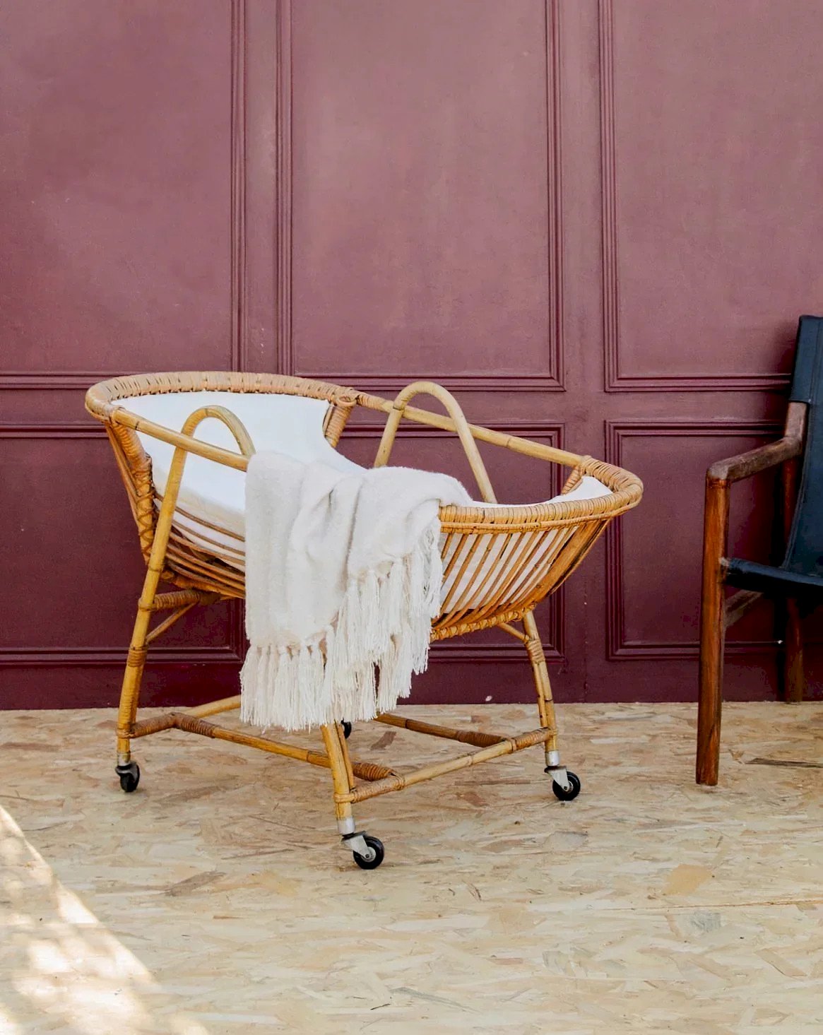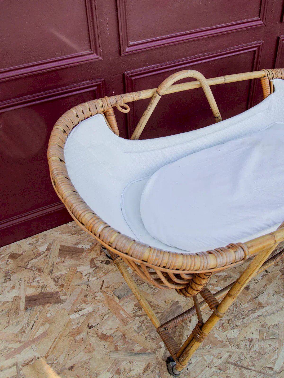 Discover our rattan cradle, featuring wheels for easy movement, accompanied by a comfortable mattress and an elegant white cover. Although it has a slight detachment of rattan, this does not affect its sturdiness. This bed is a vintage item for decorative use. It does not meet current safety standards (EN 716) and should not be used for infant sleeping. Length: 105 cm Width: 59 cm Height: 74 cm Inside the cradle: Length: 75 cm Width: 35 cm The mattress: Length: 67 cm Width: 35 cm Thickness: 6 cm Condition: Used: Item has been used. Item shows some superficial signs of wear, ...Used: Item has been used. Item shows some superficial signs of wear, fully operational and functioning correctly. It may be a demonstration model or a return item after a short period of use. any possible imperfections. Color: Multicolor Height: Rattan, Fabric Width: Beds and cradles Brand: Debongout Type: Vintage product Material: Rattan, Fabric Style: Country