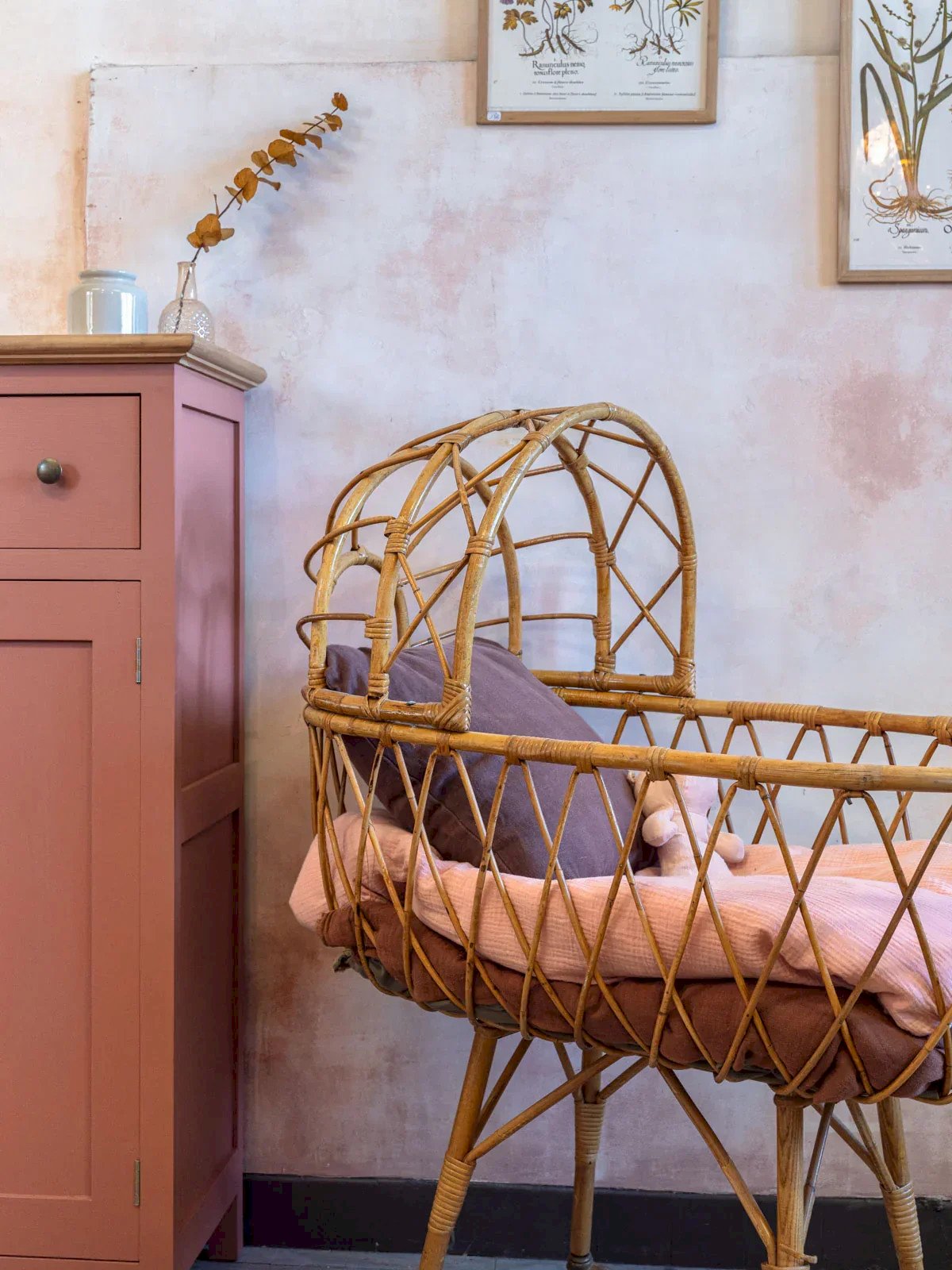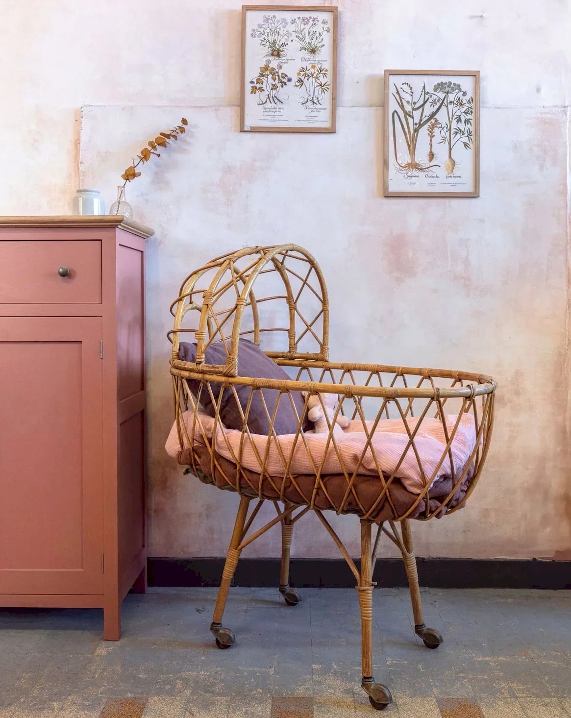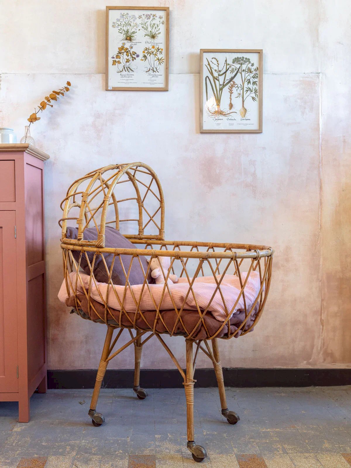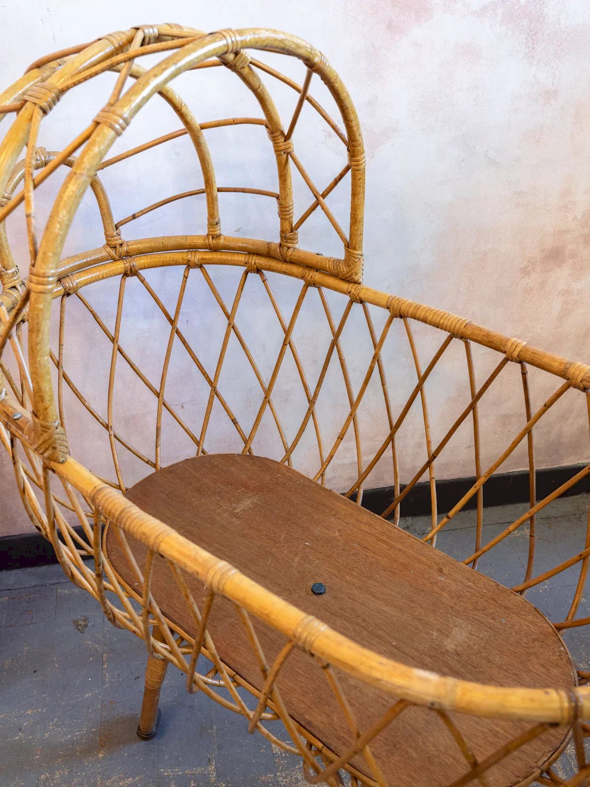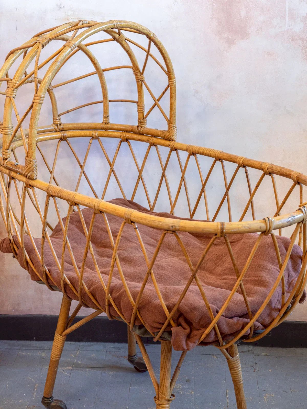 Discover this cradle that combines vintage aesthetics and functionality. A unique piece for lovers of vintage decor. This bed is a vintage item for decorative purposes. It does not meet current safety standards (EN 716) and should not be used for a baby's sleeping arrangements. Length: 95 cm Width: 52.5 cm Height: 112 cm Depth: 31.5 cm Condition: Used: Item that has been used. Item showing some superficial signs of wear, ...Used: Item that has been used. Item showing some superficial signs of wear, fully operational and functioning properly. It may be a demonstration model or an item returned to the store after a short period of use, with possible imperfections. Color: Multicolor Height: Rattan Width: Beds and cradles Brand: Debongout Type: Vintage product Material: Rattan Style: Country