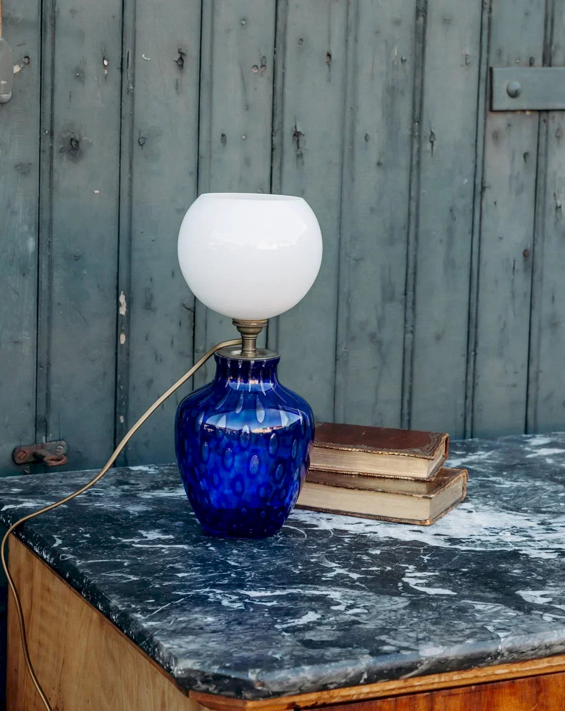 Add this small table lamp with a white globe and a blue glass base, reminiscent of the silhouette of a delicate vase. Its compact presence diffuses a soft light thanks to a small bayonet bulb, perfect for a bedside table, a reading nook, or a shelf. The combination of opaline glass and transparent blue creates a muted and poetic atmosphere, bringing warmth and simplicity to the decor. Its tall proportion makes it particularly suitable for small spaces. Height: 32 cm Diameter of the globe: 13 cm Condition: Used item: An item that has been used. Item showing some signs of superficial wear... Used item: An item that has been used. Item showing some signs of superficial wear, fully operational and functioning correctly. It may be a demonstration model or an item returned to the store after a short period of use. Any possible imperfections. Brand: Debongout Type: Vintage product Style: Contemporary Material: Glass Vintage: Yes