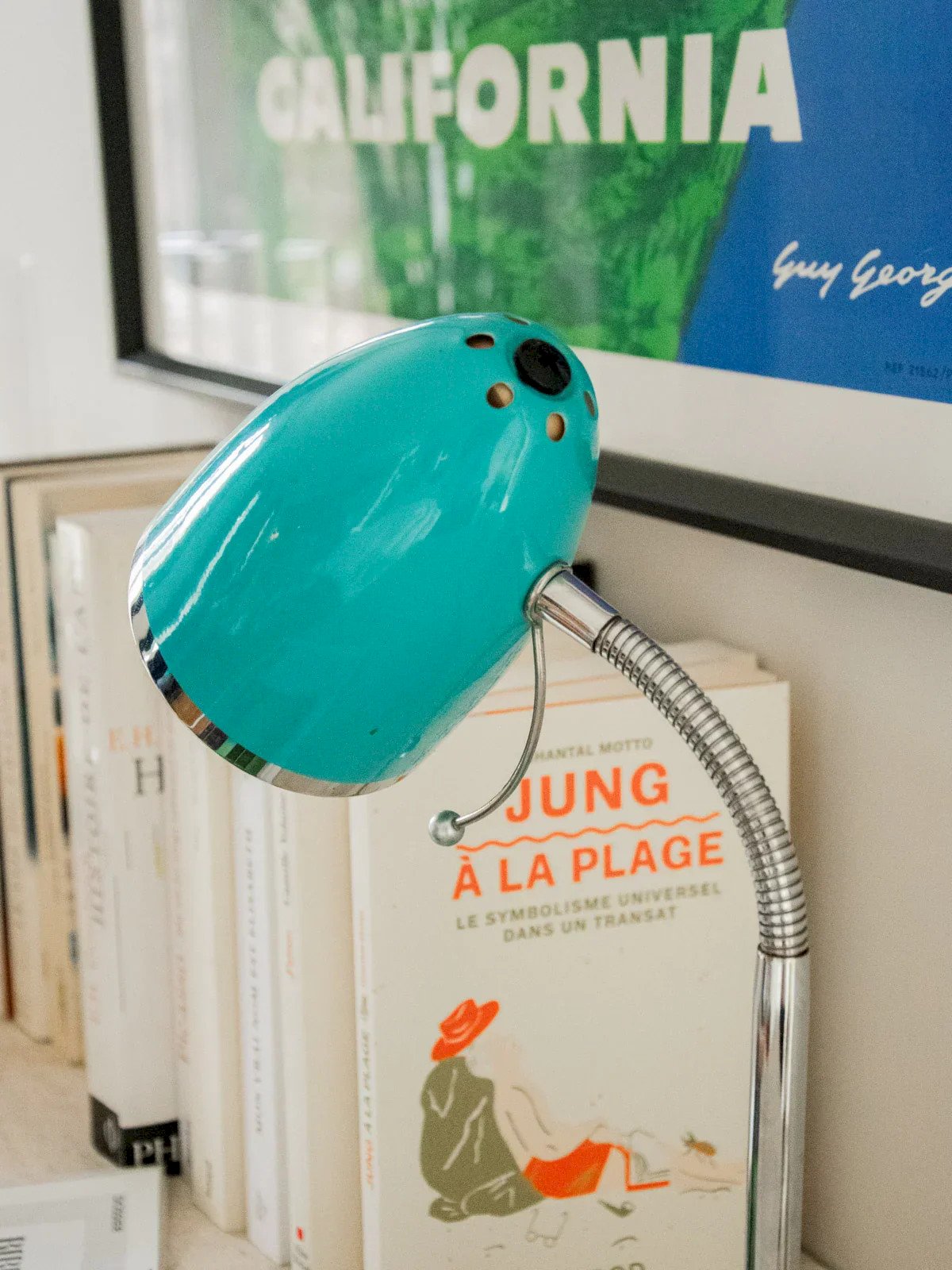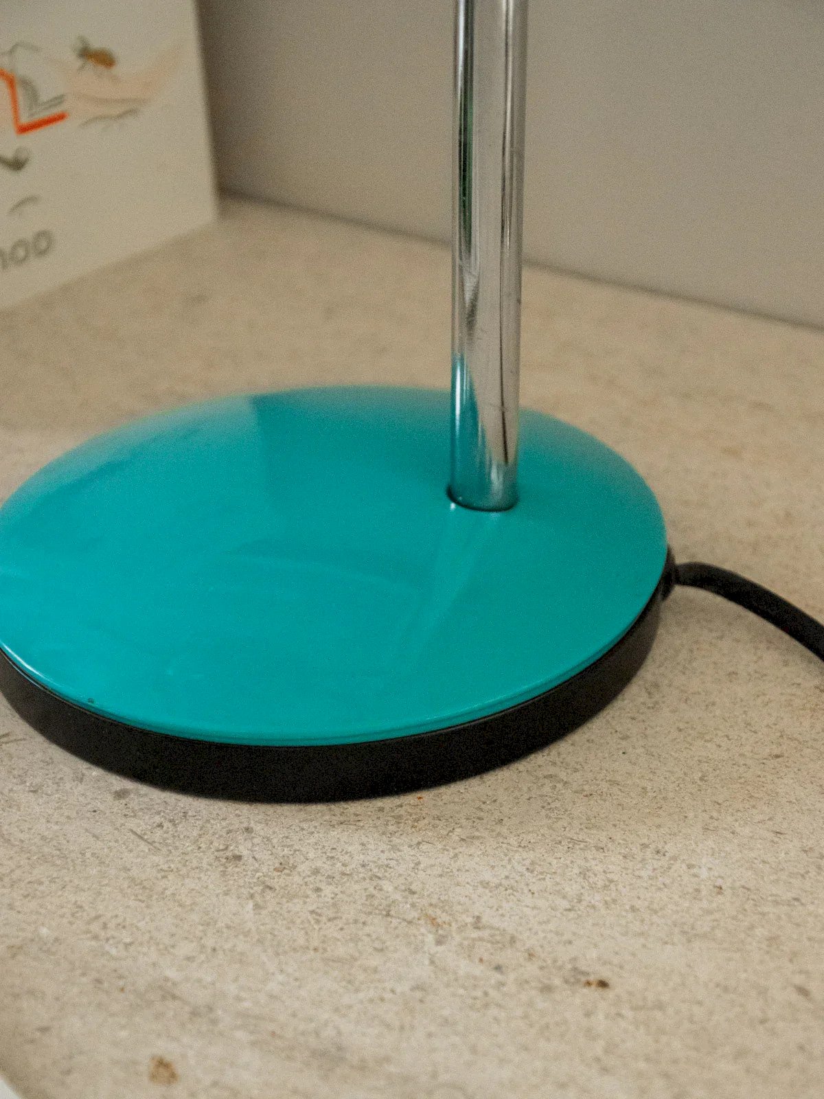 Discover this blue desk lamp with an adjustable metal arm, restored and ready to illuminate a workspace. Its black round base ensures stability, and its slender format easily fits on a desk, console, or bedside table. The large socket allows for the use of a filament bulb for warm, directional light. With a simple industrial style, it brings a studious and elegant atmosphere. Height: 40 cm Diameter: 14 cm Condition: Used: An item that has been used. The item shows some signs of superficial wear... Used: An item that has been used. The item shows some signs of superficial wear, fully operational and functioning correctly. It may be a demonstration model or an item returned to the store after a short period of use. Any potential imperfections. Brand: Debongout Type: Curated product Style: Contemporary Material: Metal Vintage: Yes