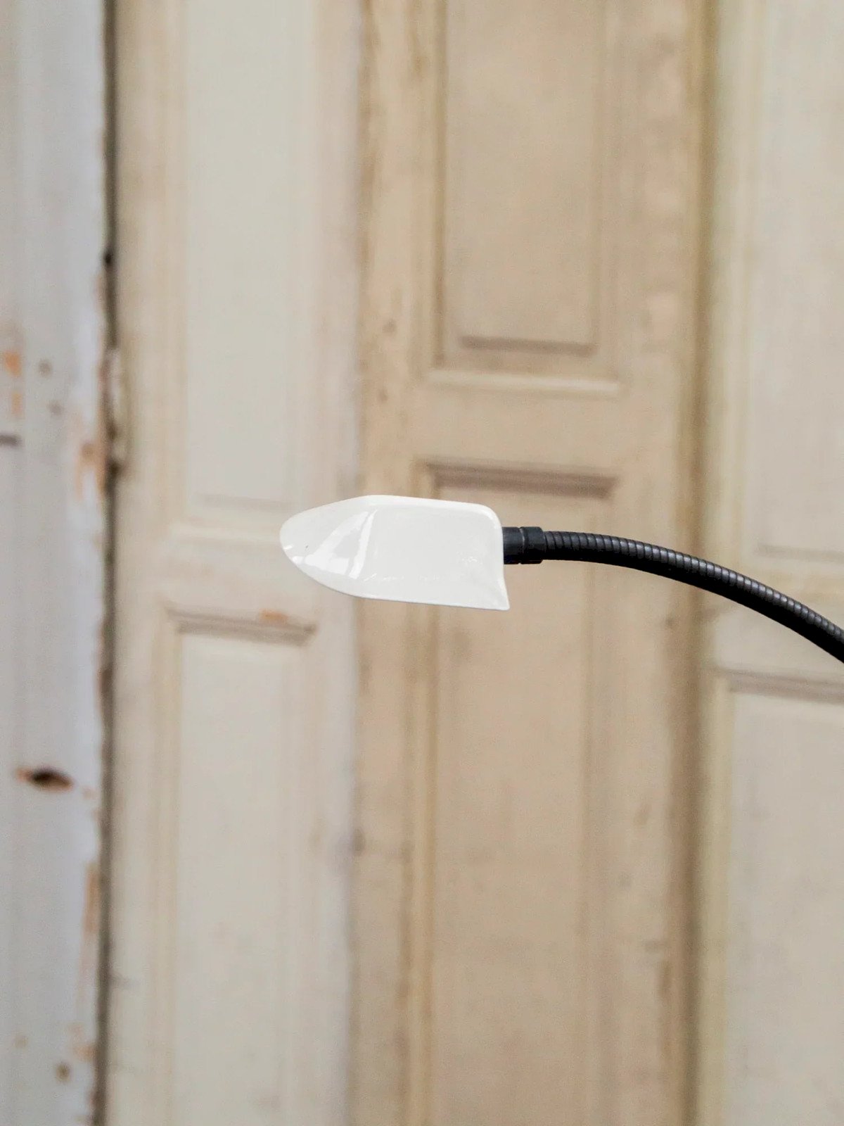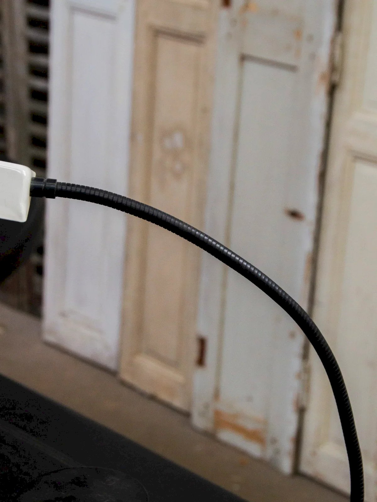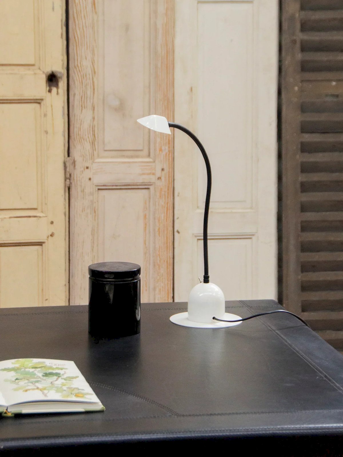 Adopt this white metal desk lamp with a sleek design and slender lines. Its adjustable arm allows you to direct a precise beam emitted by a delicate bulb, perfect for working or reading without cluttering your surface. The compact round base takes up little space while the discreet switch enhances its understated and contemporary look. It creates a warm and focused ambiance, ideal for a desk corner or bedside table. Height: 64 cm Diameter of the base: 15 cm Condition: Used: Item that has been used. Item showing some superficial signs of wear, fully operational and functioning correctly. It may be a demonstration model or an item returned to the store after a short period of use, including any possible imperfections. Brand: Debongout Type: Thrifted product Style: Contemporary Material: Metal Vintage: Yes