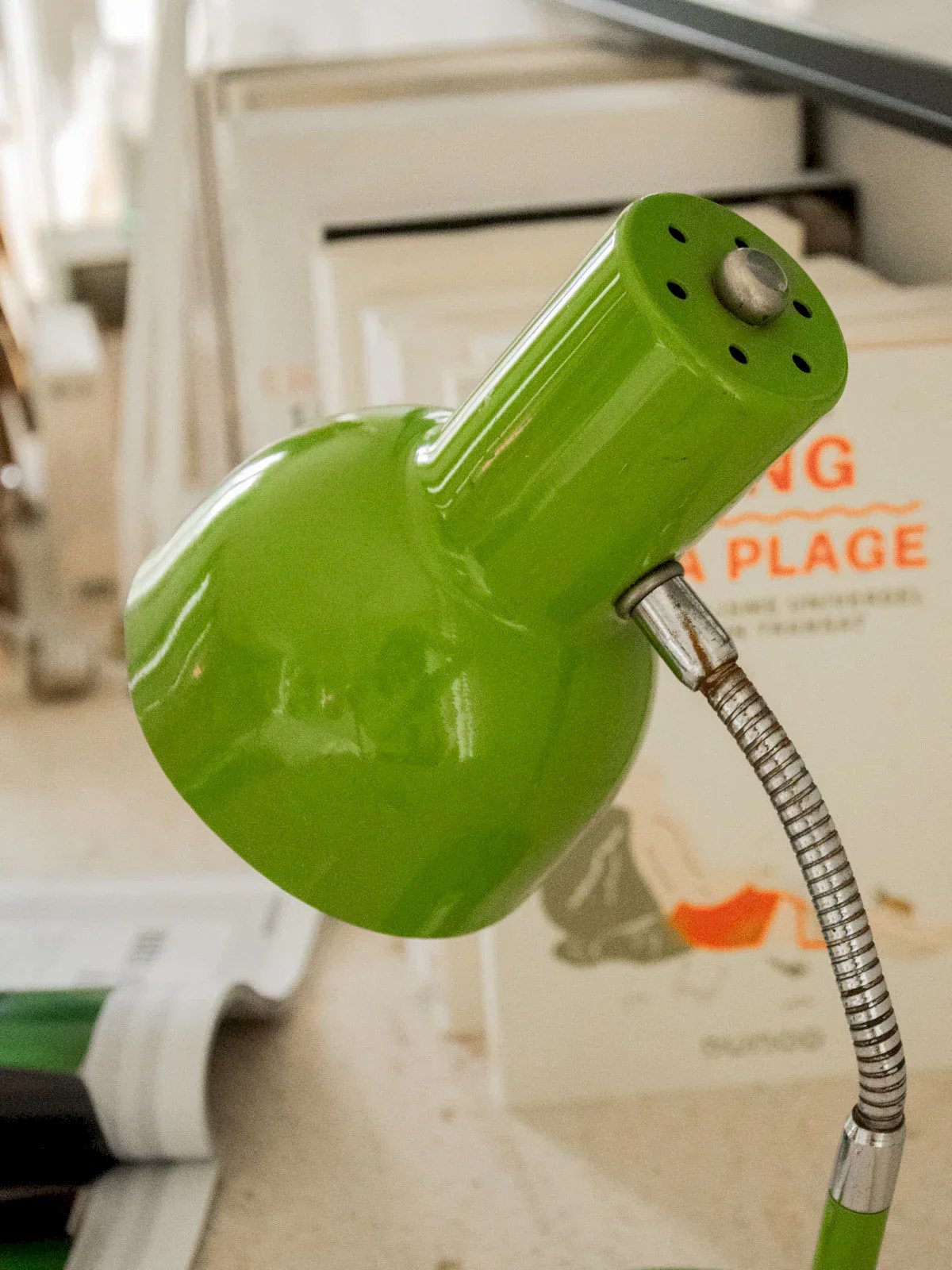 Bring a retro-chic touch to your desk with this green metal lamp with a removable arm, fully refurbished. Its compact size and round base ensure a stable presence without cluttering the space, while the articulated arm allows for precise lighting aimed at reading or working. Compatible with a small socket, it lights up via a discreet white switch on the base. Ideal for creating a warm and elegant work atmosphere. Height: 34 cm Diameter: 10 cm Condition: Used: Item that has been used. Item showing some superficial signs of wear... Used: Item that has been used. Item showing some superficial signs of wear, fully operational and functioning correctly. It may be a demonstration model or a product returned to store after a short period of use. Possible imperfections. Brand: Debongout Type: Vintage item Style: Contemporary Material: Metal Vintage: Yes