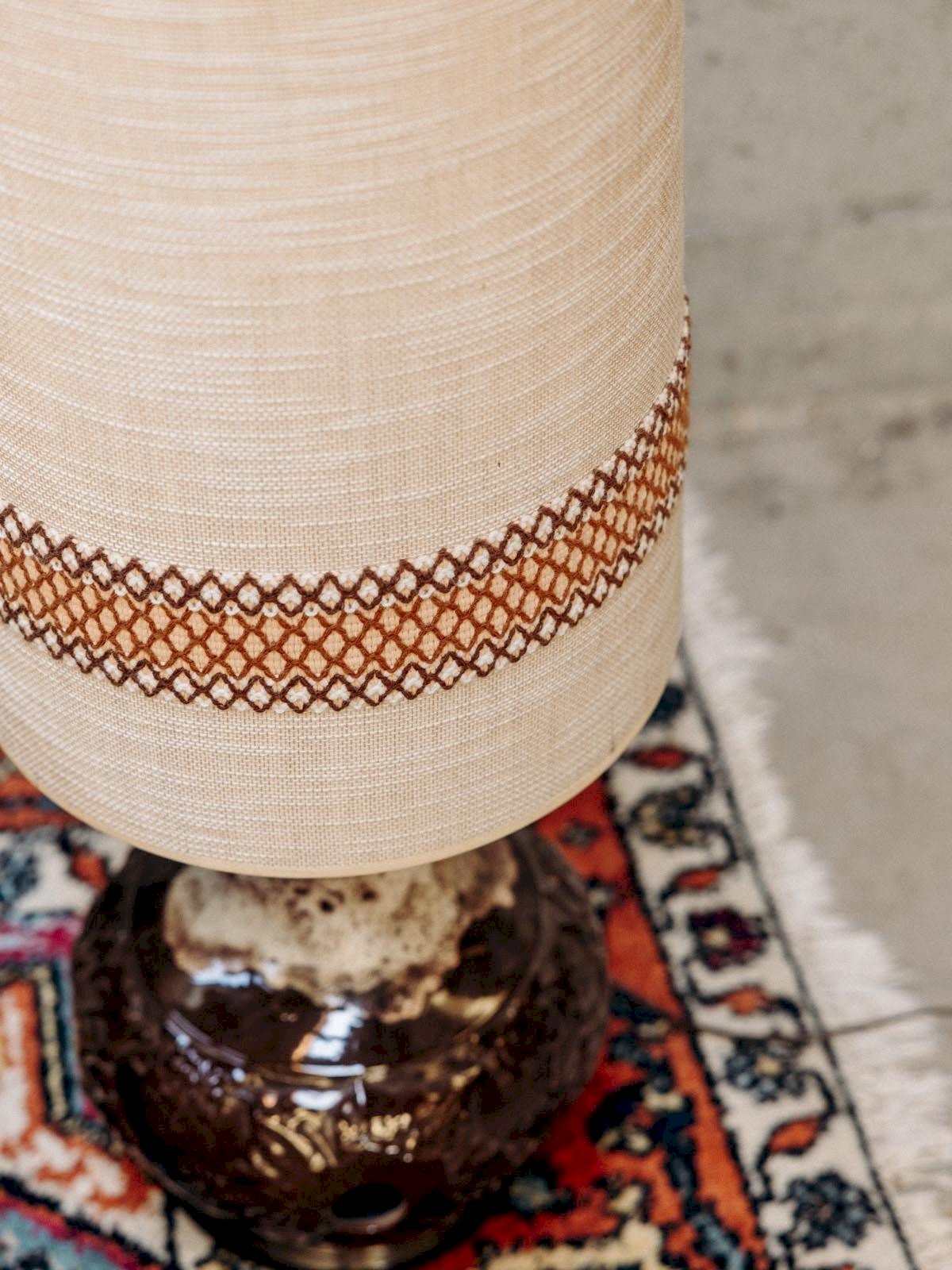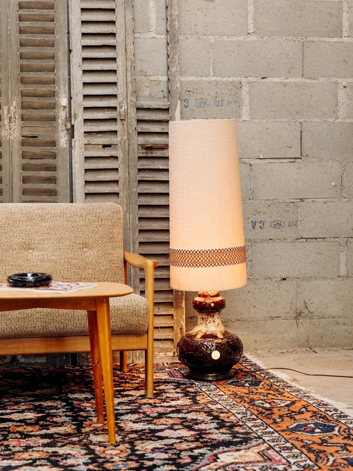 Discover our large table lamp, combining elegance and modernity. Its tall light fabric shade diffuses a soft and warm light, perfect for creating a friendly atmosphere in your interior. The ceramic base, adorned with decorative holes, adds an artistic touch while ensuring perfect stability. An element of decoration that will enhance your space with style and sophistication. Total height: 119 cm Base height: 50 cm Shade diameter: 35 cm Condition: Used item. Item has been used and shows some superficial signs of wear, fully operational and working correctly. It may be a demonstration model or an item returned to the store after a short period of use, with possible imperfections. Brand: Debongout Type: Vintage product: Yes Style: Contemporary