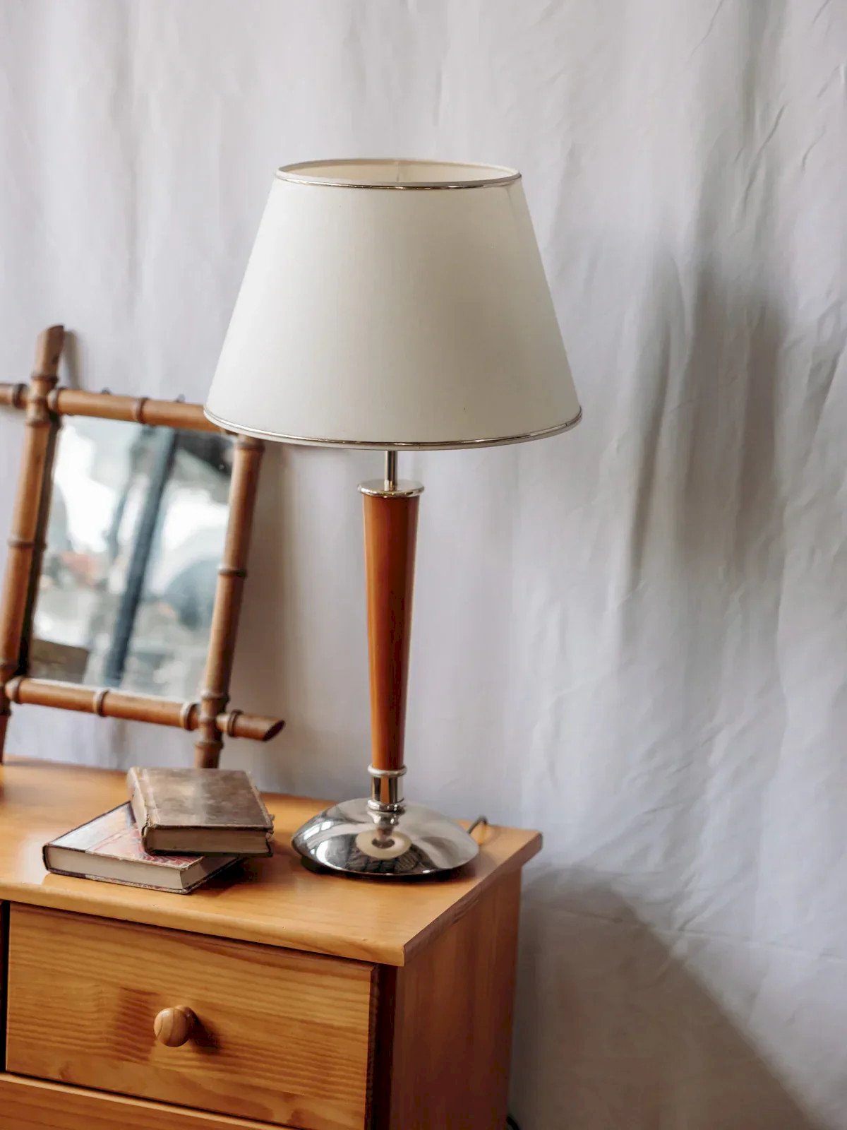Enhance your interior with this wooden lamp featuring a slender golden base and wood, along with a light lampshade that diffuses a soft and enveloping light; its tall silhouette and the balance of materials — natural wood and golden metal — bring a contemporary and refined touch, perfect for a bedside table or a reading corner, while the special bulb offers a warm luminous output. The tightening ring is slightly damaged. Height: 67 cm Diameter of the lampshade: 35 cm Condition: Used: Item that has been used. Item showing some superficial wear marks, fully operational and functioning correctly. It may be a demonstration model or an item returned to the store after a short period of use. Any possible imperfections. Brand: Debongout Type: Thrifted Product Style: Contemporary Material: Wood, Fabric Vintage: Yes