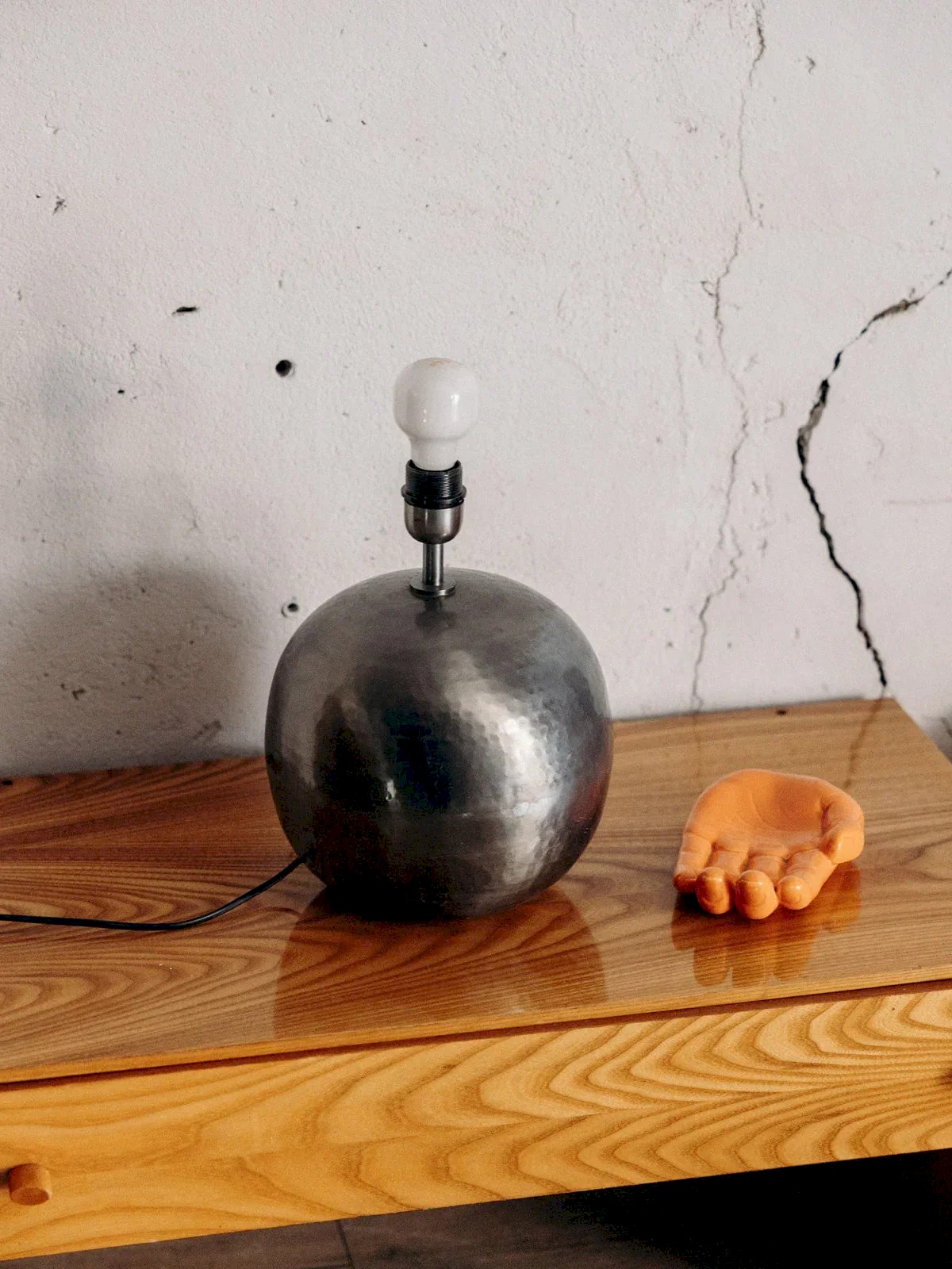 Bring a touch of modernity to your interior with this chrome footed apple-shaped table lamp. Its sleek and elegant design fits perfectly into all decoration styles while providing a warm source of light. Please note, this lamp is sold without a shade, allowing you to customize your lighting according to your desires. An ideal choice to illuminate your living spaces with originality and finesse. Height: 22 cm Diameter: 24 cm Condition: Used: Item that has been used. Item showing some superficial signs of wear... Used: Item that has been used. Item showing some superficial signs of wear, fully operational and working correctly. It may be a demonstration model or an item returned to the store after a short period of use. Any imperfections. Brand: Debongout Type: Thrifted product Style: Contemporary Material: Chrome Vintage: Yes