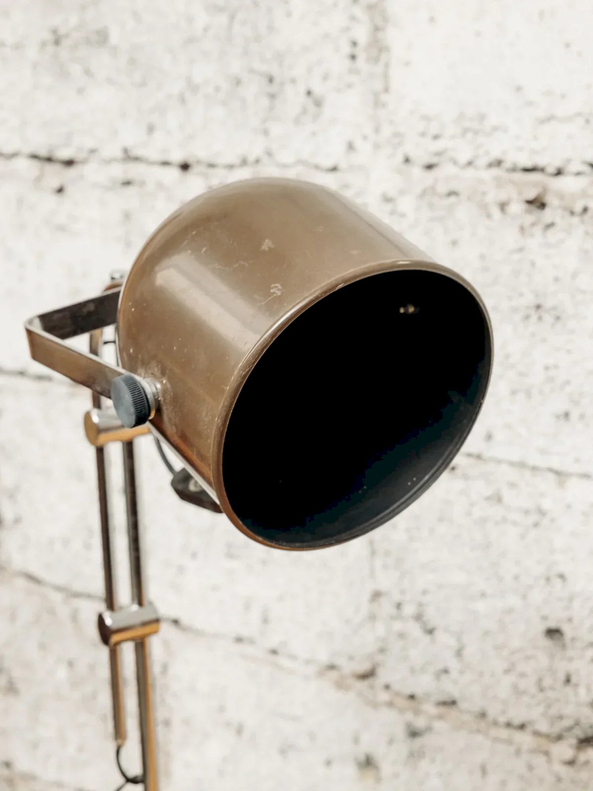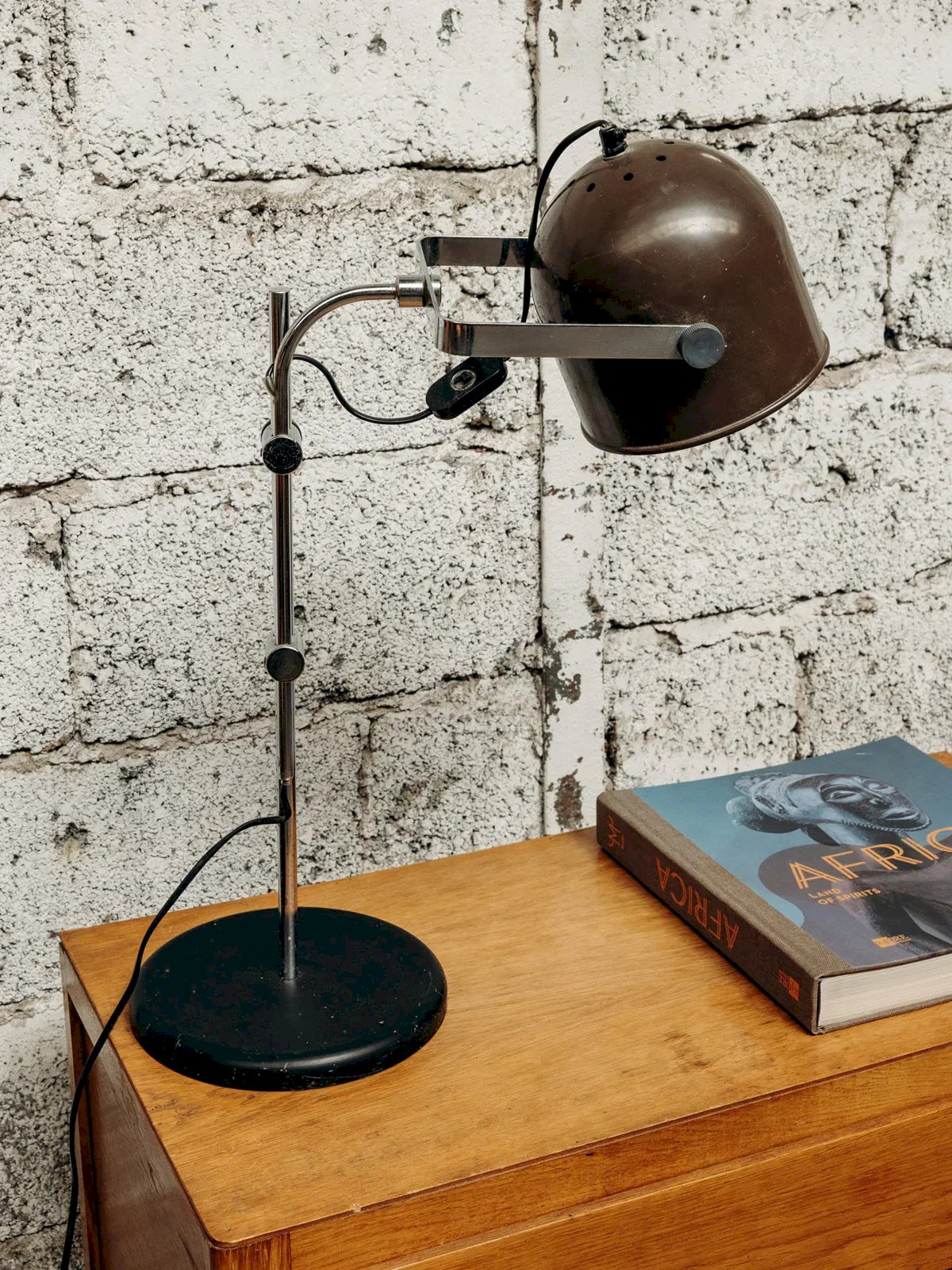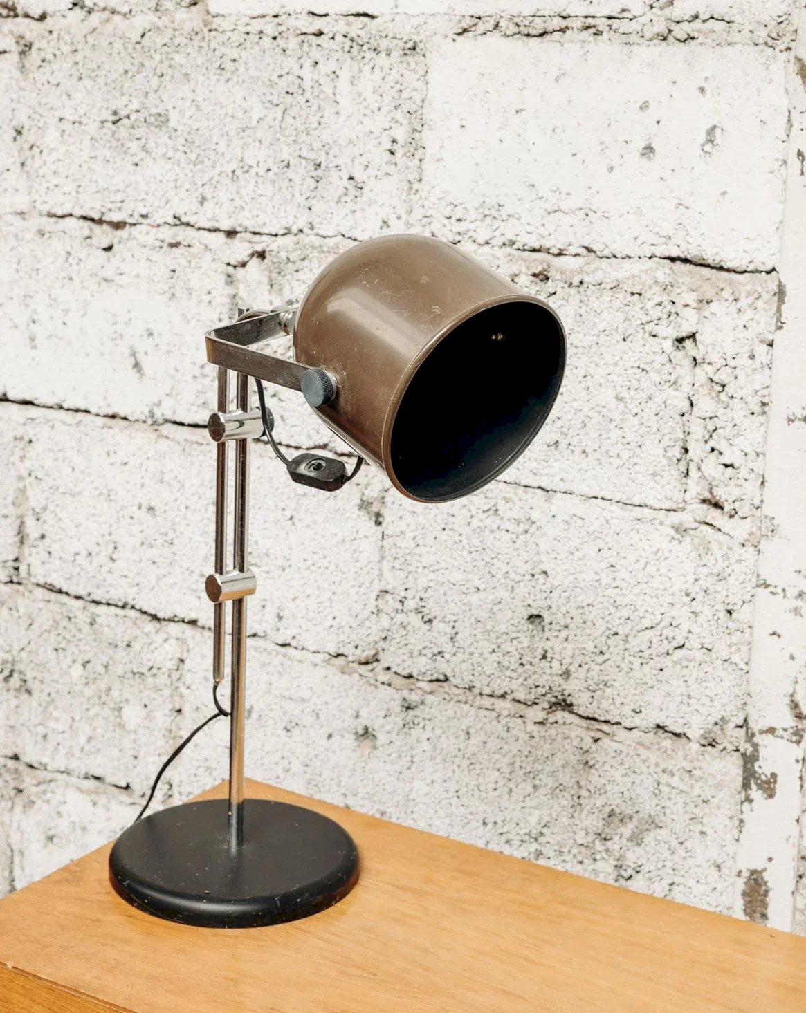 Discover this Swiss table lamp with a sleek and functional design, ideal for a desk or reading corner. Its adjustable chrome base allows you to tailor the lighting to your needs, while the black base and foot add a touch of sobriety. The brown metal lampshade adds a warm and modern note to the whole. Equipped with a practical switch, this lamp combines aesthetics and functionality. A perfect choice for an elegant yet practical ambiance in your interior. Web exclusive, the meeting will take place at your home! Height: 60 Depth: 41 Base diameter: 21.5 Condition: Used: Item has been used. Item showing some signs of superficial wear, ... Used: Item has been used. Item showing some signs of superficial wear, fully operational and functioning correctly. It may be a demonstration model or an item returned to the store after a short period of use. any potential imperfections. Brand: Debongout Type: Vintage product Style: Contemporary Material: Metal Vintage: Yes