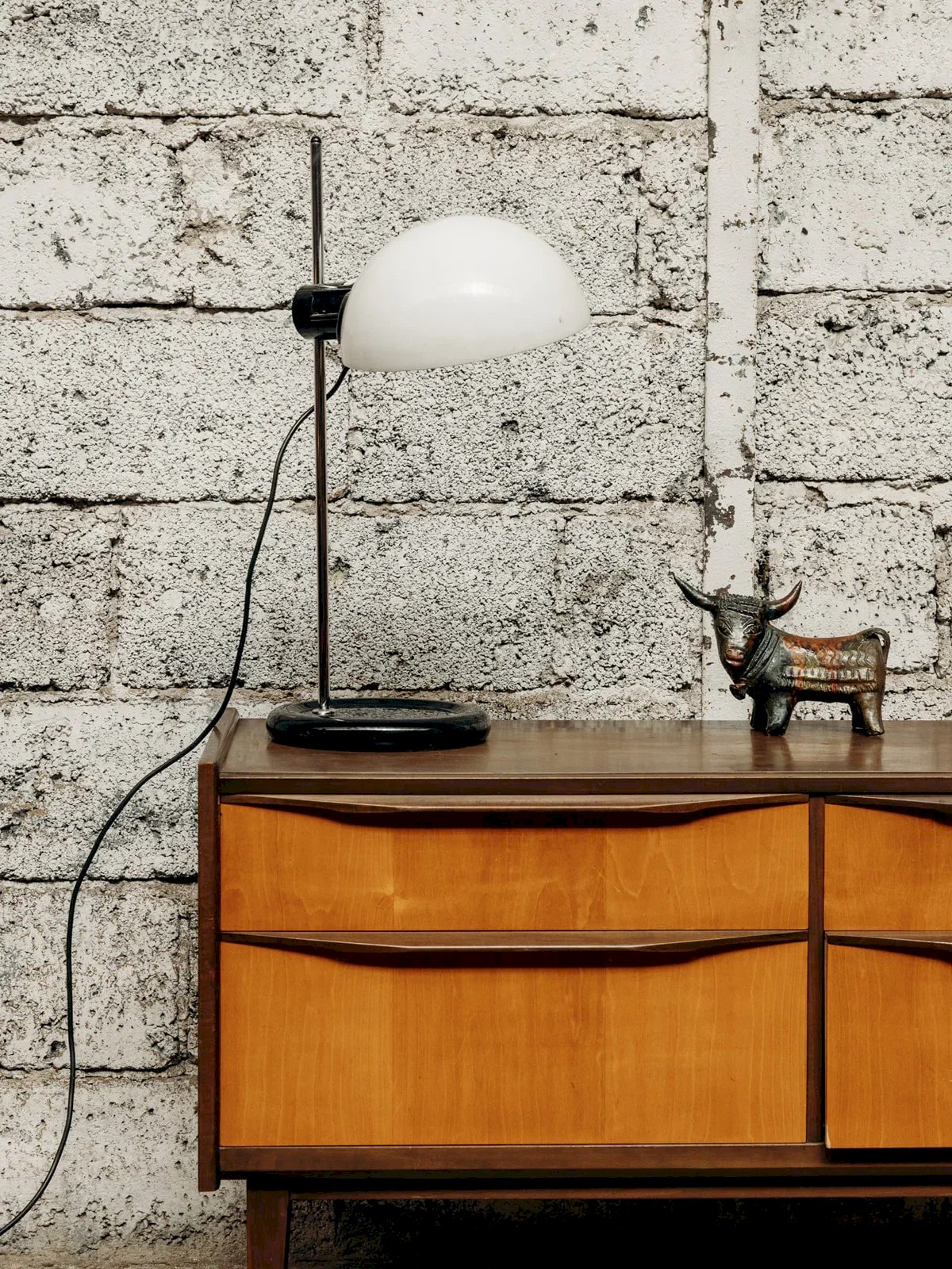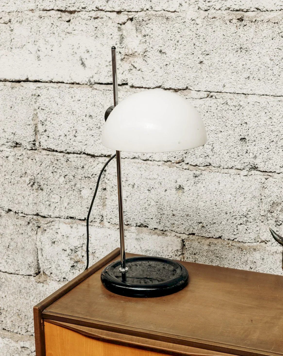Discover this lamp from the late 60s, produced by the prestigious Italian manufacturer Guzzini. Its white Plexiglas reflector diffuses a soft and pleasant light, while the stainless steel stem adds a touch of modernity and sturdiness. This sleek and elegant design is perfect for enhancing a desk or bedside table. A vintage piece, combining functionality and aesthetics, that fits perfectly into a contemporary interior. An ideal choice for lovers of retro and designer furniture. Online exclusive, the meeting will take place at your home! Length: 35 cm Height: 60 cm Depth: 35 cm Reflector diameter: 35 cm Base diameter: 23 cm Condition: Used: Item has been used. Item shows some superficial wear marks... Used: Item has been used. Item shows some superficial wear marks, fully operational and functioning correctly. It may be a demonstration model or an item returned to the store after a short period of use. any imperfections. Brand: Debongout Type: Curated Product Style: Contemporary Material: Plastic, Metal Vintage: Yes