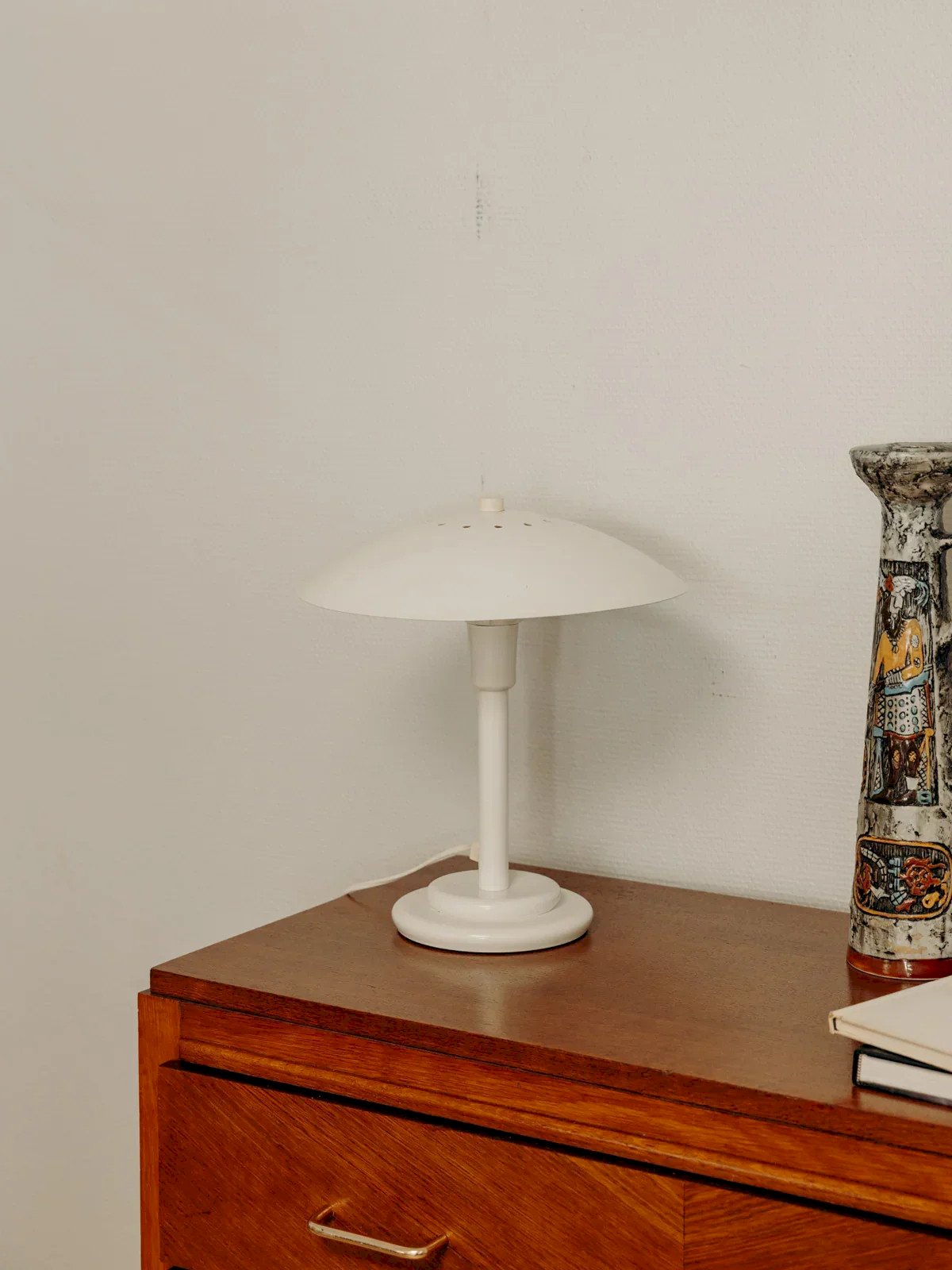 Discover this charming white Aluminor lamp, a true vintage treasure from the 70s-80s. Both elegant and timeless, this small matte white metal mushroom lamp adds a retro touch to your decor. Its condition is satisfactory with some signs of use, visible in the photos, but it retains all its charm. The electrification is in perfect condition, ready to illuminate your spaces with style. Length: 28 cm Width: 28 cm Height: 33 cm Condition: Used: Item that has been used. Item showing some superficial signs of wear, ...Used: Item that has been used. Item showing some superficial signs of wear, fully operational and functioning properly. It may be a demonstration model or an item returned to the store after a short period of use. any potential imperfections. Brand: Debongout Type: Thrifted product Style: Contemporary Material: Metal Vintage: Yes