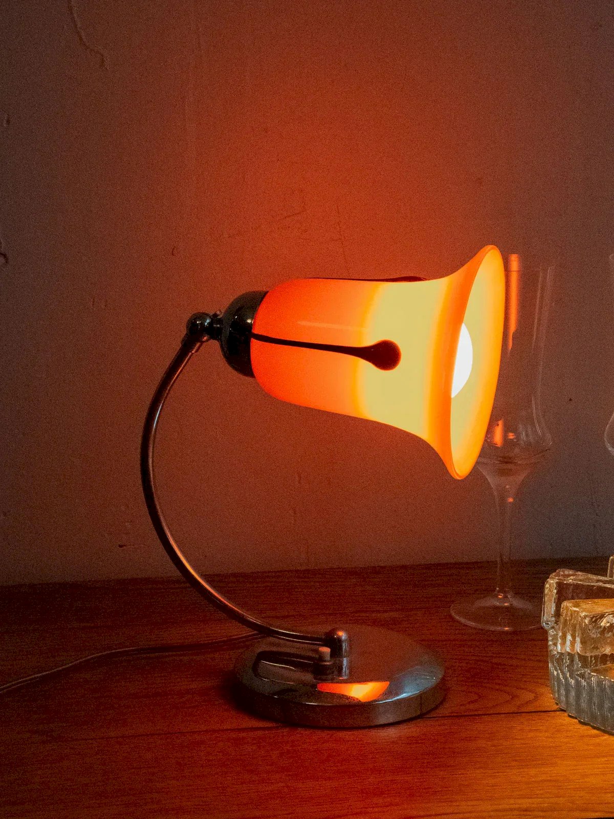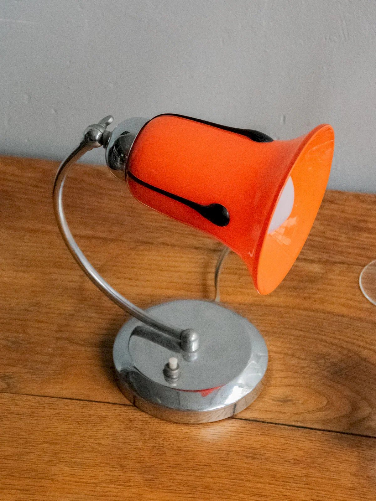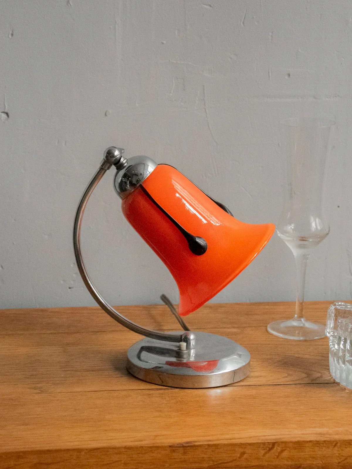 Add a bright and warm touch with this compact lamp featuring a metal base and tiltable orange glass globe. Its sleek design combines modern style with retro notes, while the push-button integrated into the base makes it easy to use daily. Compatible with an E27 bulb, it emits a soft light ideal for a bedside table, a desk, or a reading nook. Its discreet presence and well-proportioned design structure the ambiance without being imposing. Length: 26 cm Width: 13 cm Height: 26 cm Condition: Used: Item that has been used. Item showing some superficial wear marks, fully operational and functioning correctly. It may be a demonstration model or an item returned to the store after a short period of use, with possible imperfections. Brand: Debongout Type: Thrifted product Style: Contemporary Material: Metal, Glass Vintage: Yes
