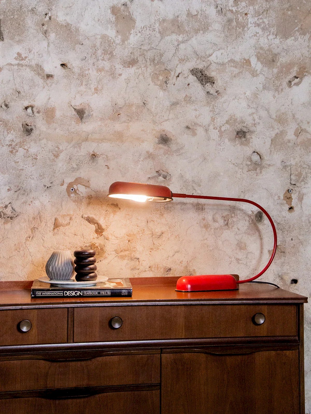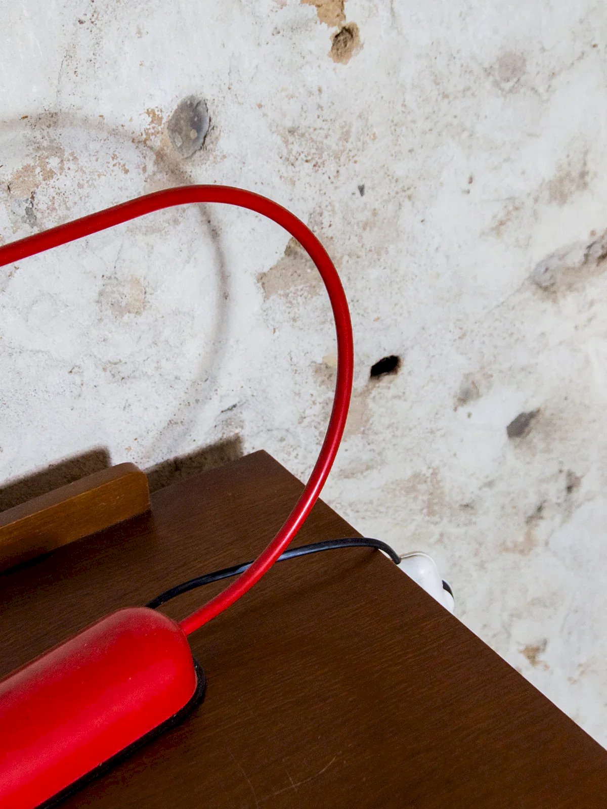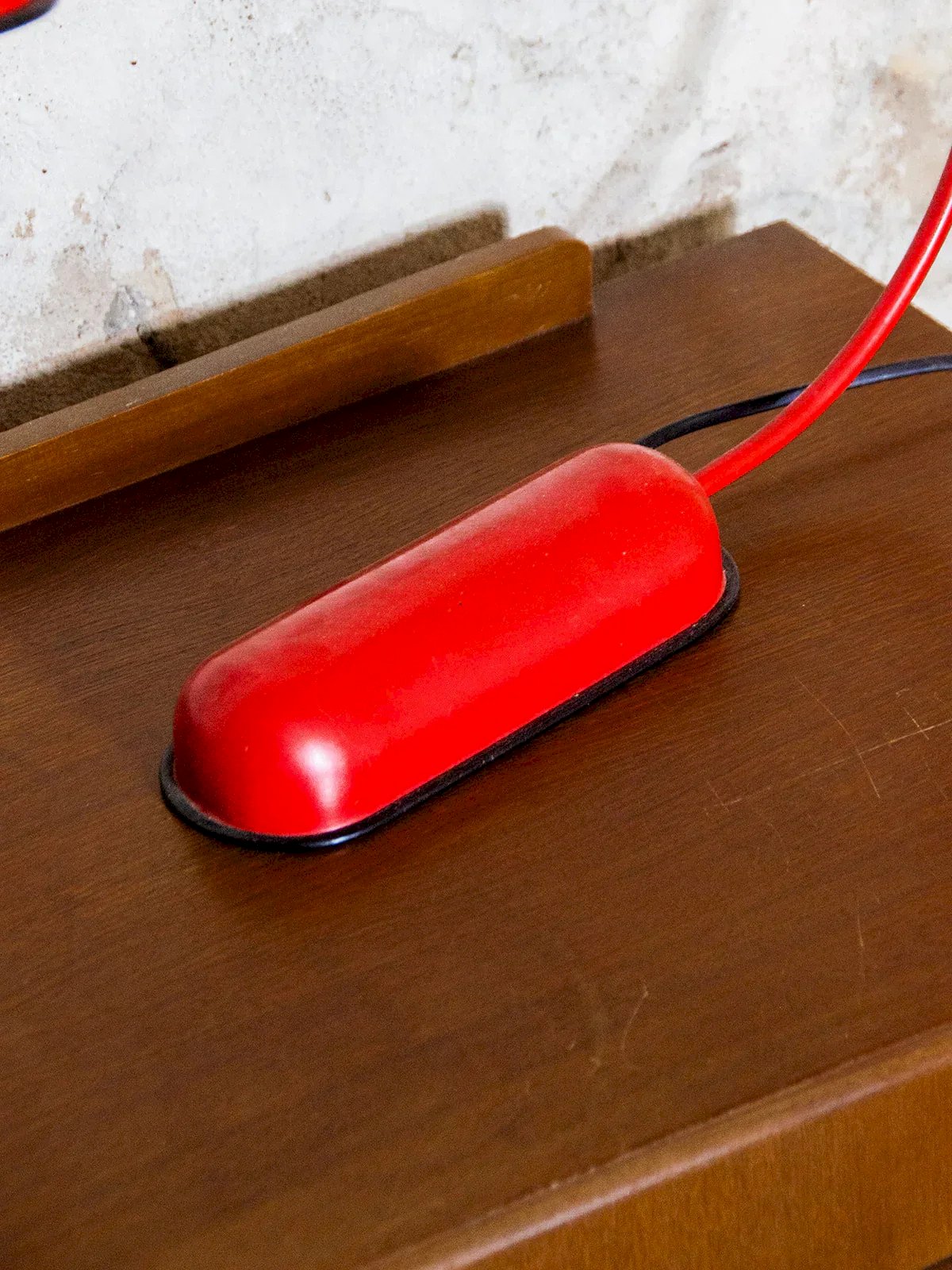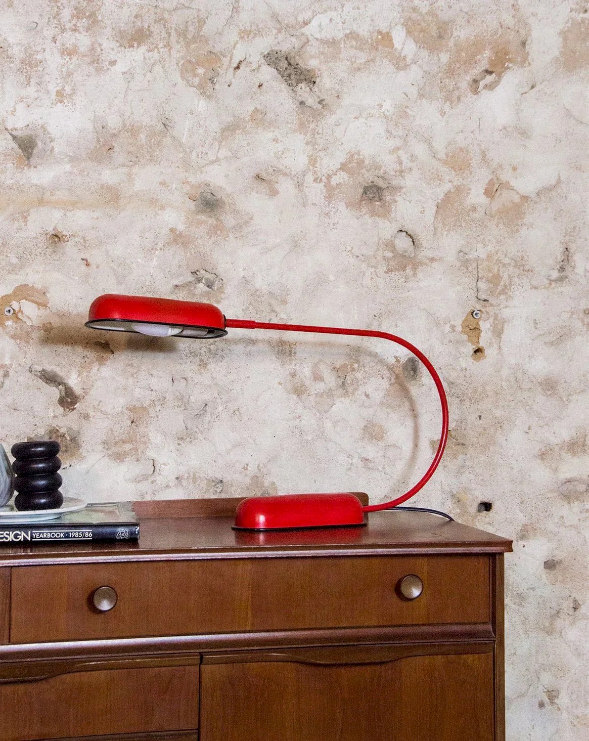 Discover this unique 80s desk lamp, made of two red metal tubes connected by a thin curved rod. Its silhouette brilliantly combines industrial aesthetics and minimalist elegance. Its directional lighting is ideal for a desk or reading table, providing targeted and effective light. An original piece that adds style and functionality to your workspace. Perfect for fans of retro and modern design. Length: 60 cm Width: 10 cm Height: 33 cm Condition: Used: Item that has been used. Item showing some signs of superficial wear, fully operational and functioning correctly. It may be a demonstration model or an item returned to the store after a short period of use, with possible imperfections. Brand: Debongout Type: Vintage find Style: Contemporary Material: Metal Vintage: Yes