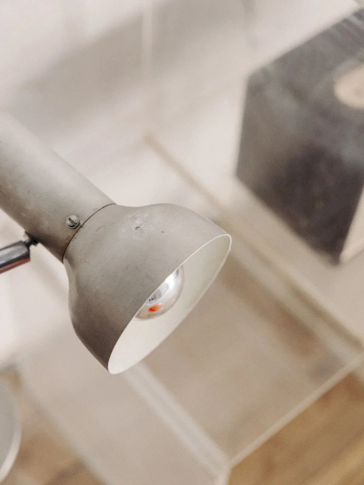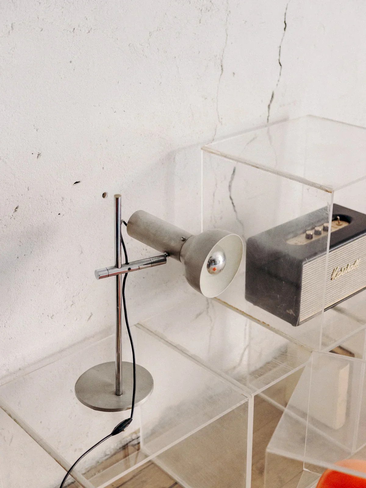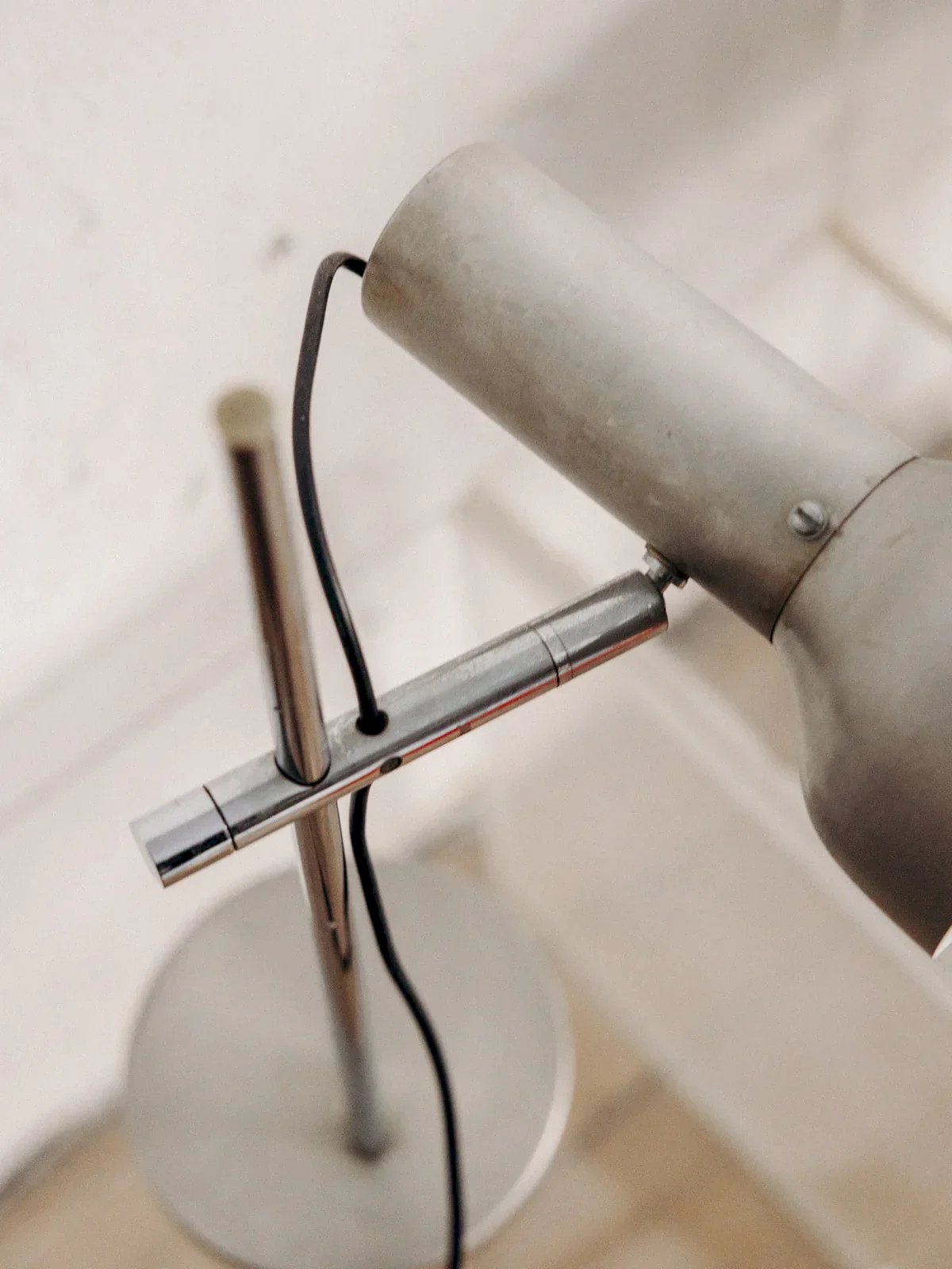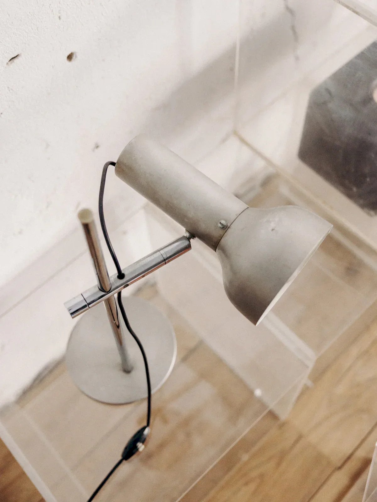 Add a touch of practicality to your workspace with this chrome desk lamp. Featuring a refined gray shade, it emits soft and pleasant light, perfect for long hours of reading or writing. Its contemporary design seamlessly fits into any decor style while providing an ideal functionality to illuminate your desk with style. A perfect choice to combine aesthetics and practicality. Height: 47 cm Diameter: 23 cm Condition: Used: Item has been used. Item shows some signs of superficial wear... Used: Item has been used. Item shows some signs of superficial wear, fully operational and functioning properly. It may be a demo model or an item returned to the store after a short period of use with potential imperfections. Brand: Debongout Type: Thrifted product Style: Contemporary Material: Chrome Vintage: Yes