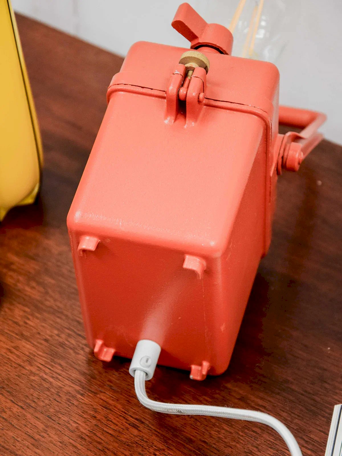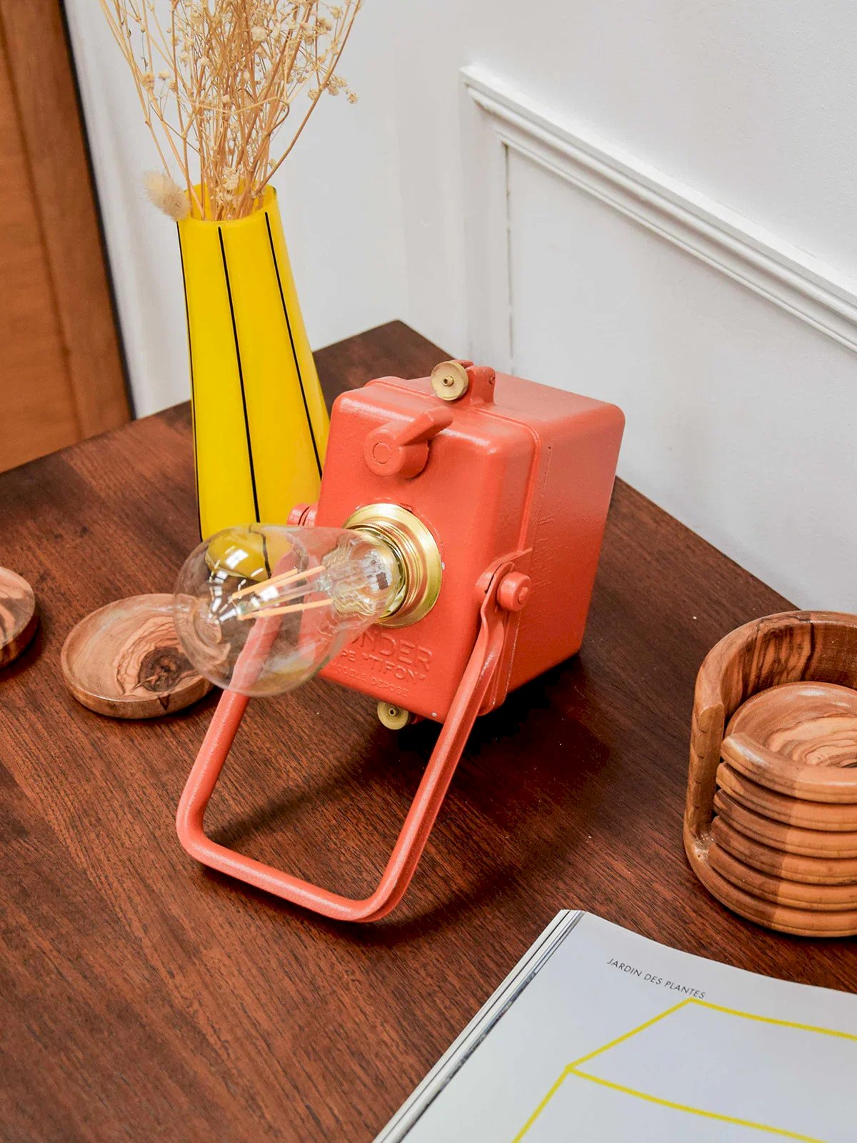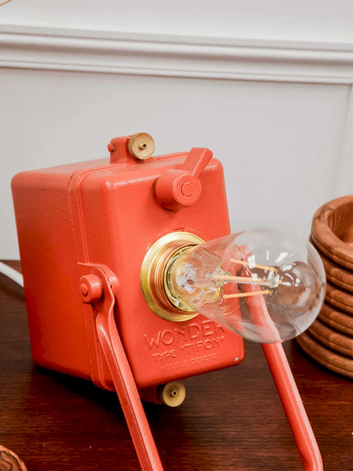 Bring an industrial and colorful touch to your interior with this Wonder lamp model Tiphon, restored in coral orange. A former flashlight once used by the SNCF, it stands out for its robustness and singular design. Fully renovated — sandblasted, repainted, varnished — it has now been transformed into an electrified ambient lamp. Perfect on a shelf, a desk, or as a bedside lamp. Each piece is unique, with its own history and character. Please note the bulb is not included. Length: 12 cm Height: 17 cm Depth: 17 cm Condition: Used: Item that has been utilized. Item showing some superficial signs of wear... Used: Item that has been utilized. Item showing some superficial signs of wear, fully operational and functioning correctly. It may be a display model or an item returned to the store after a short period of use. Any imperfections. Brand: Debongout Type: Vintage product Style: Contemporary Material: Metal Vintage: Yes