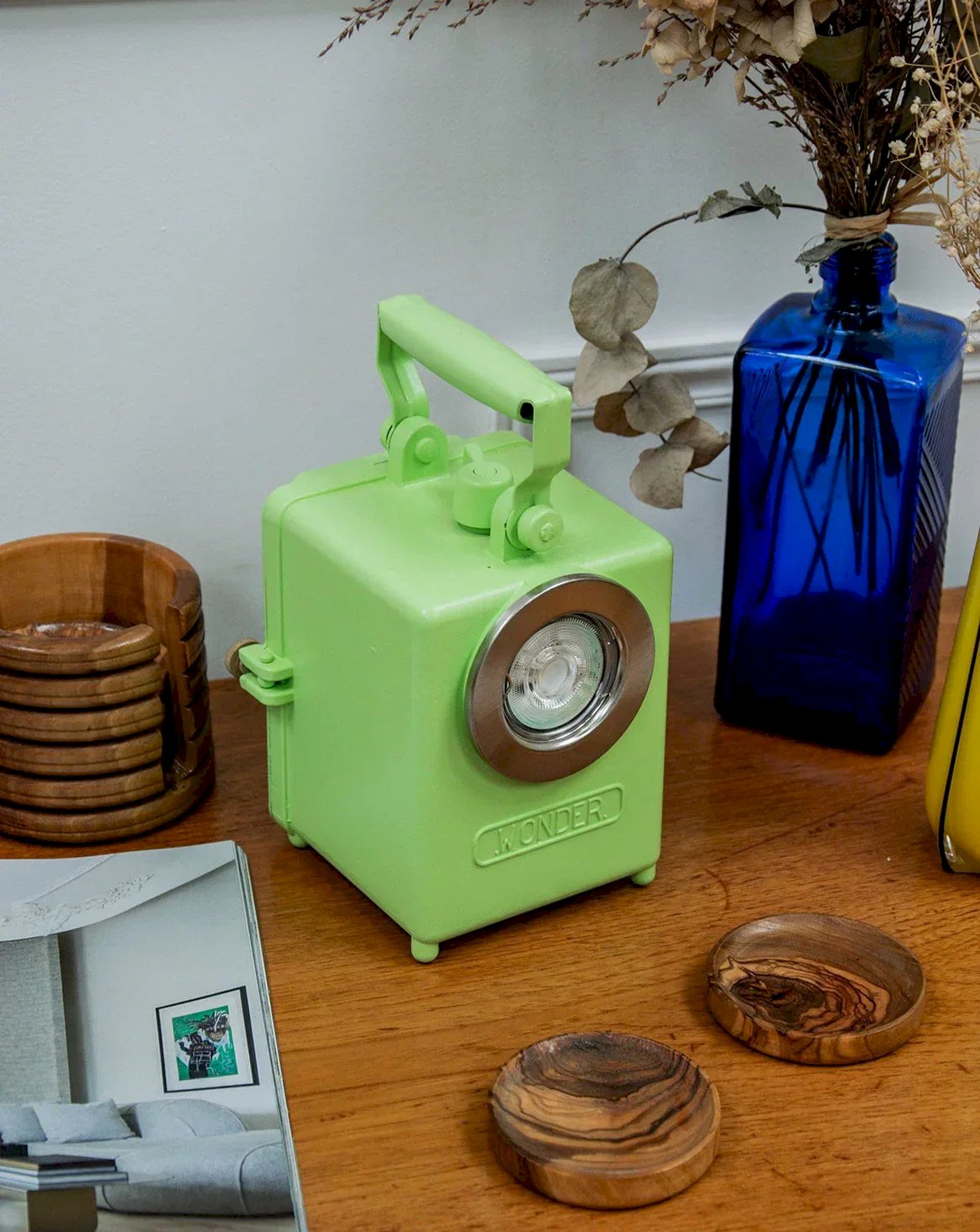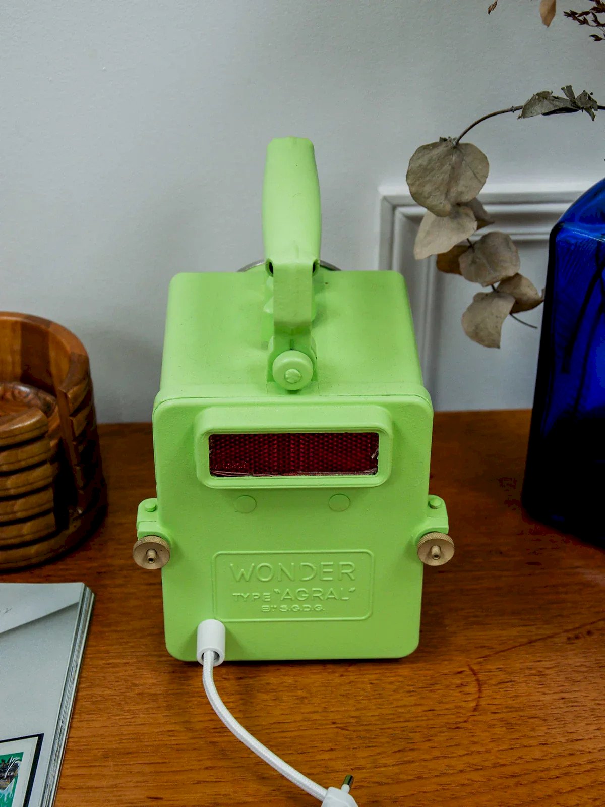 Discover this restored Agral model Wonder lamp, dressed in a lovely apple green. Initially designed as sturdy torch lamps for individuals and the SNCF, these pieces are known for their durability. After meticulous work of sandblasting, cleaning, and varnishing, we equipped it with an electrical system for use as an ambient lamp. Each model is unique, ready to illuminate your interior with charm and history. A true vintage piece revisited with care! Length: 12 cm Height: 17 cm Depth: 17 cm Condition: Used: Item that has been used. Item showing some superficial wear marks... Used: Item that has been used. Item showing some superficial wear marks, fully operational and functioning correctly. It may be a demonstration model or an item returned to the store after a short period of use. potential imperfections. Brand: Debongout Type: Thrifted product Style: Contemporary Material: Metal Vintage: Yes