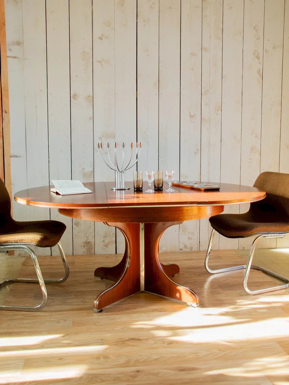 Invite friendliness and elegance with this butterfly table designed for 4 to 6 guests: its heavy stainless steel structure ensures stability and presence, while the rosewood veneer adds warmth and refinement. Its sliding extension easily unfolds to accommodate additional guests, making it ideal for a dining room or a flexible space where generous proportions make sense. A subtle shine in the veneer and some traces of time on the tabletop. Height: 75 cm Under-table height: 63.5 cm Diameter: 122 cm Width of extension: 50 cm Length with extension: 171.5 cm Condition: Used: Item that has been utilized. Item showing some superficial wear marks, ...Used: Item that has been utilized. Item showing some superficial wear marks, fully operational and functioning correctly. It may be a showroom model or an item returned to the store after a short period of use, with possible imperfections. Brand: Debongout Type: Vintage product Material: Wood, Brass Style: Contemporary Customized: Dining tables