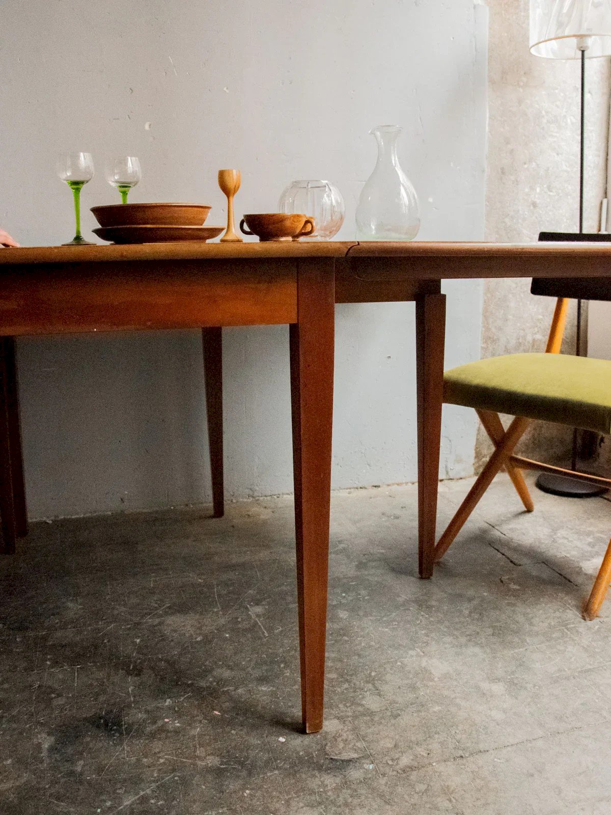 Discover this cherry wood dining table of American origin, featuring a warm grain and elegant silhouette. Its drop-leaves and four stable legs offer great modularity: when open, it comfortably seats six to eight guests, and when closed, it becomes more compact and practical for everyday use. The patinated wood creates a warm and refined atmosphere, ideal for shared meals or an interior with authentic charm. Light signs of wear are present. Fully open length: 184 cm Fully closed length: 61 cm Width: 110 cm Height: 76 cm Height under the tabletop: 74 cm Condition: Used item. Object that has been used. Object showing some superficial signs of wear, fully operational and functioning correctly. It may be a display model or an item returned to the store after a short period of use. Any potential imperfections. Brand: Debongout Type: Vintage item Material: Wood, Cherry Style: Contemporary Customizable: Dining tables.
