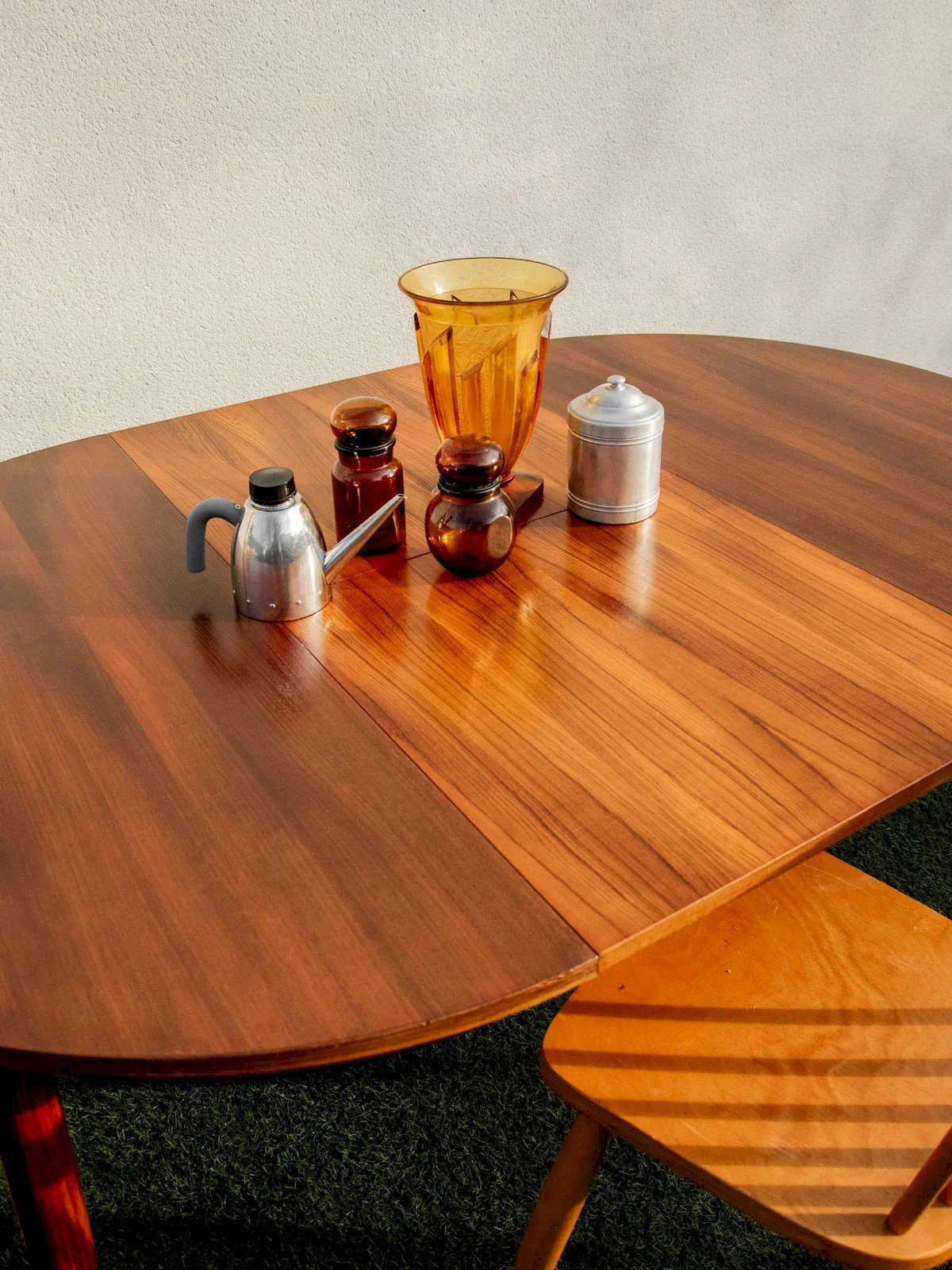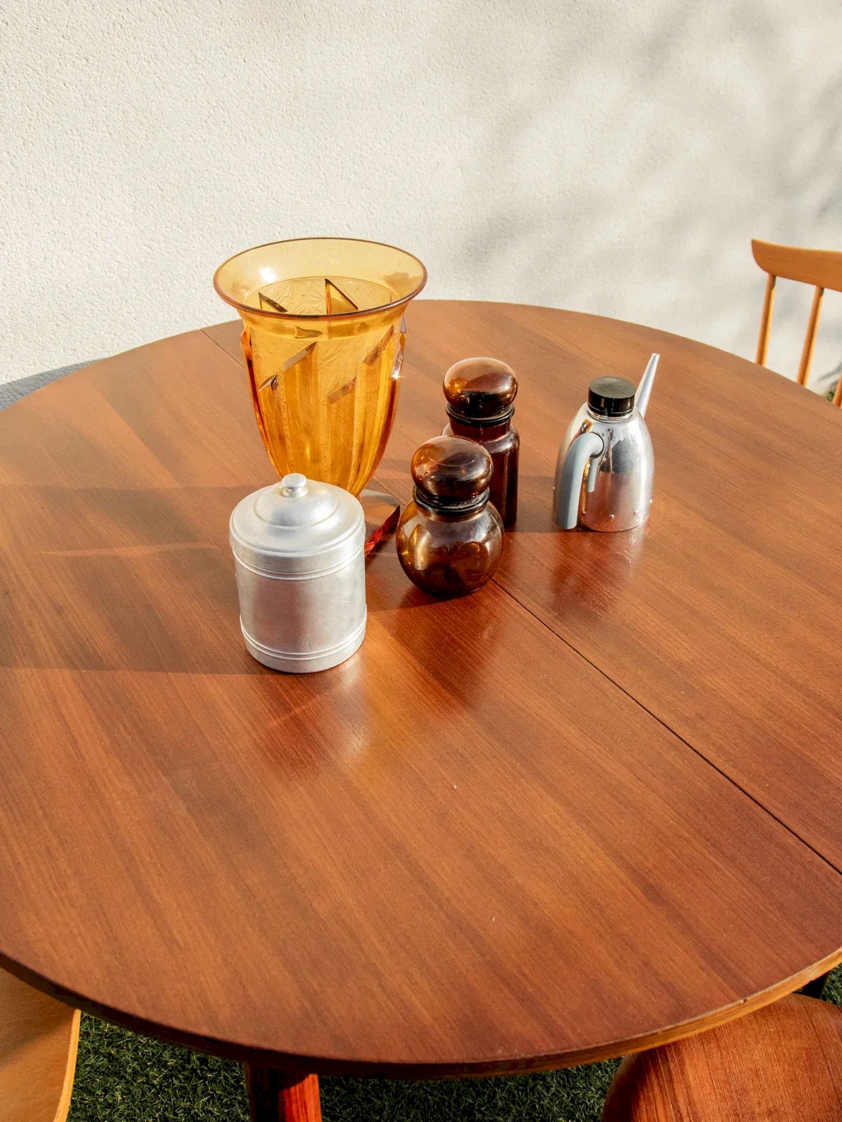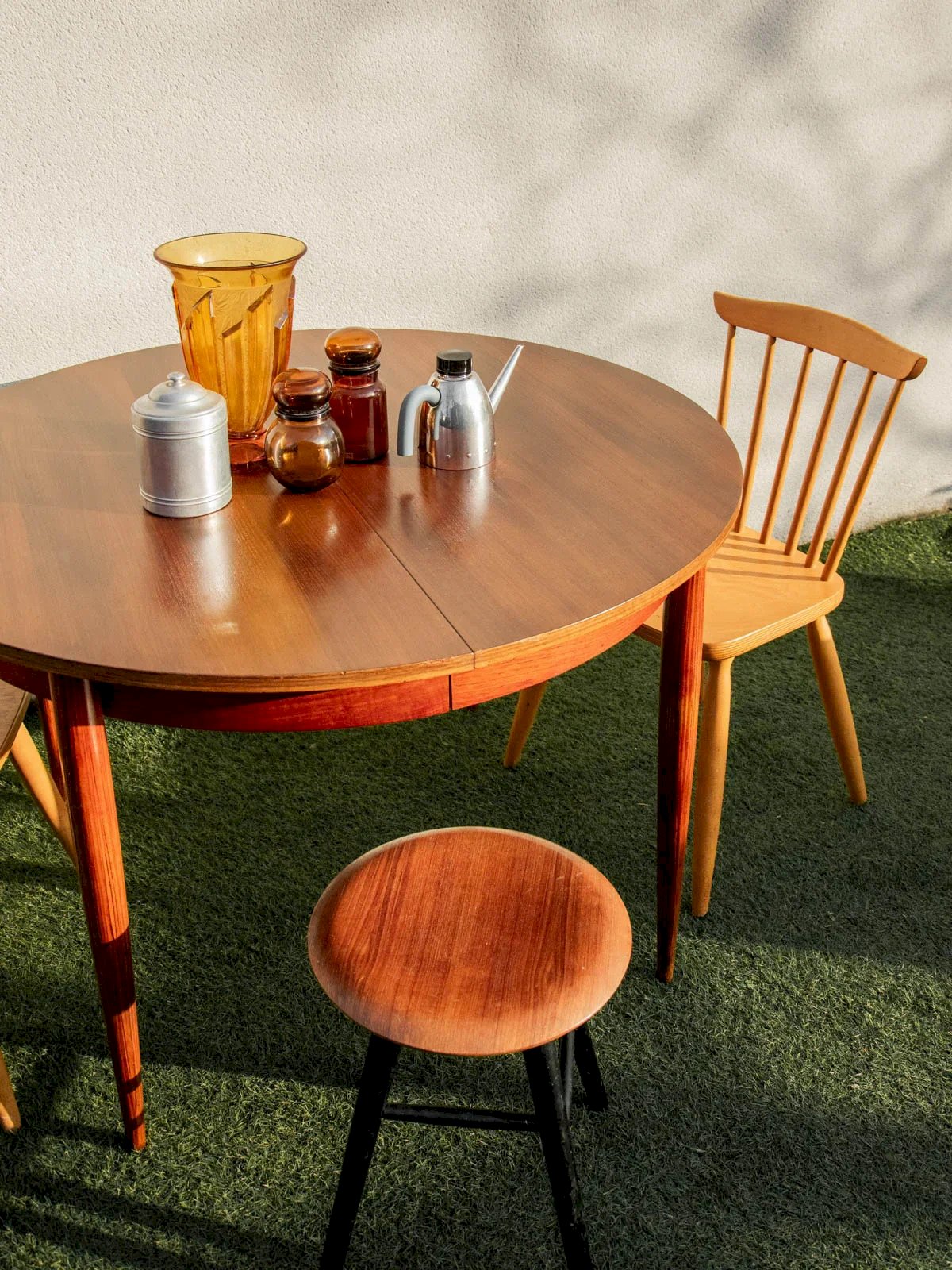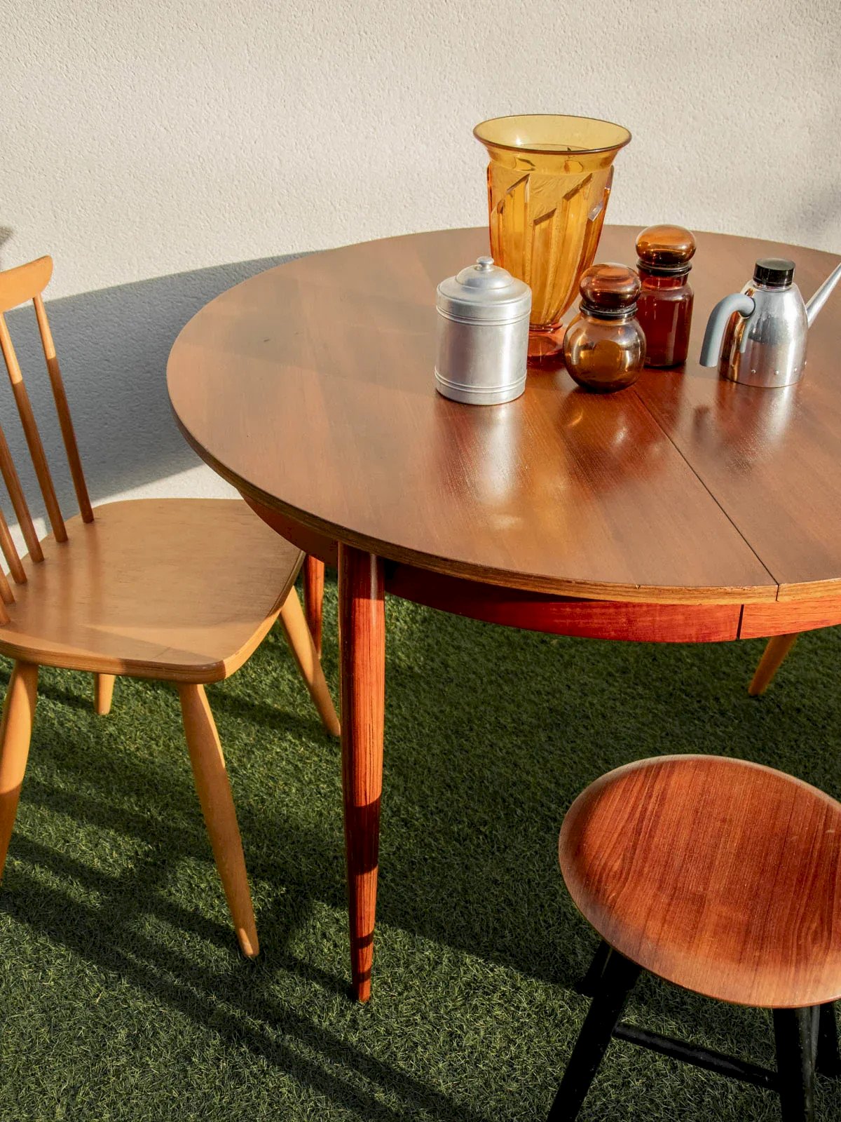 Offer your dining room this 1960s Scandinavian table in teak and rosewood, with organic curves and a refined look. Designed for four diners and extendable up to six thanks to its built-in butterfly extensions, it combines the warmth of exotic woods with a clean silhouette to create a friendly and elegant atmosphere. Discreet small dents visible on the edge. Diameter without extensions: 115 cm Length with extensions: 173 cm Width: 115 cm Height: 74 cm Height under the tabletop: 63 cm Condition: Used: Item has been used. Item shows some surface wear marks, fully operational and functioning correctly. It may be a display model or an item returned to the store after a short period of use. The possible imperfections. Brand: Debongout Type: Vintage product Material: Teak, Rosewood, Wood Style: Contemporary Customized: Dining tables