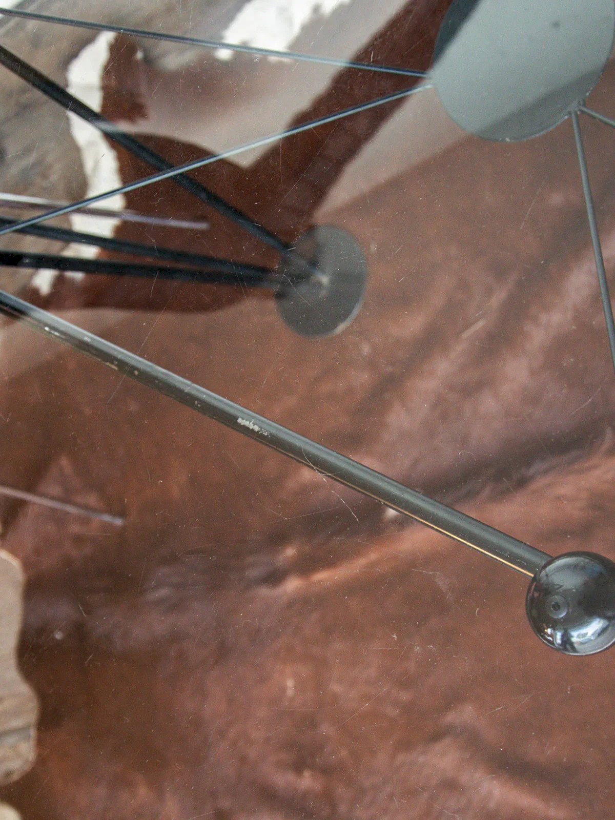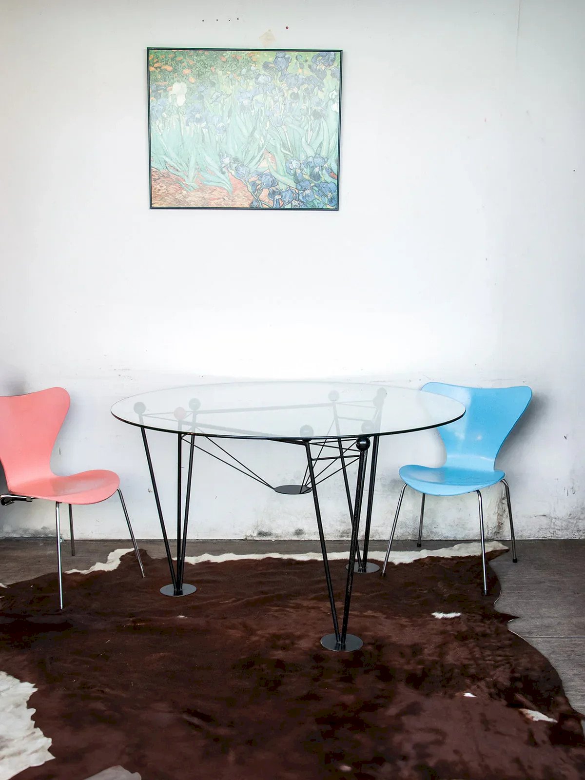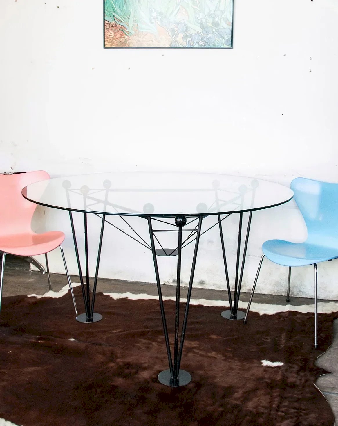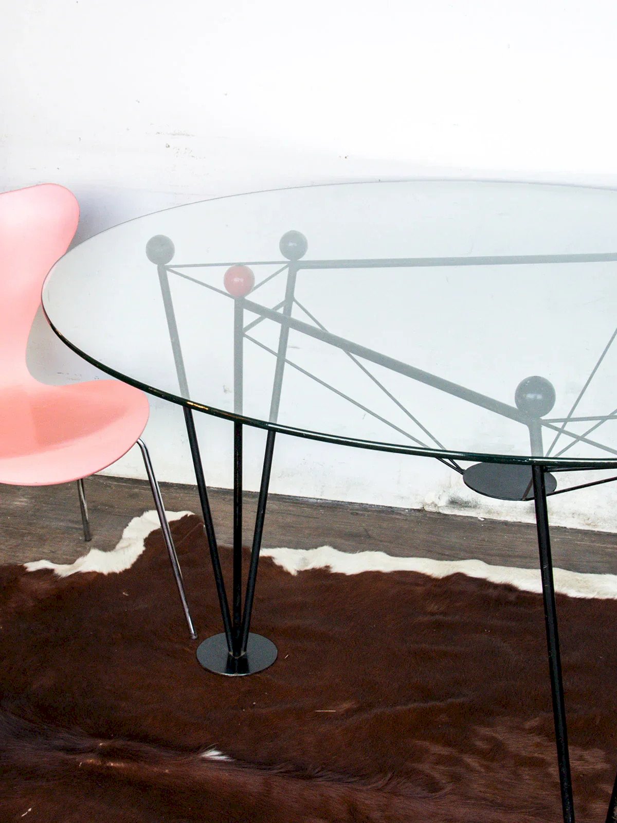 Add a vintage touch to your home with this elegant round table from the 80s. Its clear glass top, supported by a sturdy black metal frame, offers an aesthetic that is both modern and timeless. Capable of seating 4 to 6 people, it is ideal for your family or friends' meals. The black and red wooden balls add a hint of originality, making this table a true decorative element in your dining room. Height: 78 cm Height under the top: 77 cm Diameter: 135 cm Condition: Used: An item that has been used. The item shows some signs of superficial wear...Used: An item that has been used. The item shows some signs of superficial wear, fully operational and functioning correctly. It may be a display model or an item returned to the store after a short period of use, along with any imperfections. Brand: Debongout Type: Vintage product Material: Glass, Metal Style: Contemporary Customizable: Dining tables