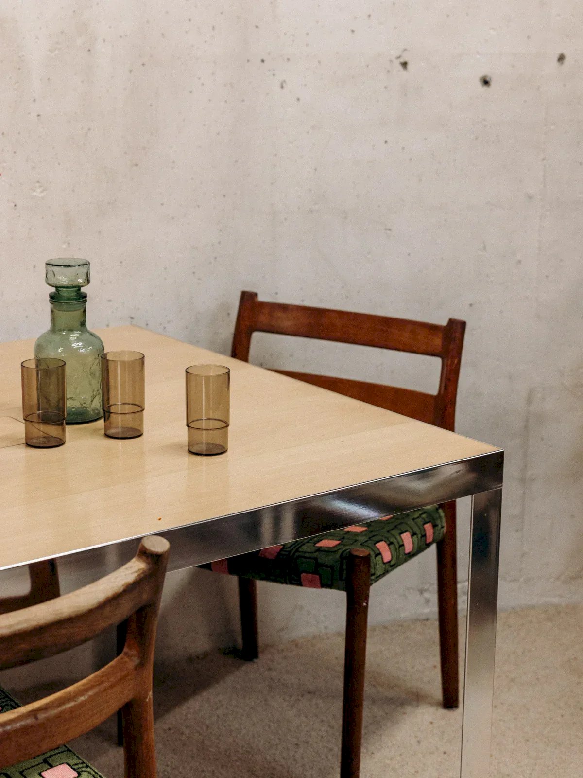 Italian dining table, Unifore edition, which combines a metal structure with a light wood top. Its sober and balanced silhouette offers a large warm surface, ideal for hosting up to 6 guests. A small central hatch, designed for raclette and other appliances, facilitates connection without disrupting the aesthetics. Discreet design and selected materials for a friendly table that fits well in both contemporary interiors and more traditional settings. Length: 140 cm Width: 100 cm Height: 74 cm Height under the top: 68 cm Condition: Used: Item that has been used. Item showing some superficial wear marks, fully operational and functioning correctly. It may be a demonstration model or an item returned to the store after a short period of use. Possible imperfections. Brand: Debongout Type: Vintage product Material: Wood, Metal Style: Contemporary Customized: Dining tables