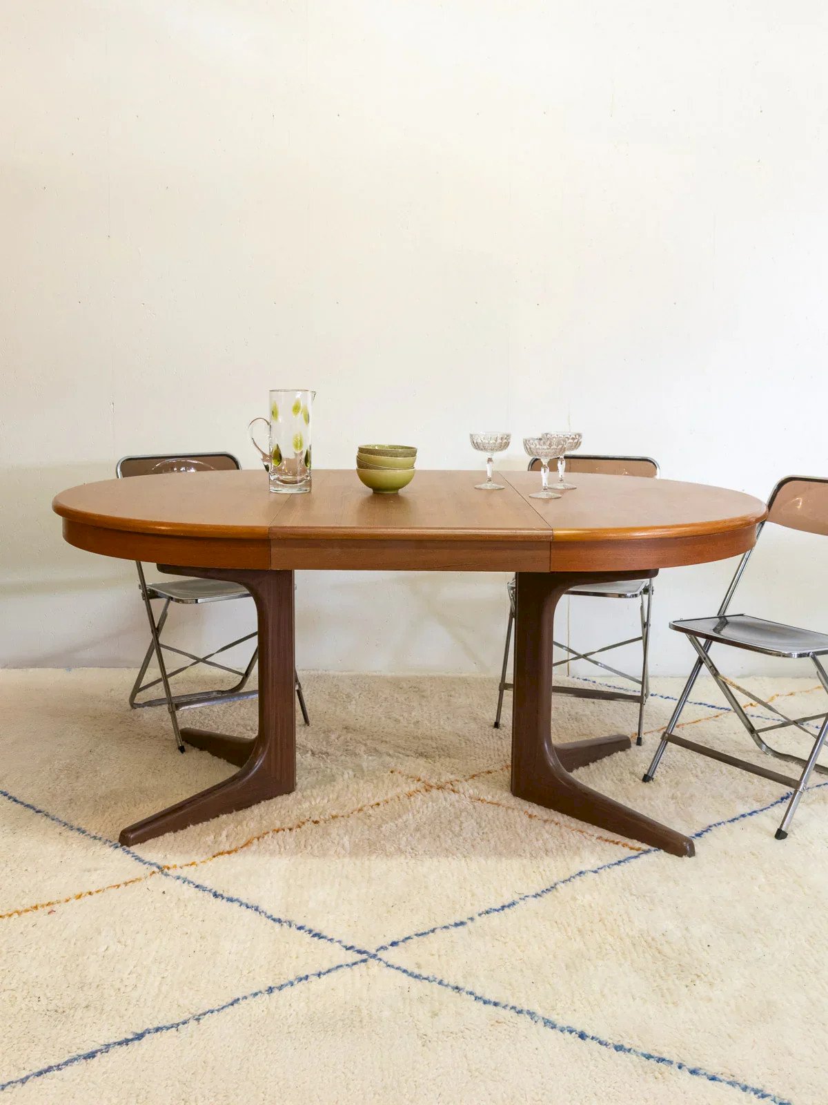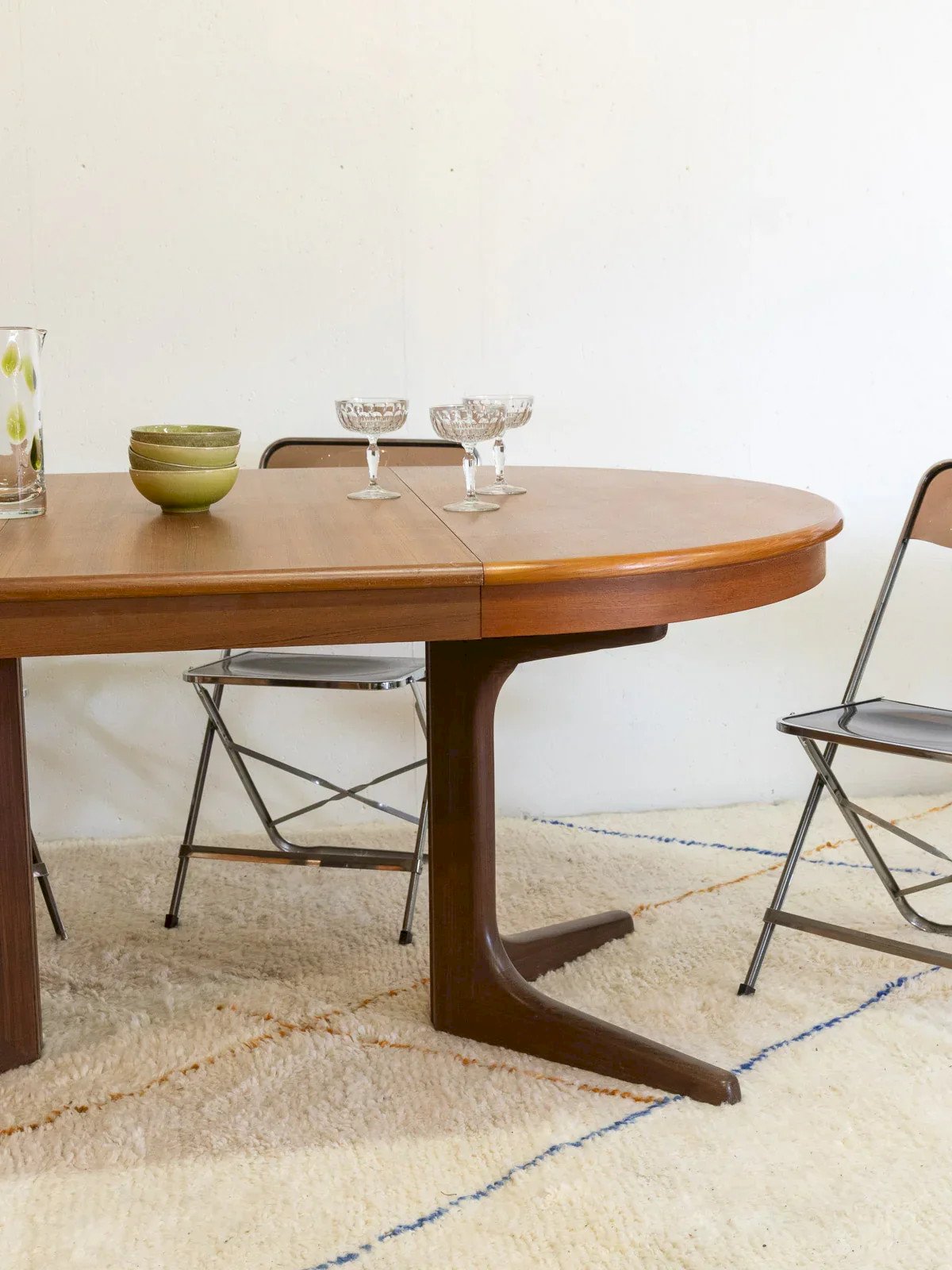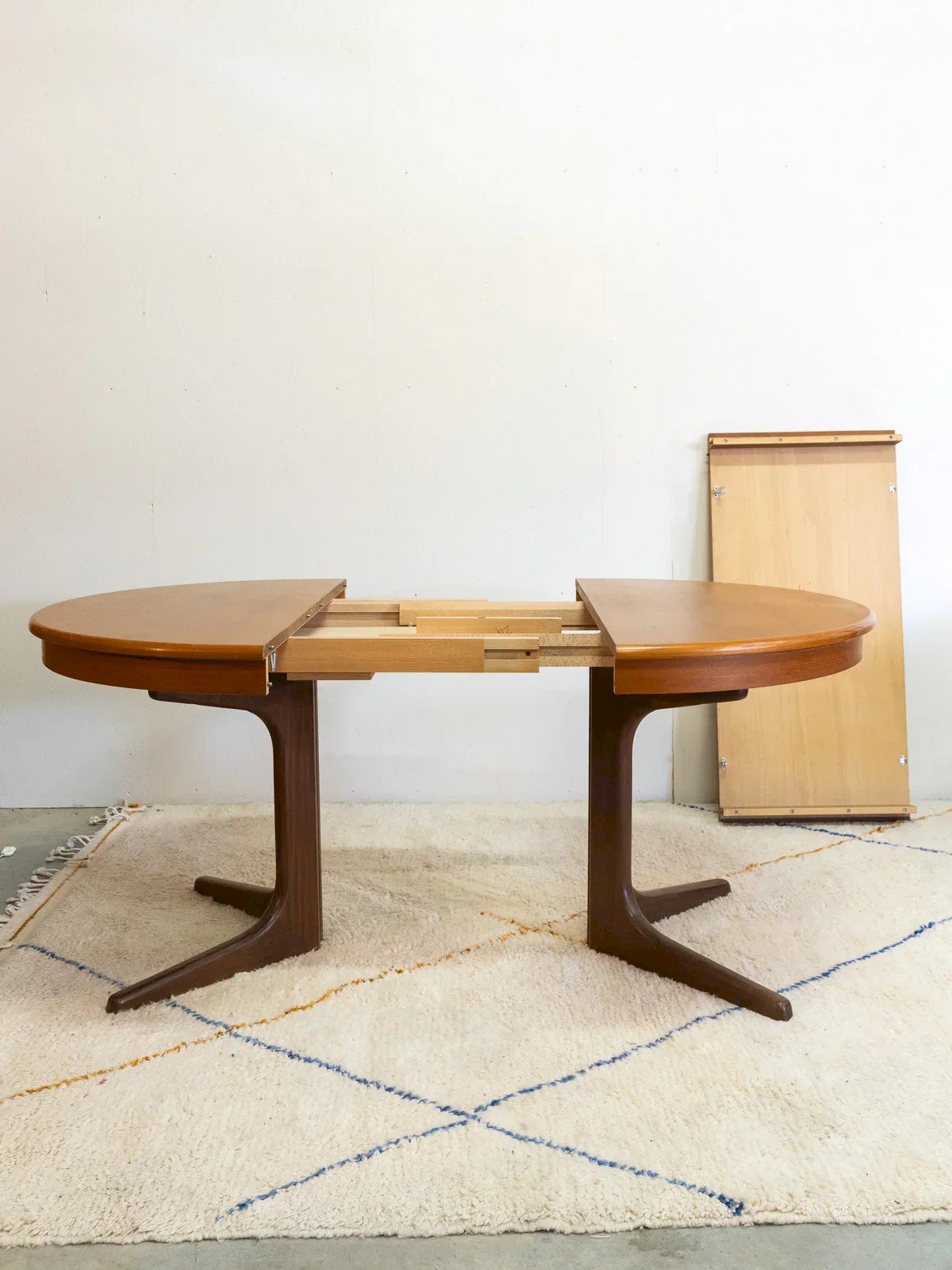 Elevate your dining room with this round teak table attributed to Roche Bobois, featuring a generous tabletop that can accommodate 4 to 6 guests. Its design and the option to add an extension in the center offer ideal modularity for everyday meals or more convivial dinners, while the warm patina and slightly darker legs provide an elegant contrast. Some signs of wear are present, adding to its authenticity. Height: 77 cm Diameter: 113 cm Condition: Used item; shows some superficial wear marks, fully operational and functioning correctly. It may be a demonstration model or an item returned to the store after a short period of use, with any possible imperfections. Brand: Debongout Type: Vintage product Material: Teak Style: Contemporary Customized: Dining tables