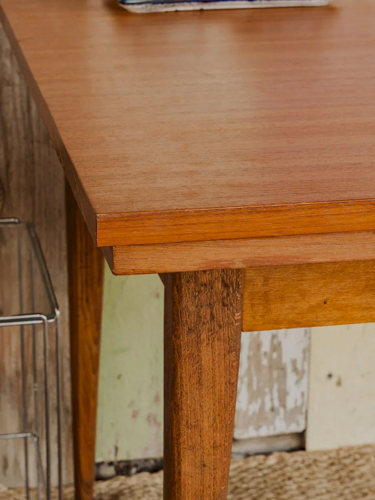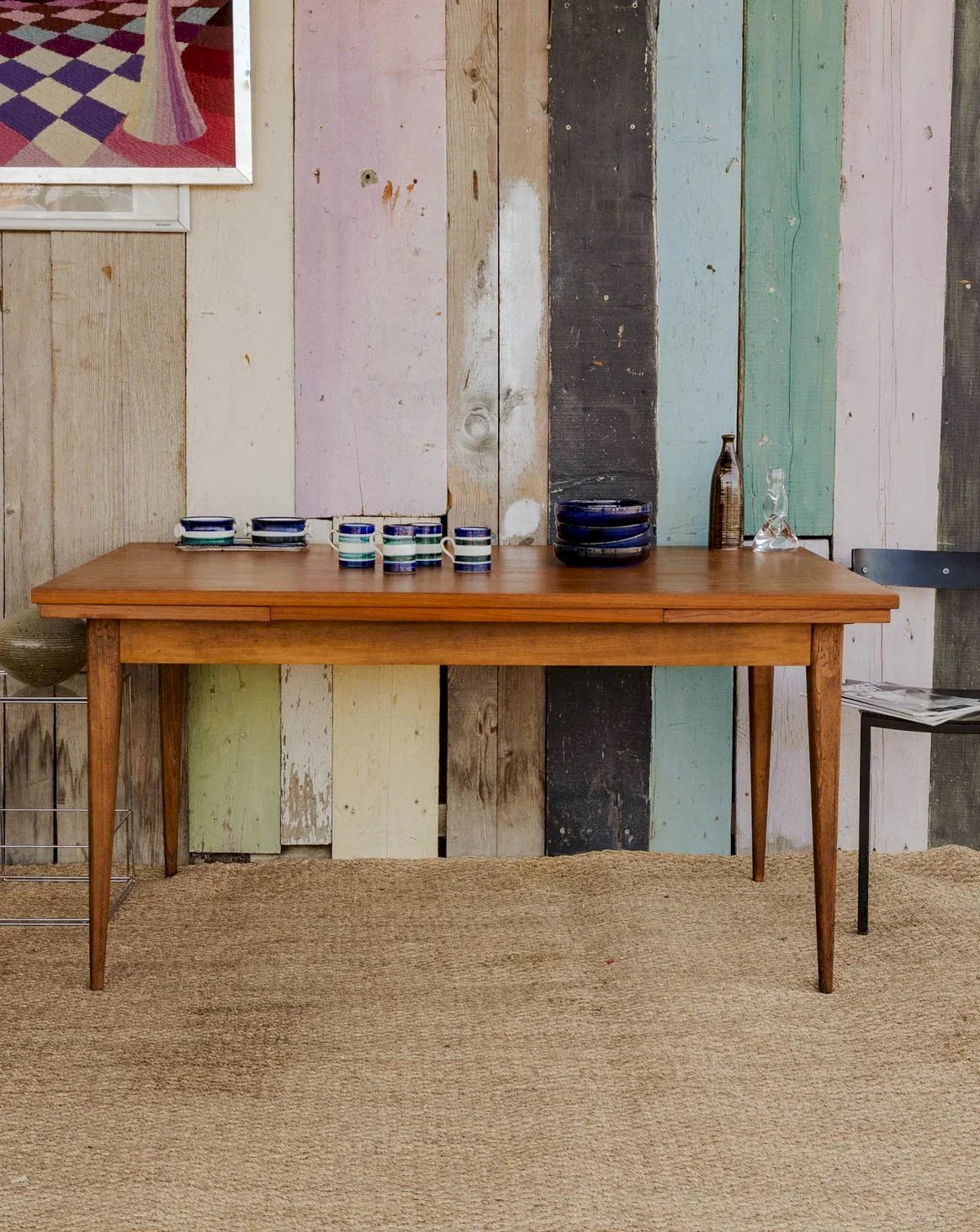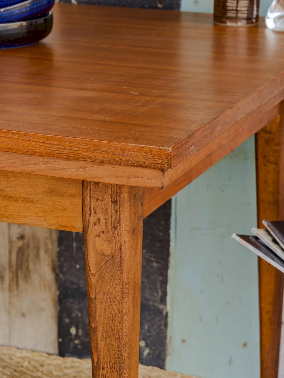 Elevate your dining room with this teak table, whose warm presence adds deep and natural patina to the room. Designed to comfortably seat four to six diners on a daily basis, it transforms into a large host table with its extensions to accommodate more guests during festive meals. Its robust structure and generous proportions offer stability and character, creating a friendly and refined atmosphere. Some signs of wear are present. Length: 190 cm Width: 50 cm Height: 75 cm Length with extensions: 229.5 cm Condition: Used: Item has been used. Item shows some superficial signs of wear, fully operational and functioning correctly. It may be a display model or an item returned to the store after a short period of use. Any potential imperfections. Brand: Debongout Type: Vintage product Material: Teak Style: Contemporary Custom: Dining tables
