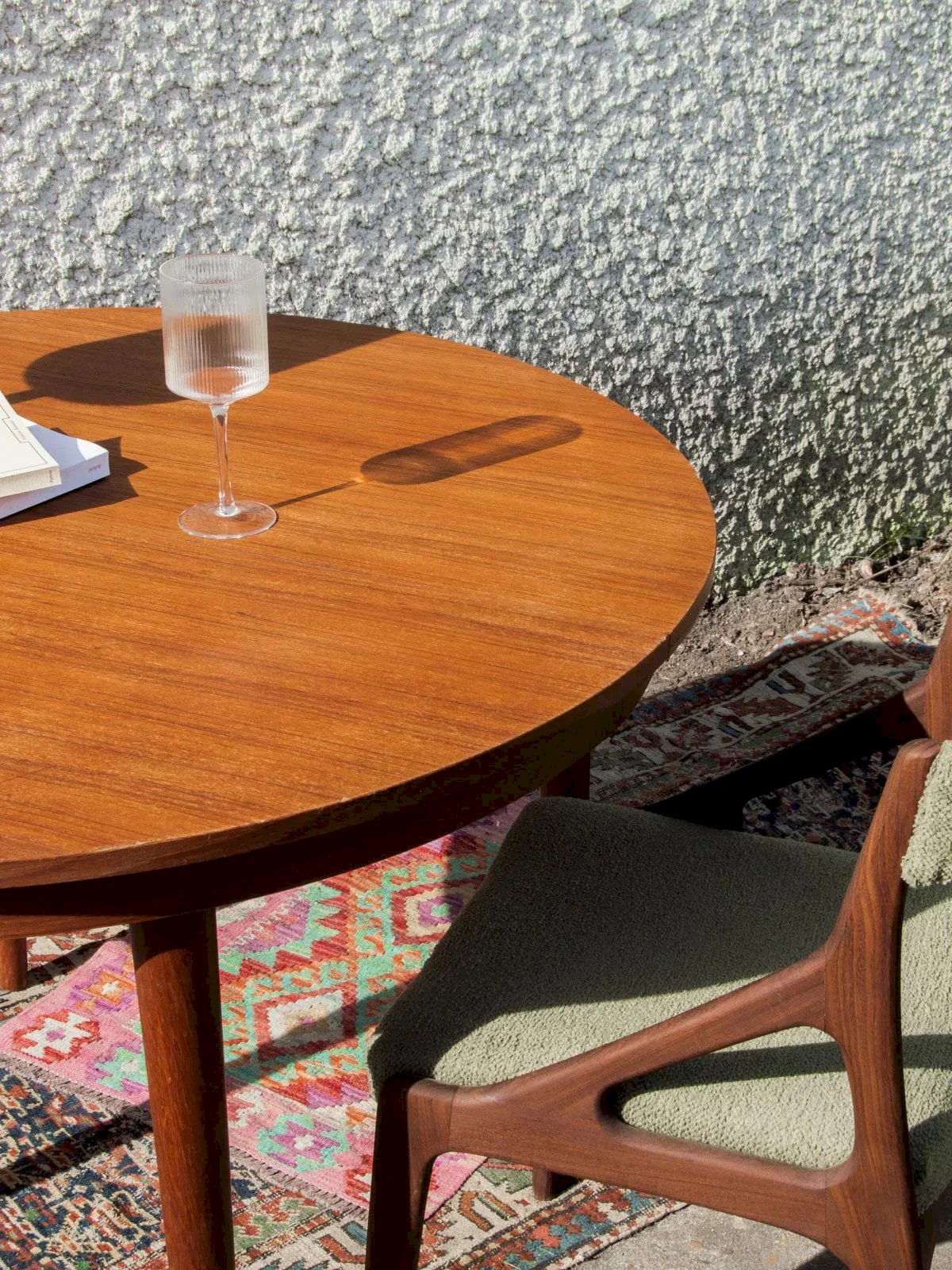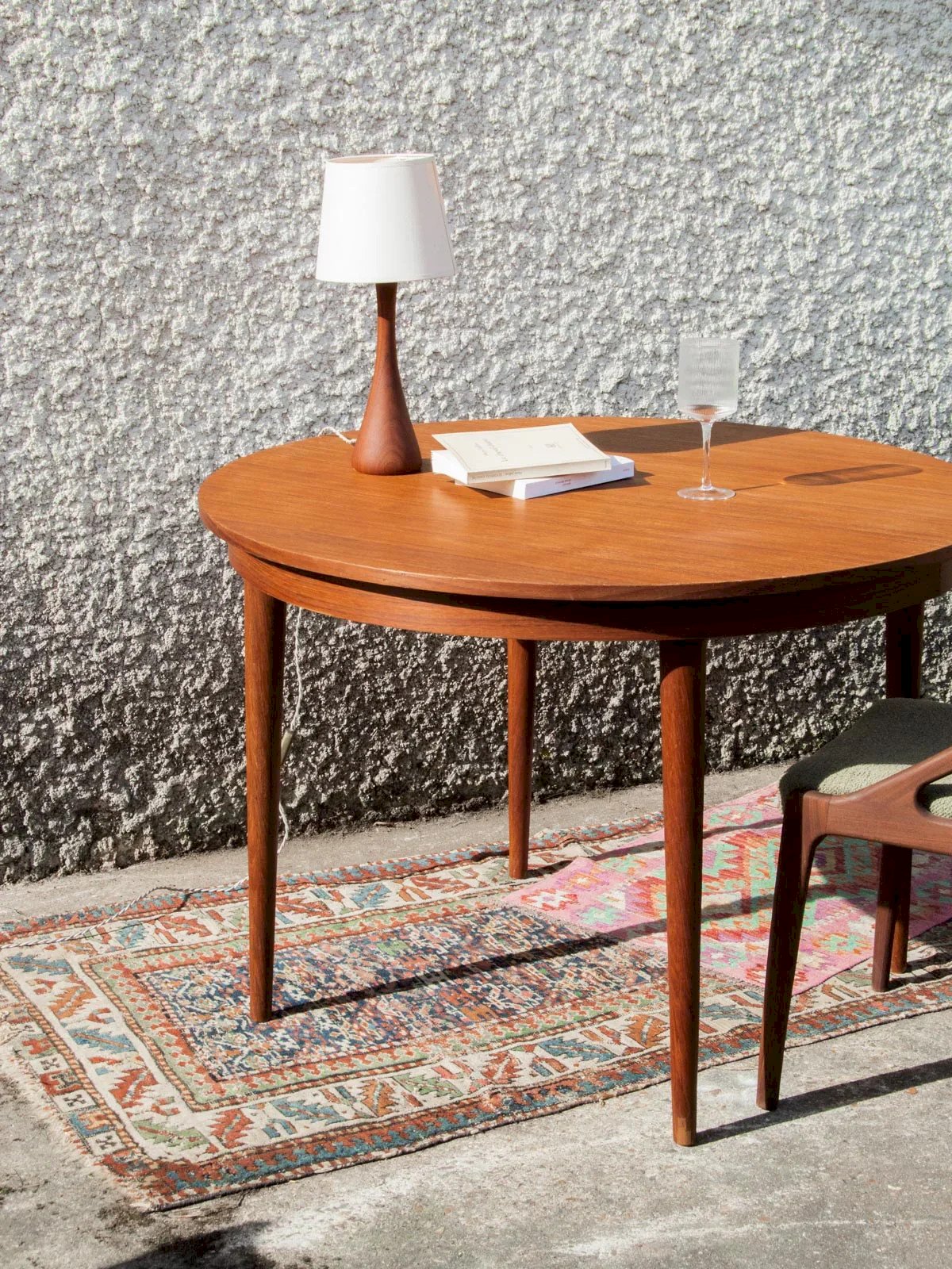 Add a vintage touch to your interior with this round dining table made of teak veneer. Its straight and simple legs provide stability and a sleek style. The grain of the teak adds warmth and elegance to the whole. Perfect for friendly meals, it can accommodate up to 4 guests. A simple and effective model, easy to integrate. Height: 76 cm Clearance: 68 cm Diameter: 110.5 cm Condition: Used: Item that has been used. Item showing some superficial signs of wear, ...Used: Item that has been used. Item showing some superficial signs of wear, fully operational and functioning correctly. It may be a display model or an item returned to the store after a short period of use. any potential imperfections. Brand: Debongout Type: Vintage product Material: Teak, Wood Style: Contemporary Customized: Dining tables