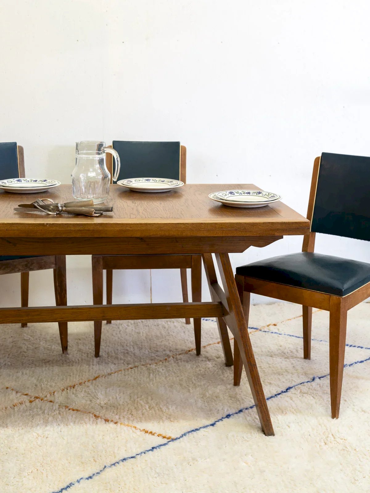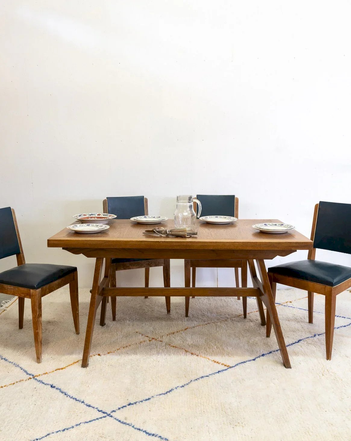 Adopt this wooden dining table attributed to René Gabriel, whose sober and functional aesthetics evoke mid-century elegance. Its lines highlight a thoughtful and warm design. Designed for 4 to 6 guests, its proportions offer a convivial seating arrangement and a surface conducive to shared meals and everyday conversations. Its wooden finish creates an intimate and timeless atmosphere in the dining room. There are some signs of time and a defect on the top that tell its story. Length: 135 cm Width: 75 cm Height: 72.5 cm Condition: Used: Item has been used. Item showing some signs of superficial wear, fully operational and functioning correctly. It may be a display model or an item returned to the store after a short period of use. Possible imperfections. Brand: Debongout Type: Curated product Material: Wood Style: Contemporary Customized: Dining tables.