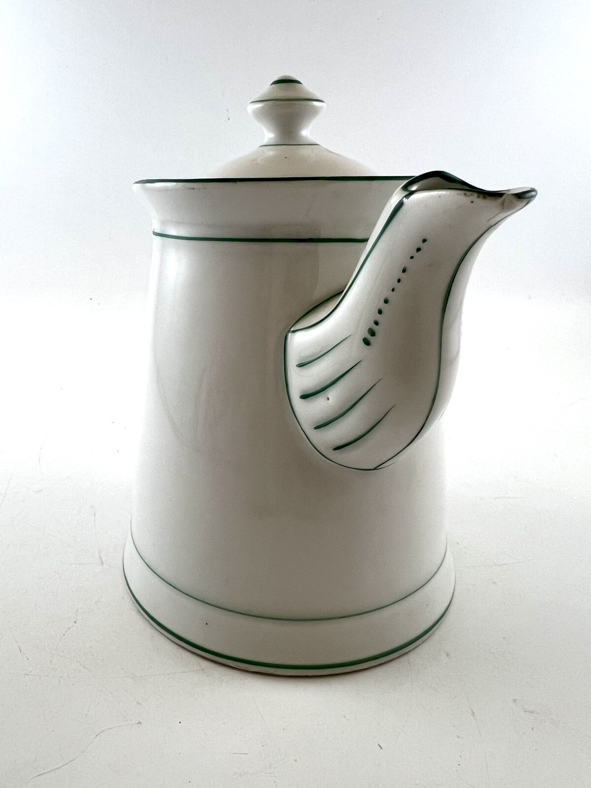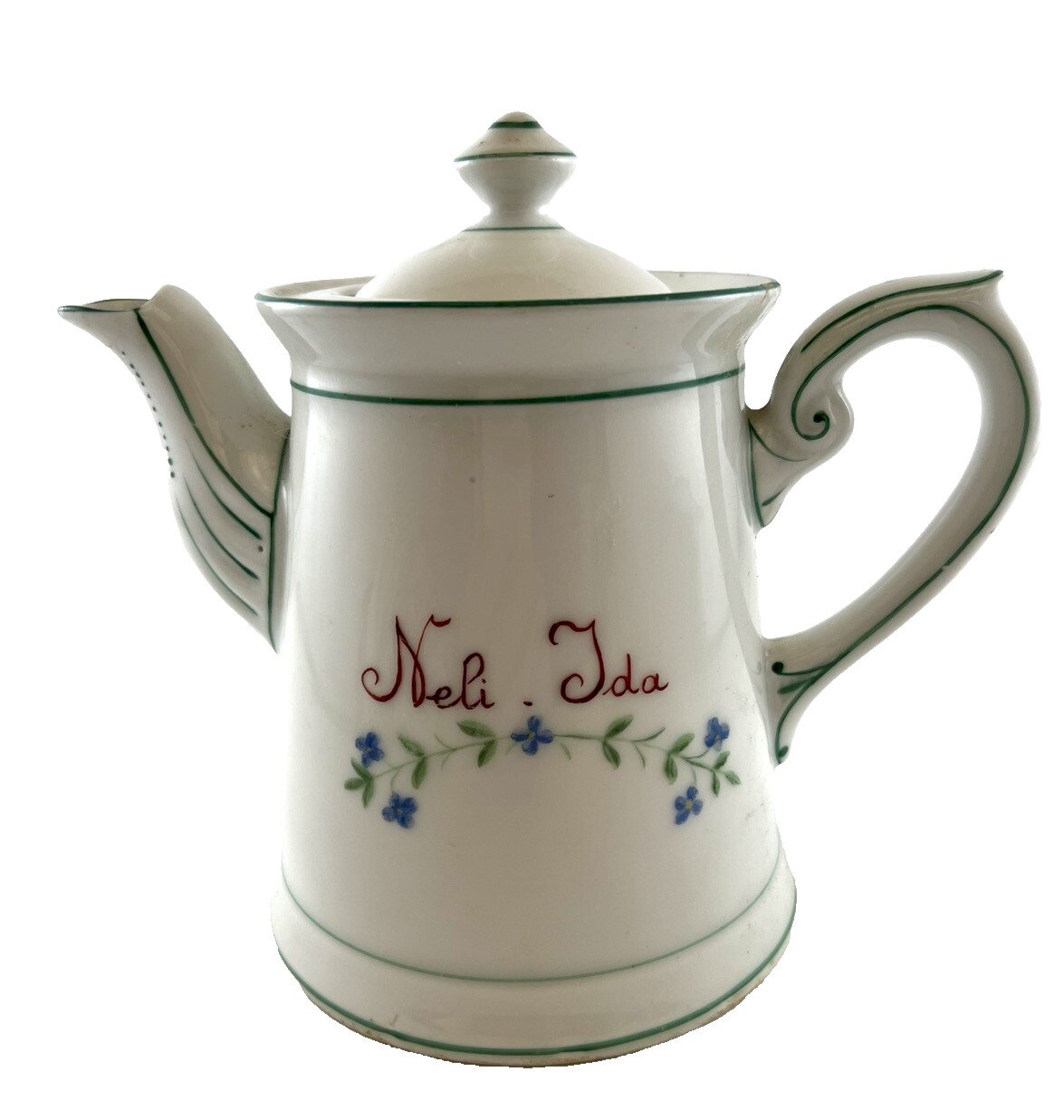 Vintage KPM Germany Teapot / Chocolate Pot – Blue Flowers – “Neli-Ida” inscription Charming vintage ceramic teapot / chocolate pot marked “KPM – Gebrauchsmusterschutz”, featuring a blue floral decoration and the handwritten inscription “Neli-ida” on the front. A lovely decorative piece from mid-20th century German production, perfect for a vintage kitchen, display cabinet, or ceramic collection. Condition Good overall condition with two small enamel chips: one on the lid one on the spout (see pictures) Dimension Height 14cm Base diameter: 11cm Country of origin: Germany