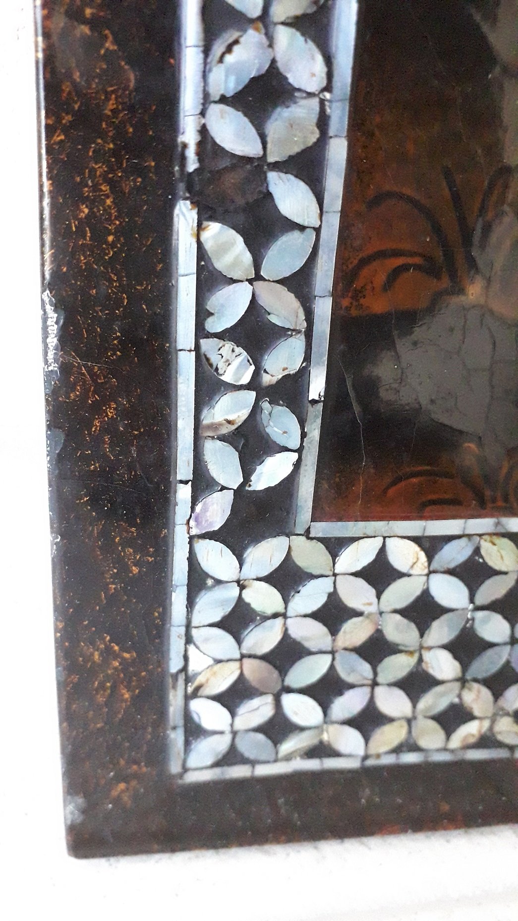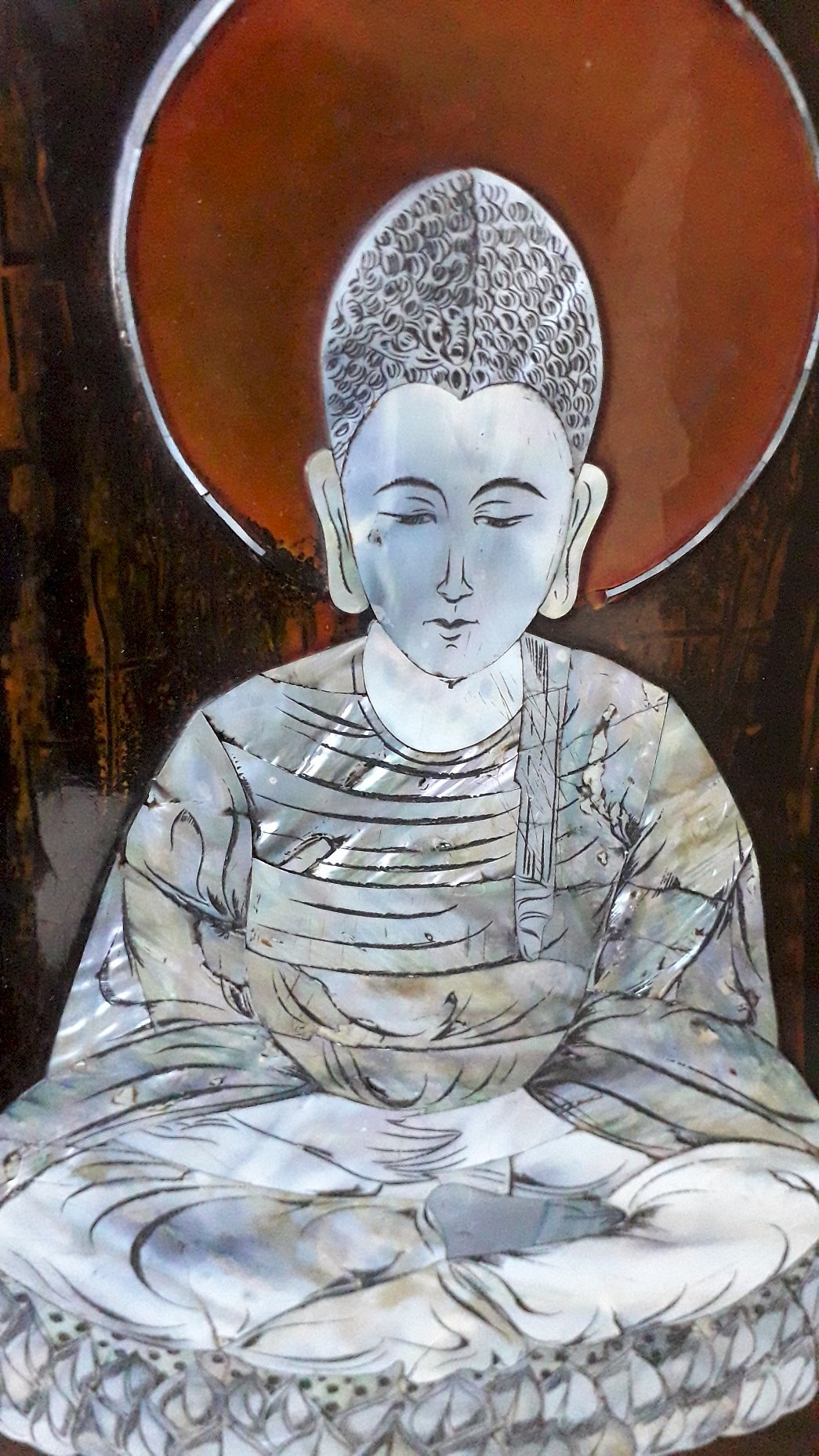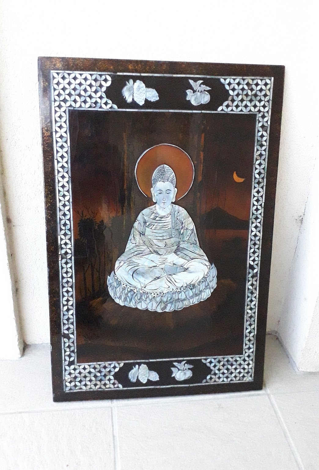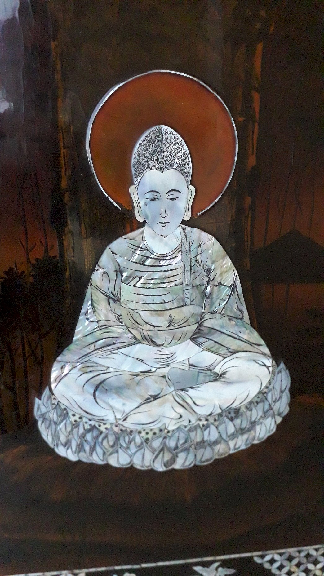 Vintage lacquered wood panel, and mother-of-pearl, depicting Buddha in a lotus position.