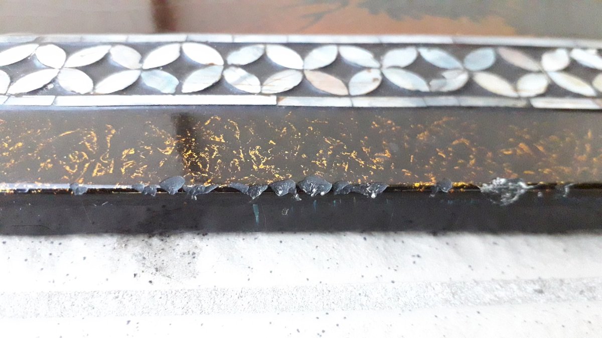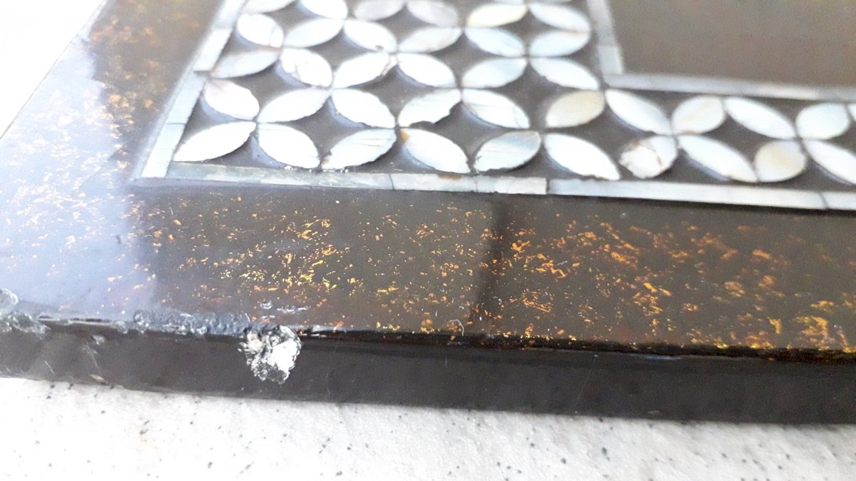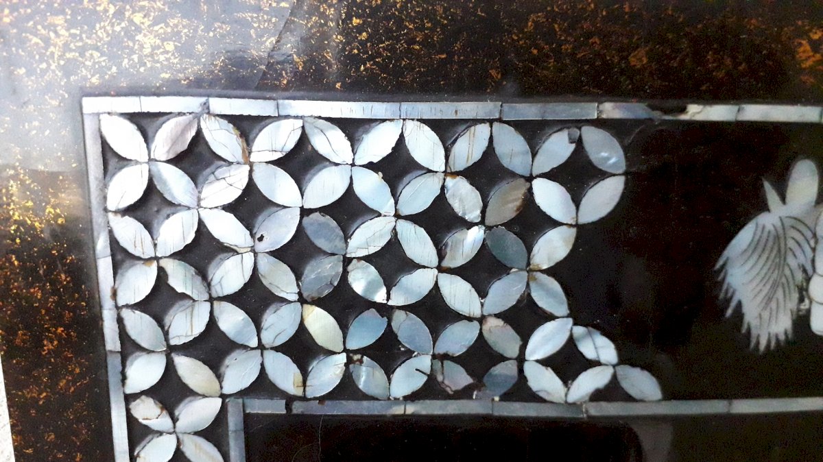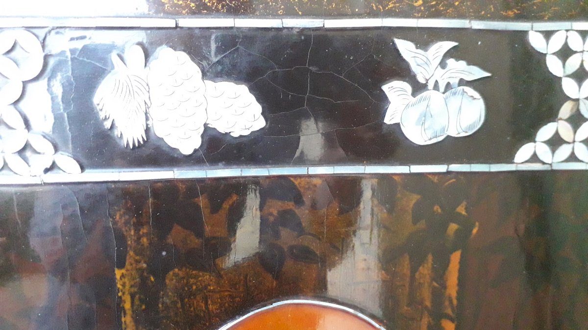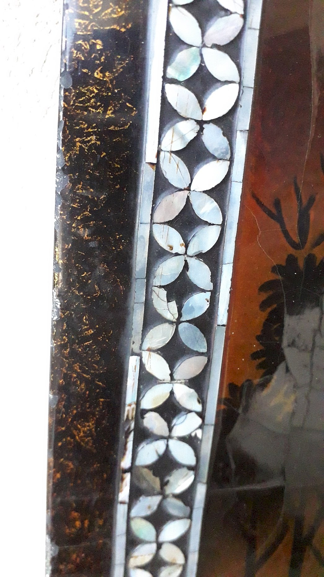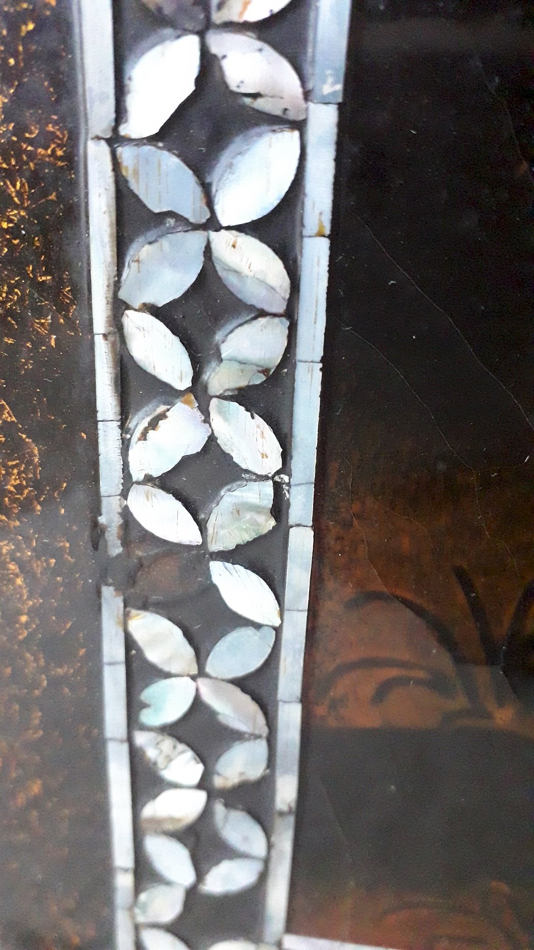 Vintage lacquered wood panel, and mother-of-pearl, depicting Buddha in a lotus position.