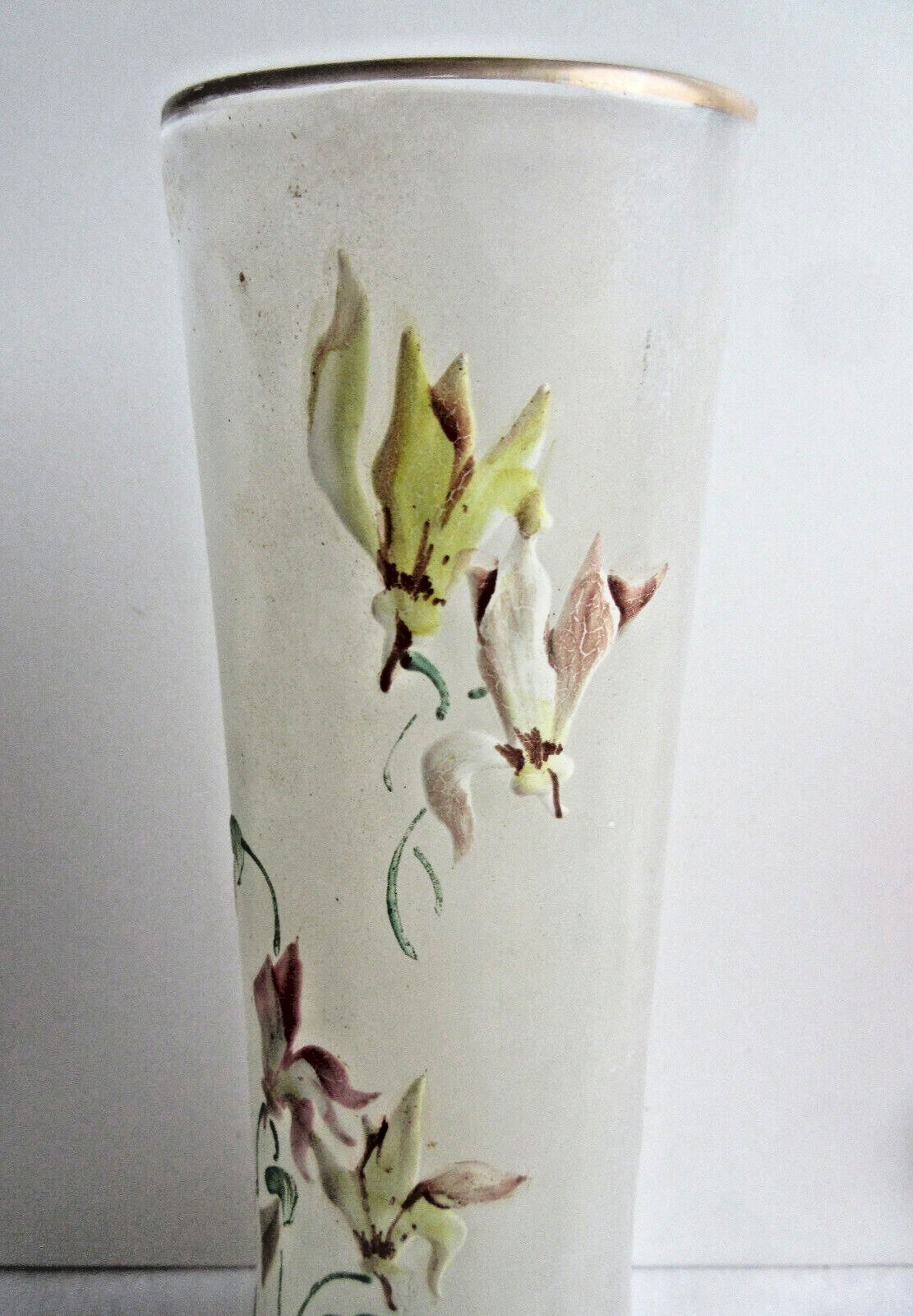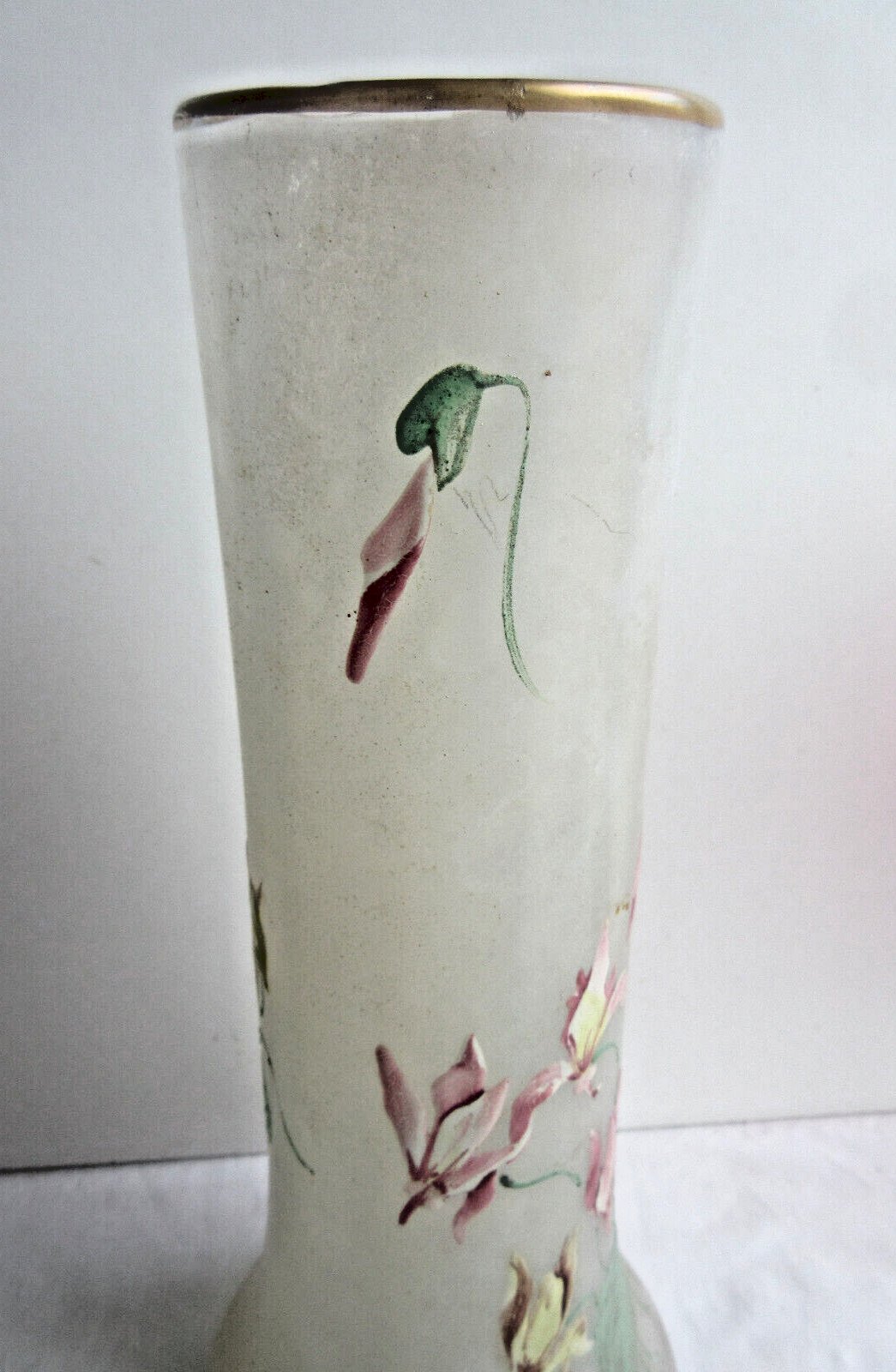 Worldwide sale. Enamelled Legras vase: Cyclamen seeding. Tall and round vase in opaque white glass, enamelled with multicolored cyclamen seeding. Good condition. Opening: 7.5 cm, base: 12 cm and height 30 cm. Superb vase with generous decoration and thick enamel. For collectors or as a gift. Authenticity: Original Type: Showcase object, Decorative Origin: France Period: Art Deco Subtype: Vase Material: Glass
