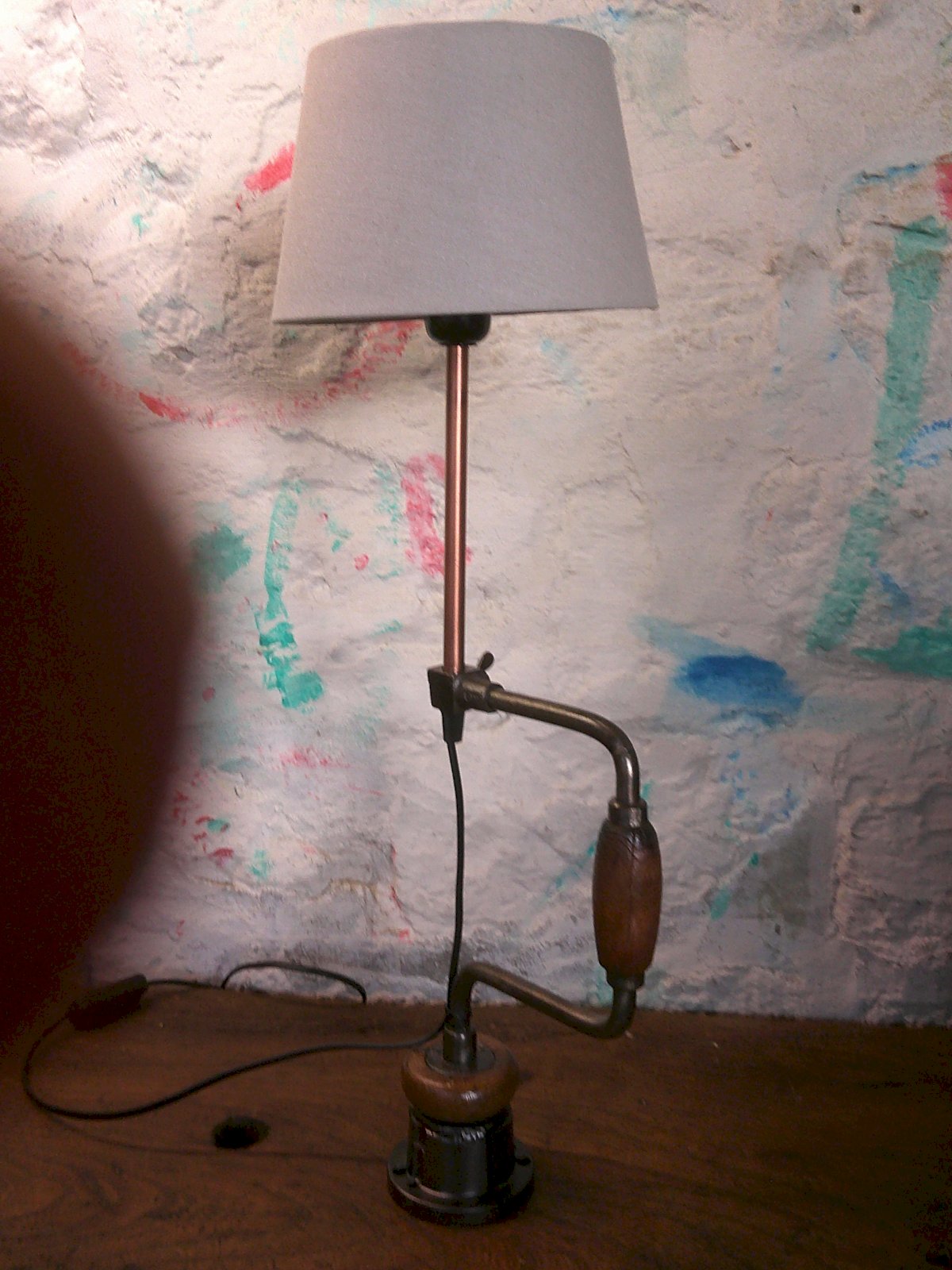 Industrial-style lamp made from an old carpenter's crankshaft. The whole piece has been brushed and varnished to stabilize the metal's oxidation. A copper tube is fixed in place of the wick to hold the socket. The base, made with a steel weight, makes it very stable. All my lamps are unique creations. Height with shade is 62 cm. Width is 20 cm. Depth is 22 cm. Weight is 2 kg. Pickup at the address or worldwide delivery.