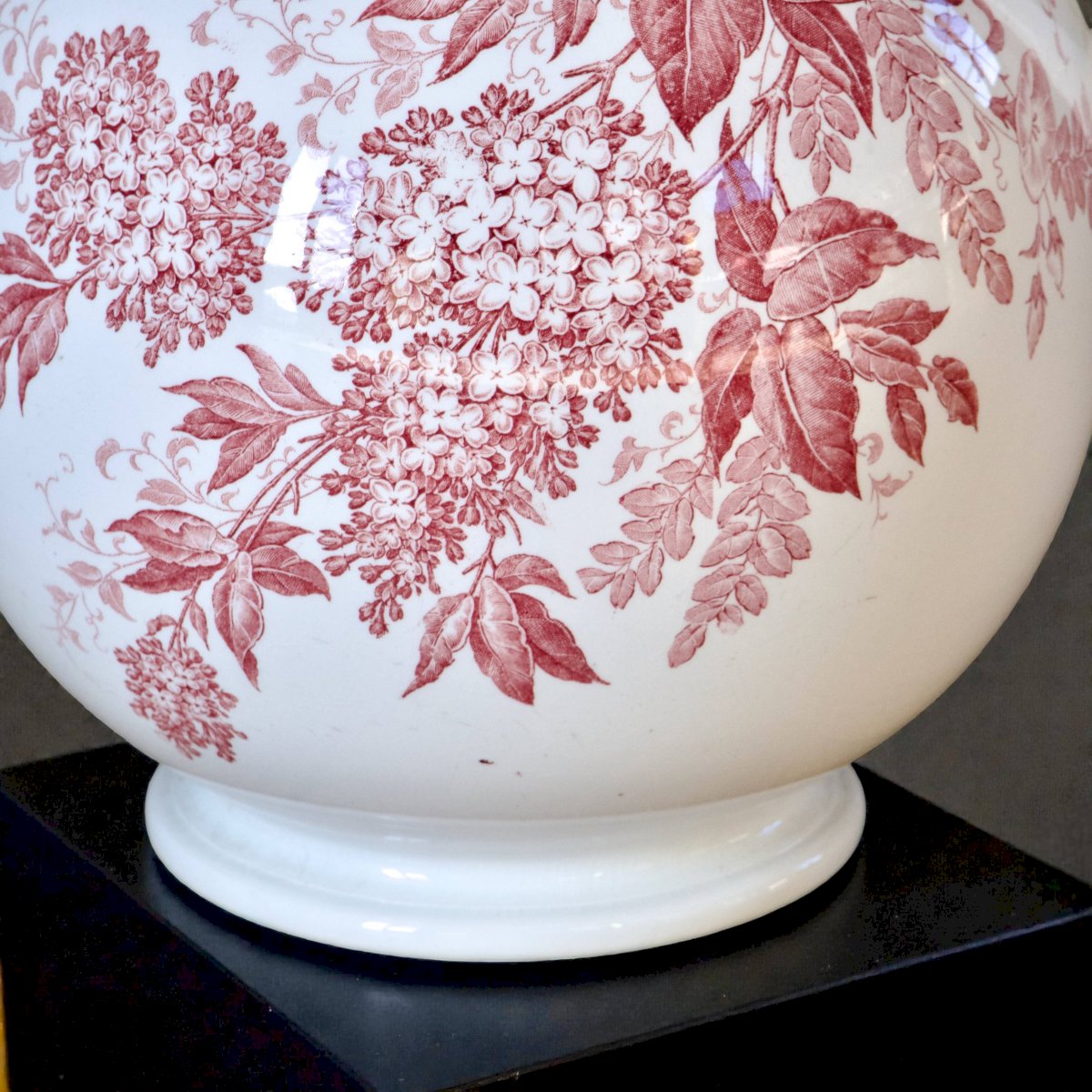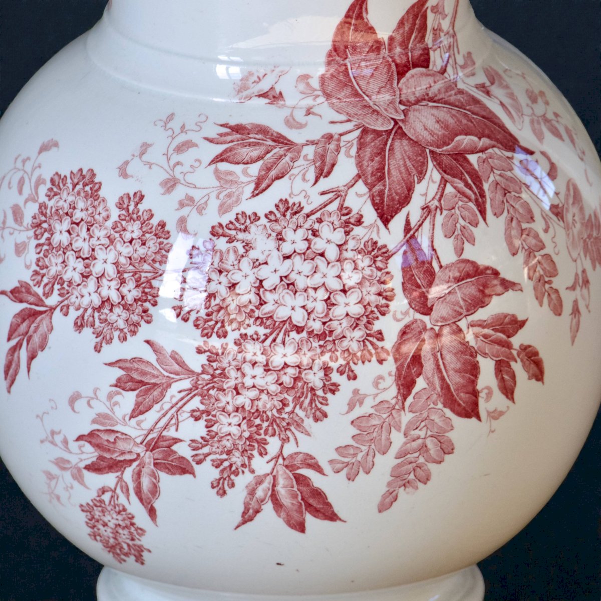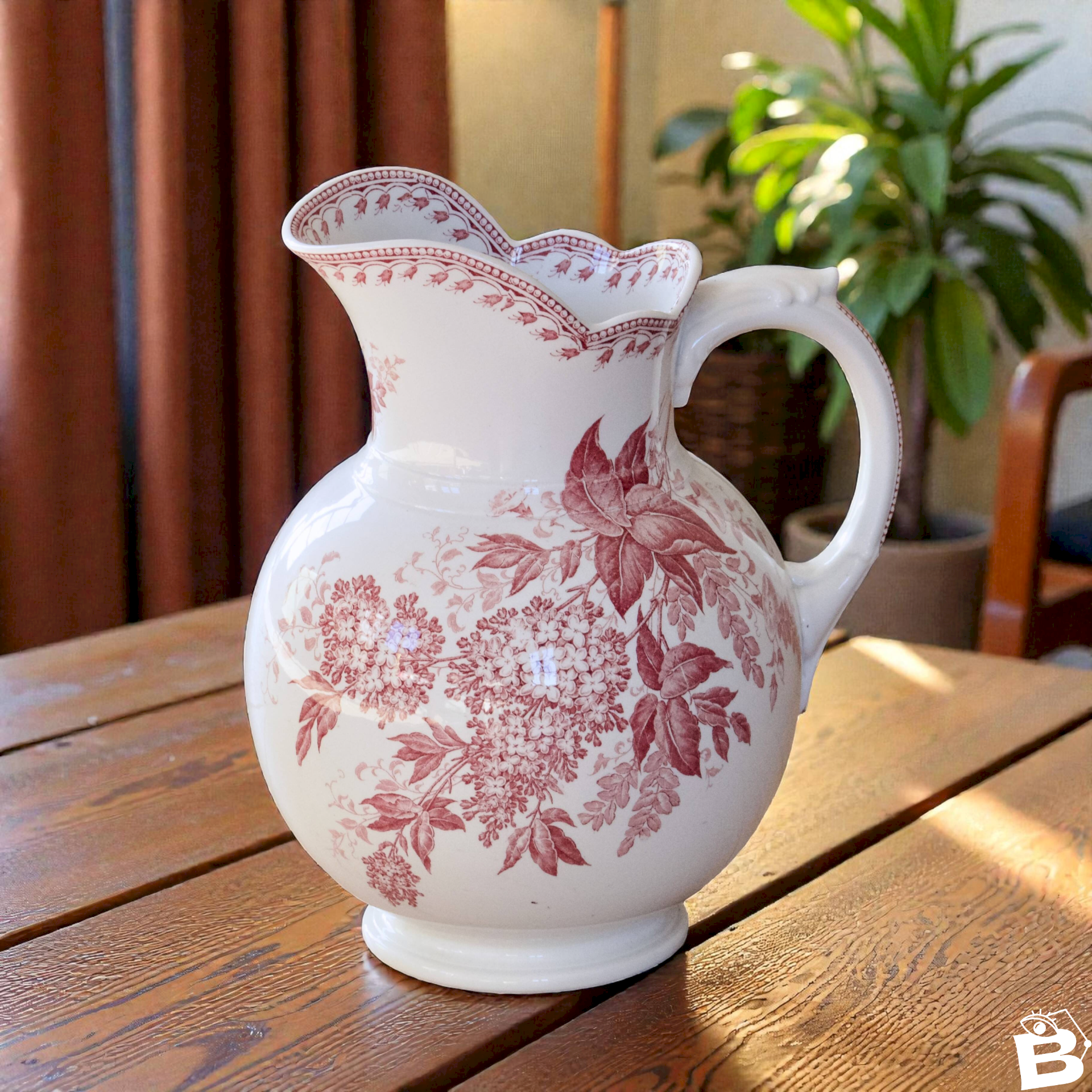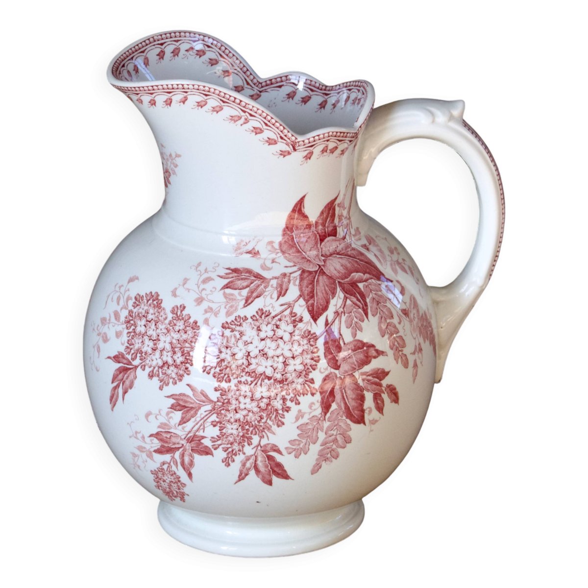 Very large toilet jug / antique pitcher, made of Dutch ironstone faience, signed "Société Céramique de Maestricht," collection "Printemps," late 19th century. Of large size, it has a beautiful breadth. Elegant bulging silhouette resting on a foot. Delicately shaped polylobed spout. Fine decoration in a soft red/pink, featuring an abundant floral motif composed of leafy branches and clusters of flowers, harmoniously distributed on the belly. Stylized floral frieze adorning the circumference of the neck. Clear and well-contrasted imprint. Signed on the bottom. Can be used as a large carafe, or as an elegant bathroom decoration, or even as a superb vase in a living room. It is in very good condition. The matching comb holder from the same collection is also available; see our other listings. ? 27 cm in height. ✨ Very careful shipping. ✨ Professional shop. ✨ You will receive an invoice and benefit from after-sales service after each purchase. ✨ We have other listings online, feel free to take a look. 01/26. L: 22 l: 19 H: 27
