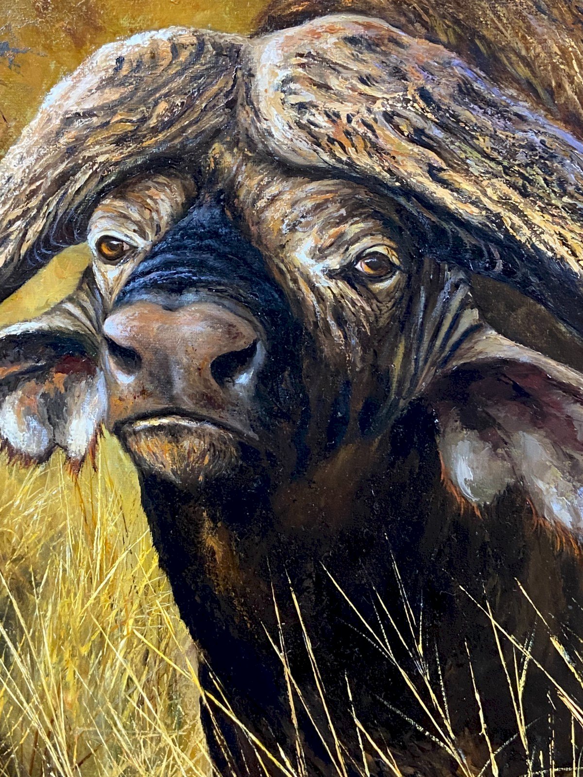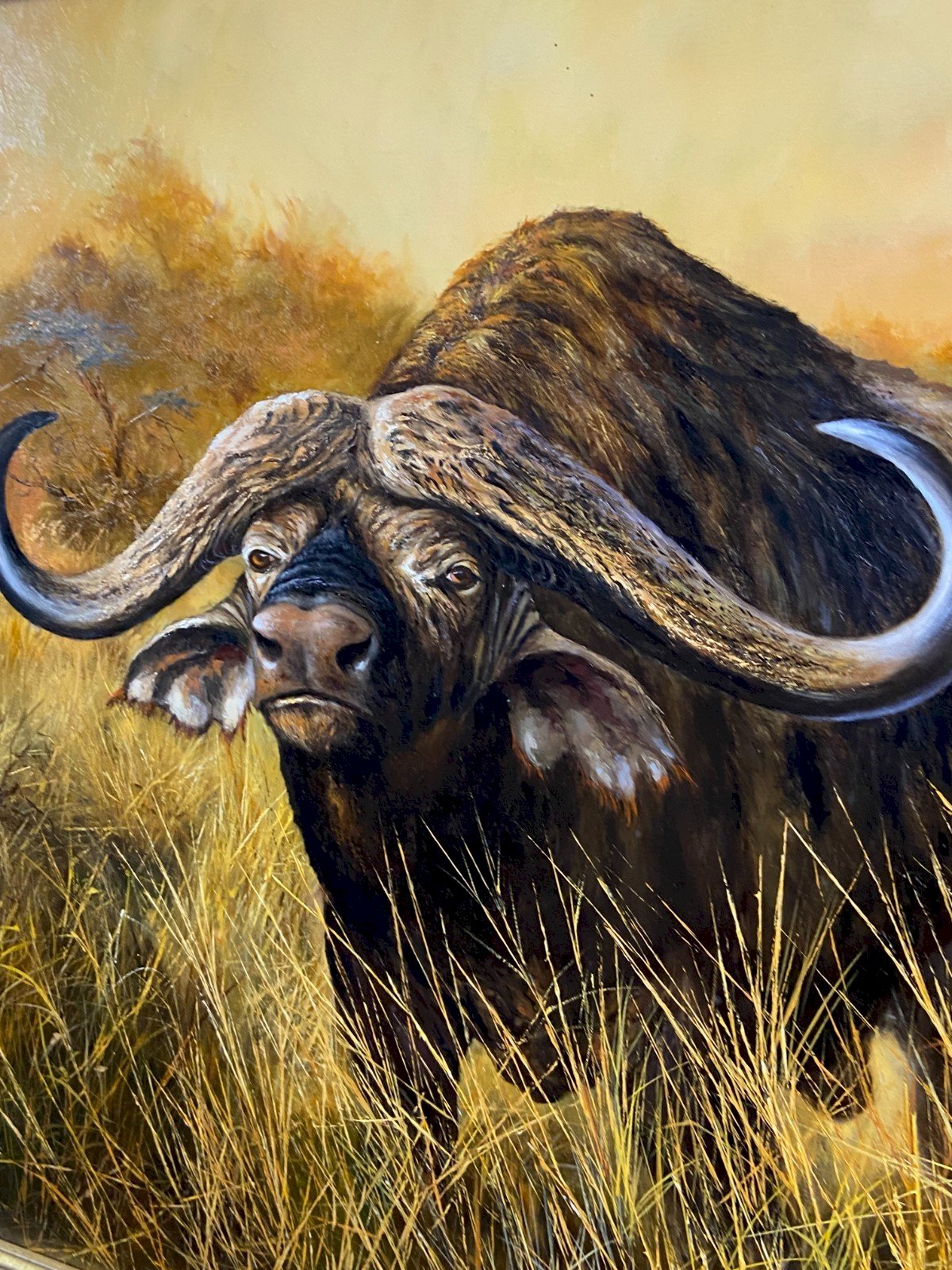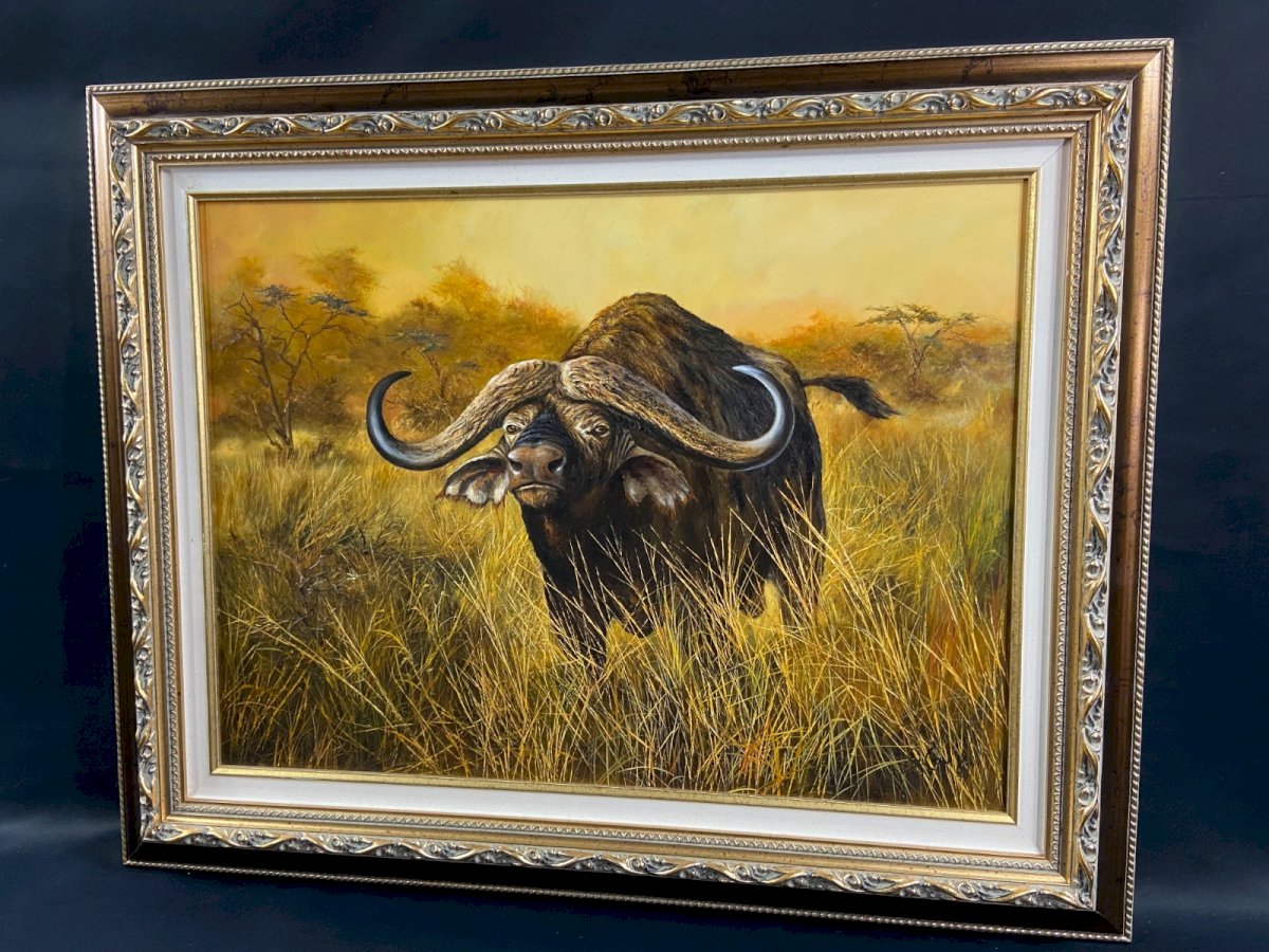 MAGNIFICENT large animal painting signed by Pierre COUZY featuring a buffalo in the African savannah. Very good condition. Maximum dimensions with frame 92.5 x 73.8 cm. Dimensions of the view only 71.5 x 52.8 cm. Weight: 4056 grams. Ultra-secure shipping worldwide - Order pickup available by appointment at 7 rue Notre-Dame 18000 Bourges. - Possibility of grouping within the same package: please contact me in advance so I can calculate your optimized shipping costs. Type: Oil. Country of origin: France. Features: Framed, Signed, On canvas. Theme: Animals. Artist: Pierre COUZY.