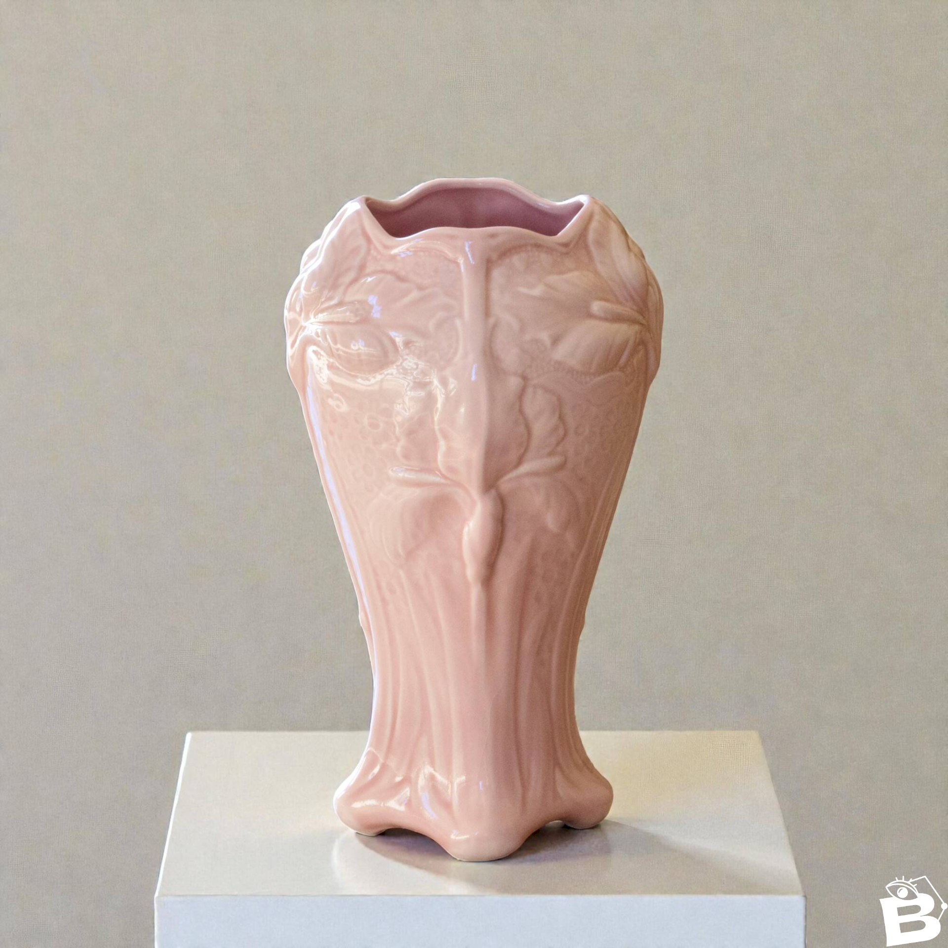Large and magnificent ancient Art Nouveau vase in majolica, signed Salins-les-Bains, circa 1920. Earthenware in a soft powder pink color, with relief decoration. Elongated shape resting on a slightly flared base formed by small wavy feet representing foliage from which large blooming flowers emerge. Body adorned with relief decoration combining stylized motifs of foliage, veins, and a multitude of small recessed flowers. Slightly tapered neck ending with a wavy floral lip. It is in perfect condition. ? 30 X 18 cm. ✨ Very careful shipping. ✨ We have other listings online, feel free to take a look. 12/25. L: 18 l: 30 H: 30