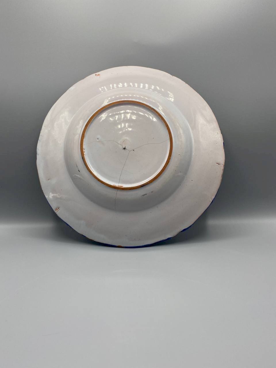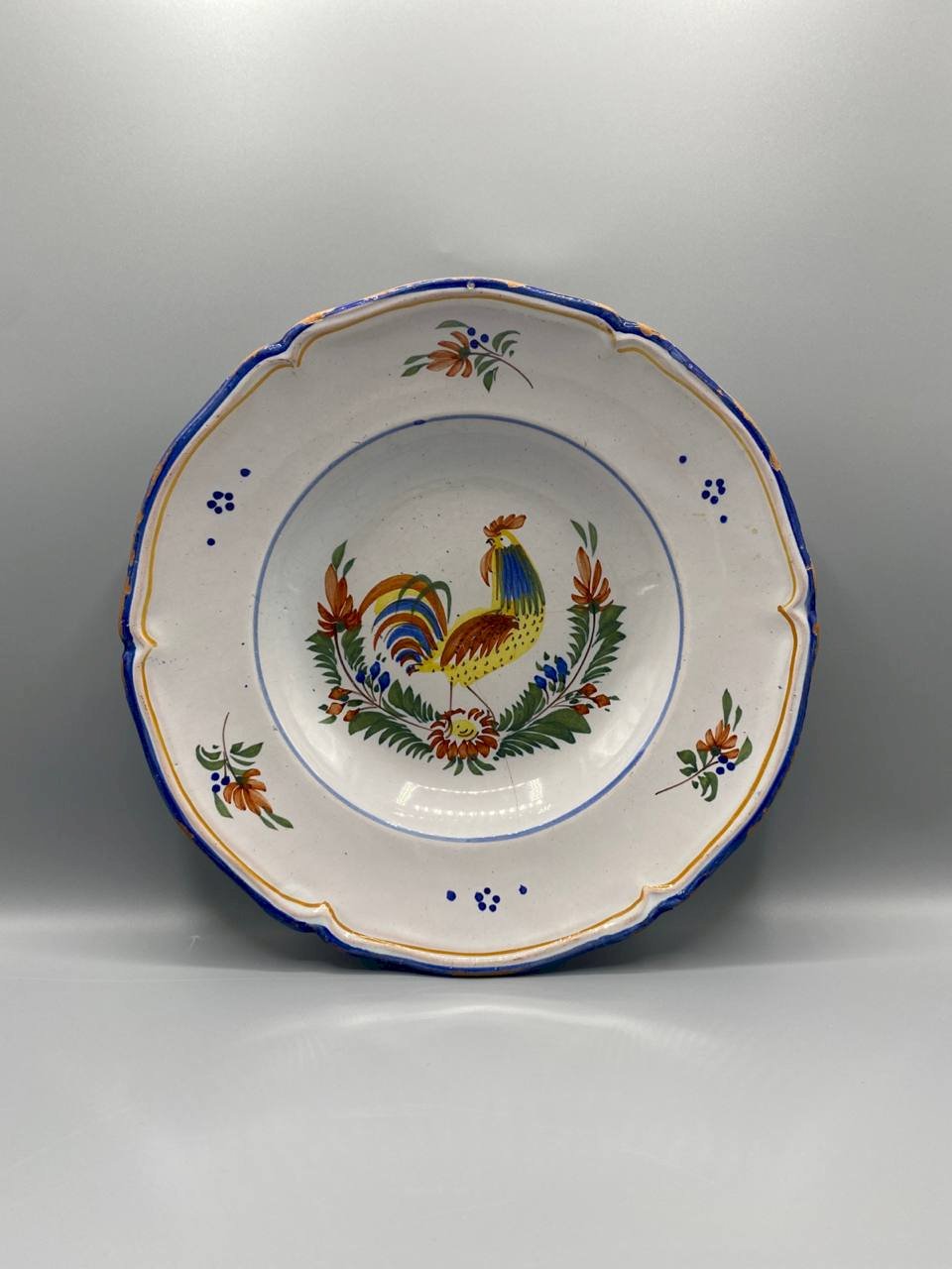 It has all the characteristics of a true country house piece. A hand-painted rooster, proud and colorful, set in the center of a lively decor with warm hues. Yellow brightens, blue structures, and green adds depth. The brushstroke is visible. The artisanal work is felt. Nothing cold, nothing industrial. The scalloped edge, highlighted with a double line of blue and ochre, gives it an elegant and authentic presence. Hung on a kitchen wall, placed on an antique sideboard, or integrated into a wall composition, it immediately catches the eye. Dated from the late 19th century or early 20th century, it belongs to the great tradition of French popular pottery. This type of rooster decor has become emblematic of rustic interiors and family homes. Its diameter of approximately 26 cm makes it a beautiful decorative piece, neither small nor trivial. It has stood the test of time and bears a natural patina, which enhances its authenticity and charm. It is not smooth; it is alive.