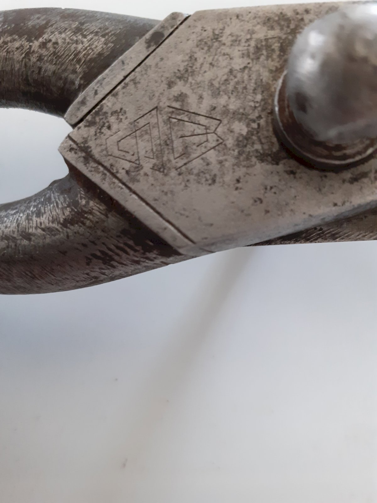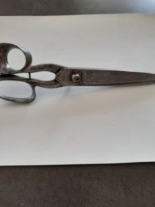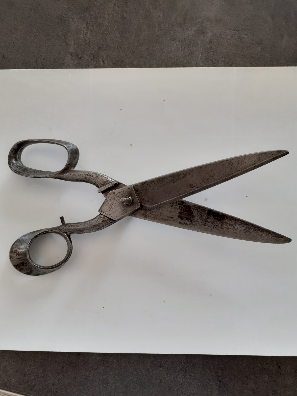 large antique scissors, right-handed. weight 500 grams, length 28 cm, blade length 14 cm. brand M G on one side. on the other side E G no. 205. it cuts very well.