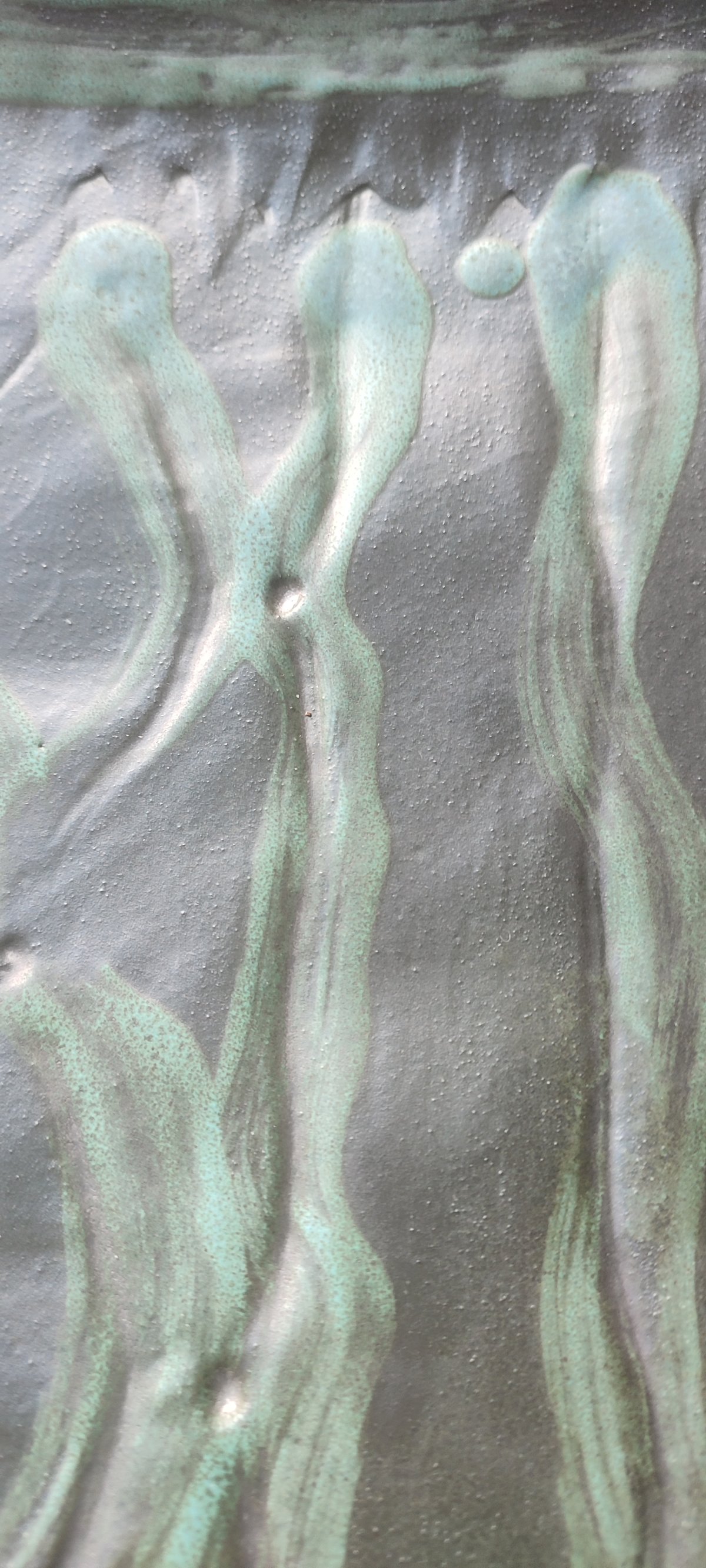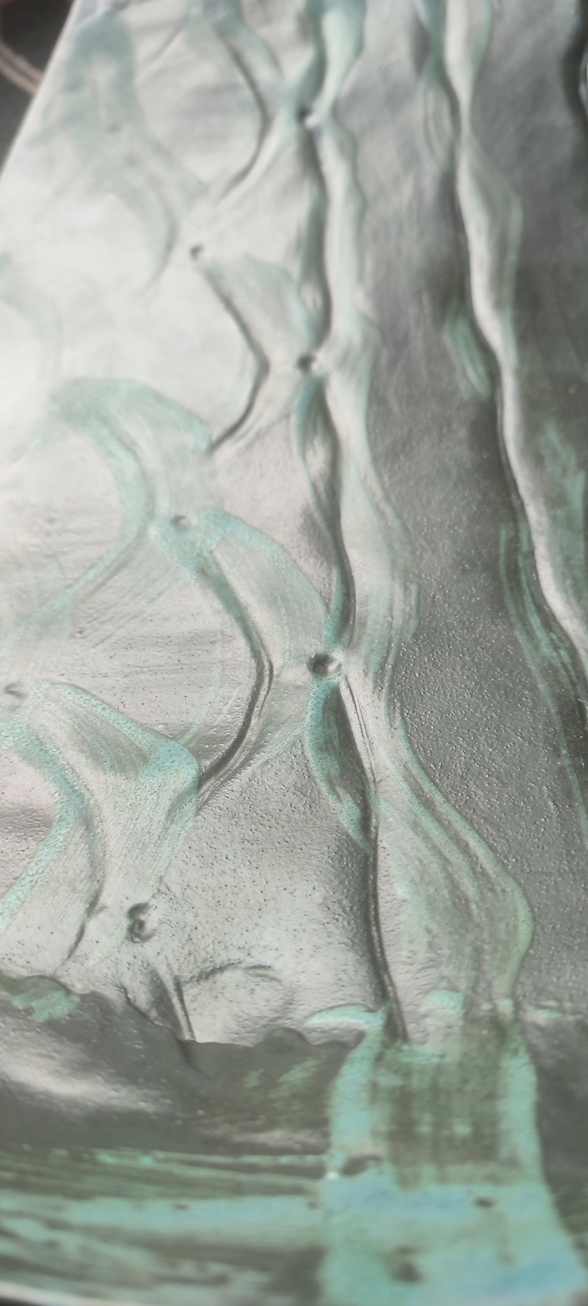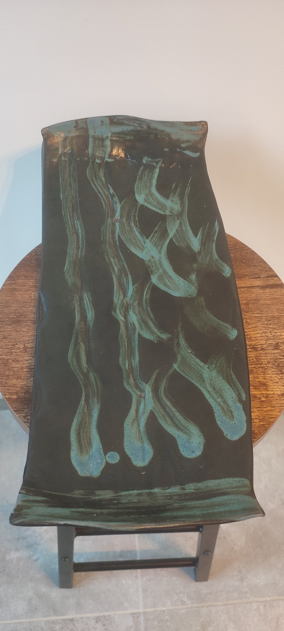 This large free-form bowl measures 42 cm long by 20 cm wide. The surface features textural work with pronounced reliefs and traces of shaping in the mass. The decoration comes in glazed shades of turquoise and emerald with shiny reflections. The raw pyritic stoneware reverse has structural reinforcement ribs typical of large handmade workshop pieces. A cursive signature is incised into the clay, but I have not identified it. Perfect condition.