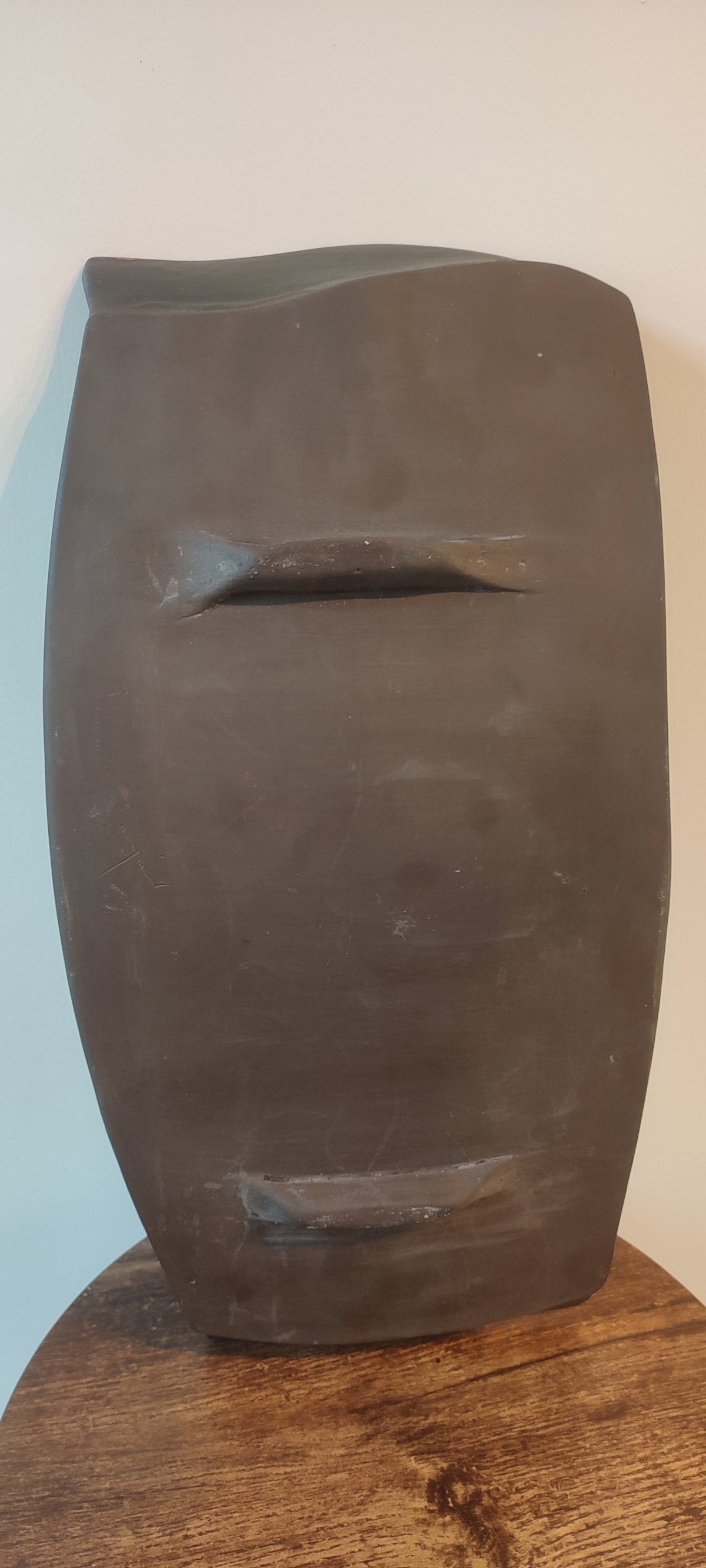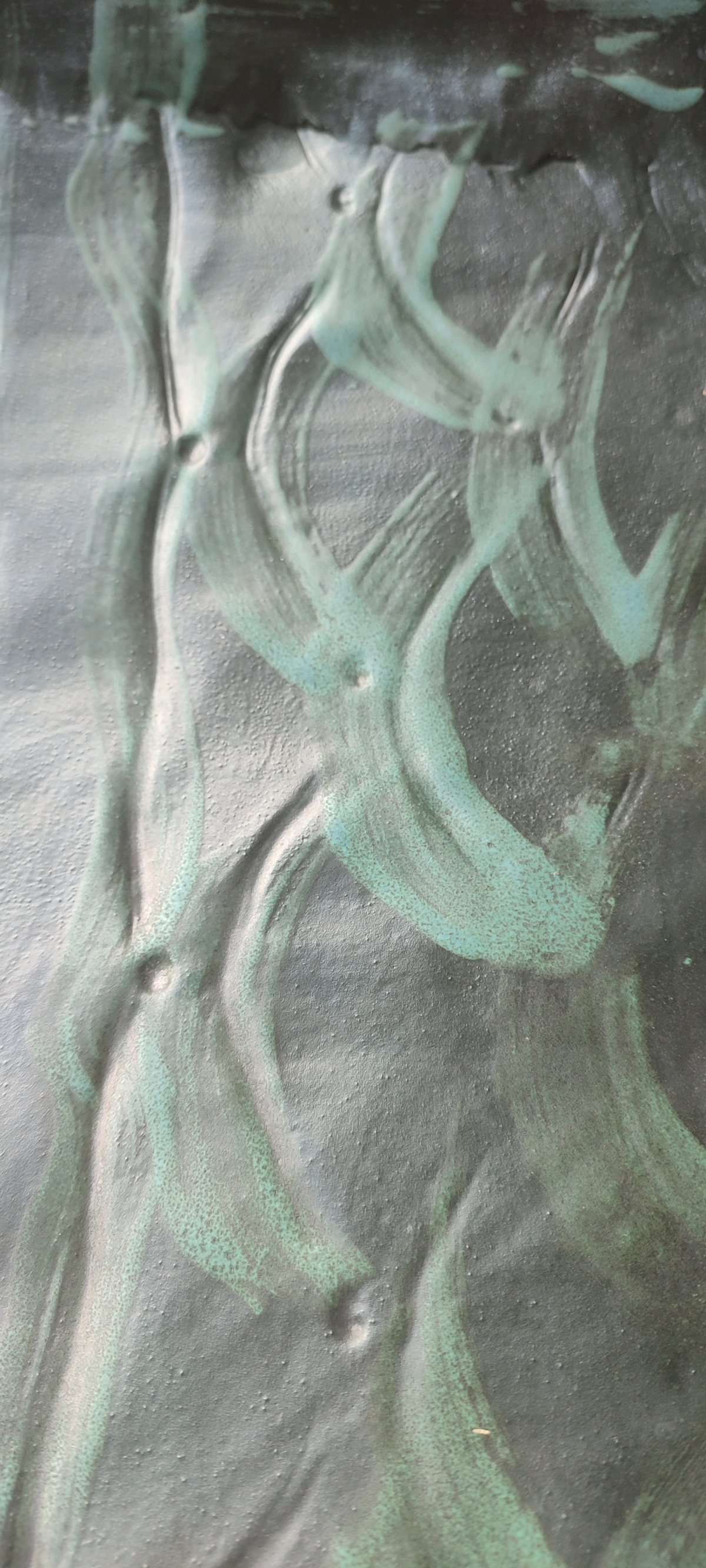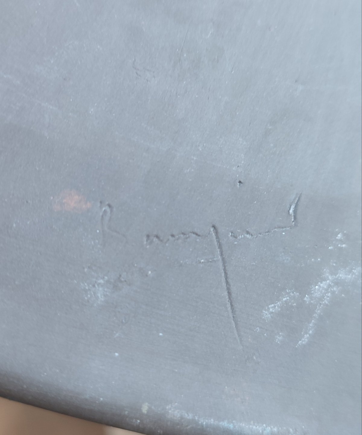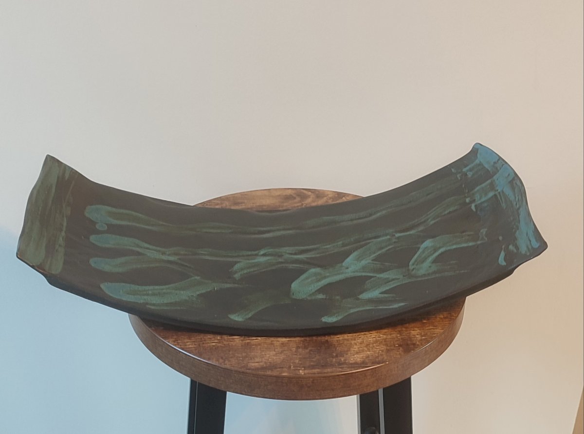 This large free-form bowl measures 42 cm long by 20 cm wide. The surface features textural work with pronounced reliefs and traces of shaping in the mass. The decoration comes in glazed shades of turquoise and emerald with shiny reflections. The raw pyritic stoneware reverse has structural reinforcement ribs typical of large handmade workshop pieces. A cursive signature is incised into the clay, but I have not identified it. Perfect condition.