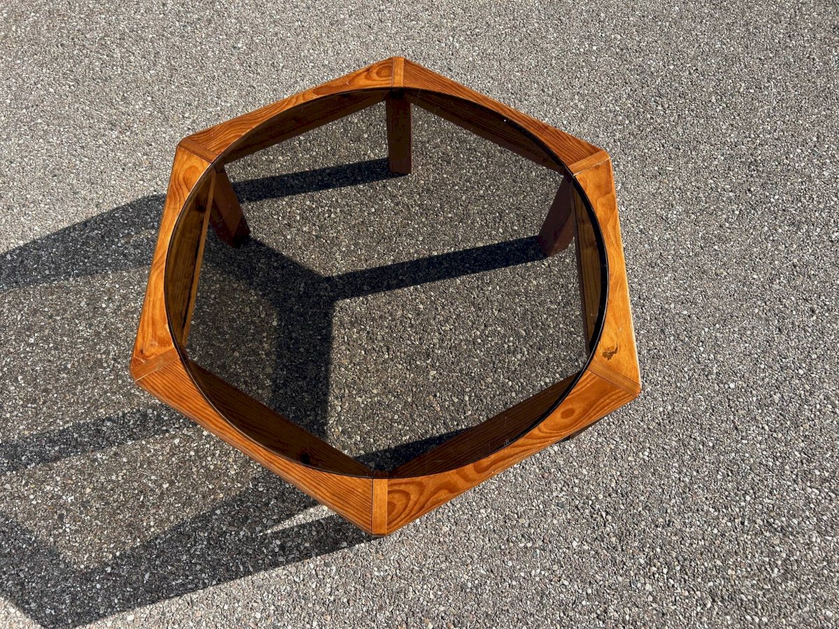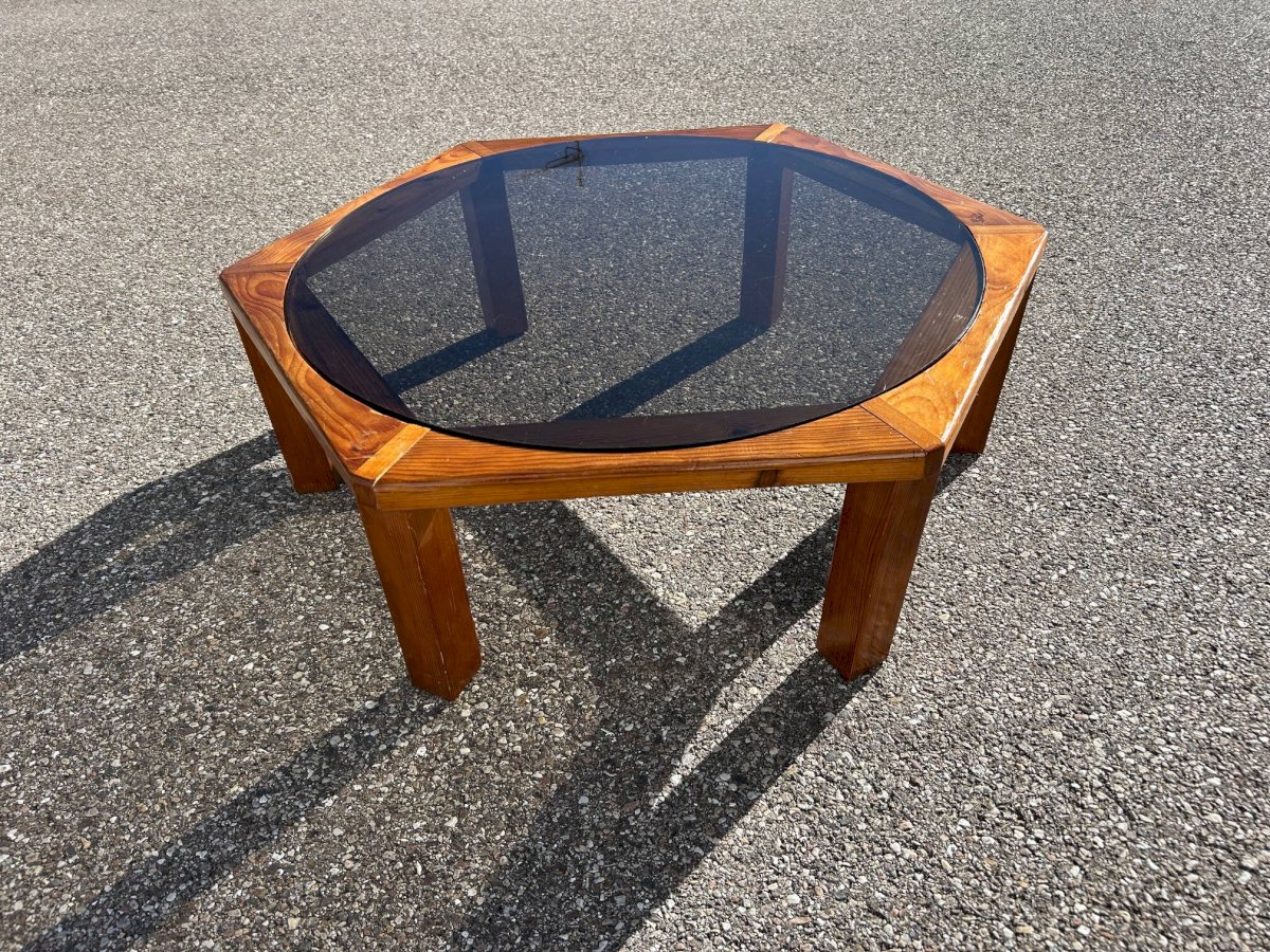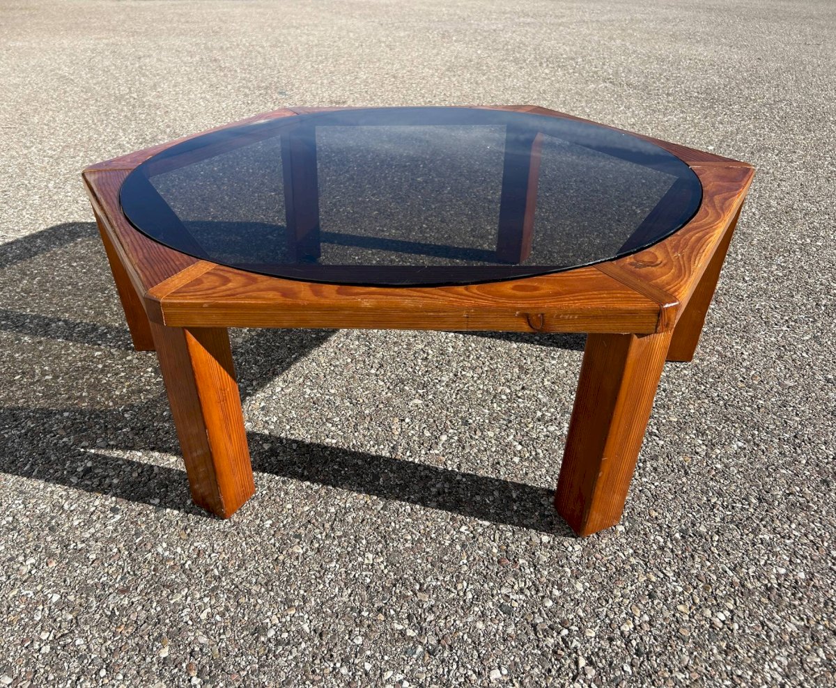 Large pine coffee table with its original smoked glass, 1970s. L: 100 W: 100 H: 31