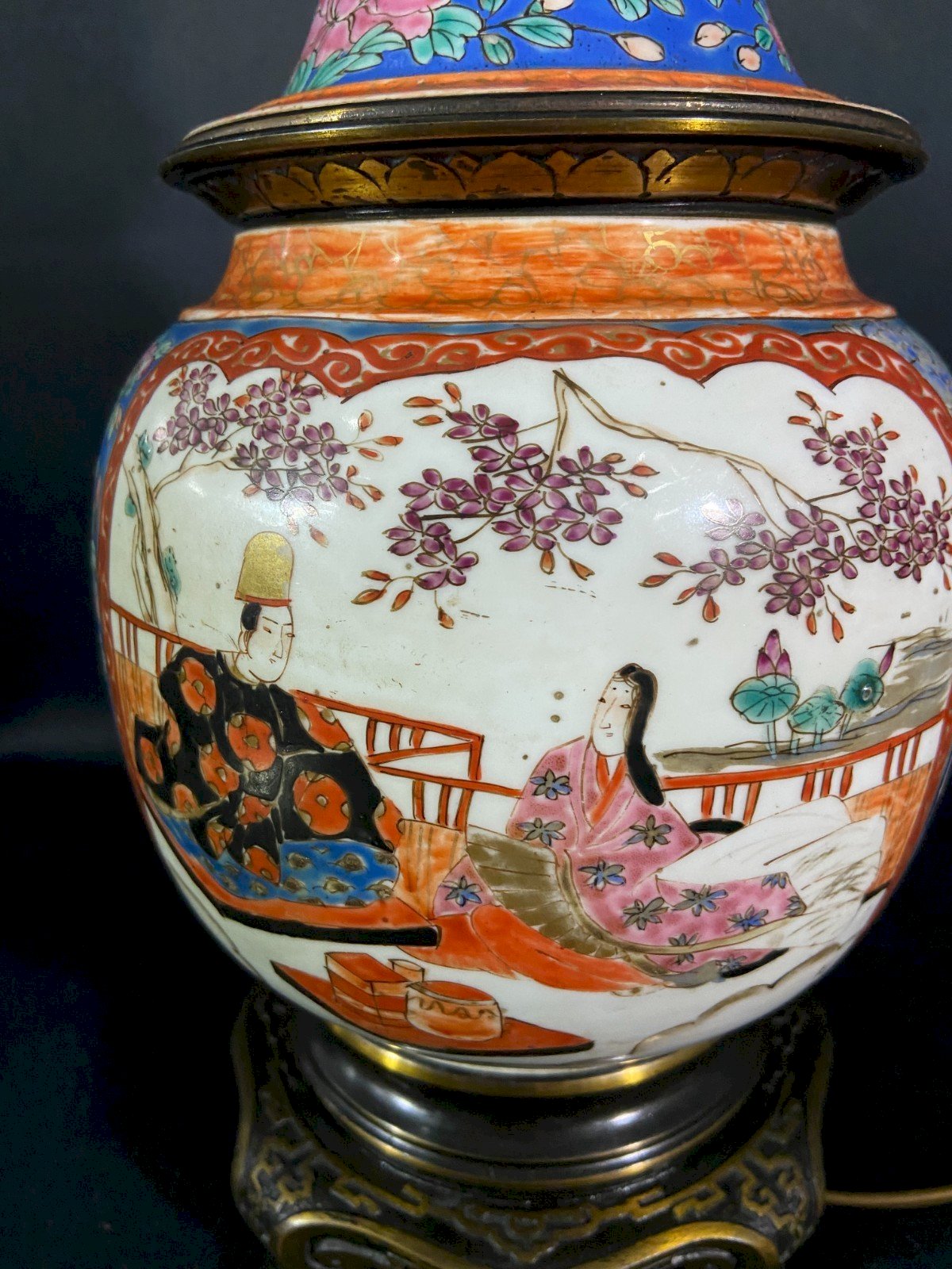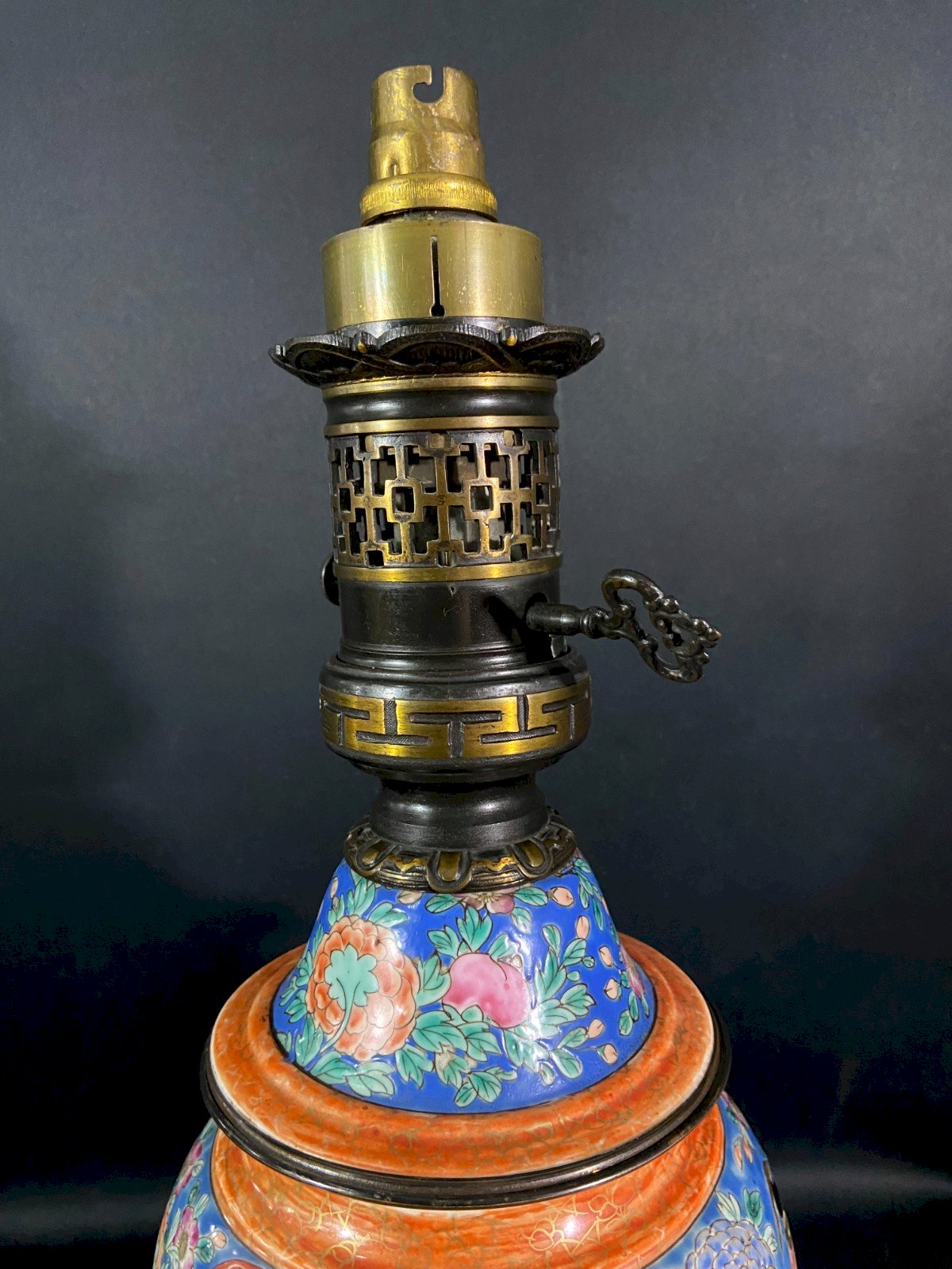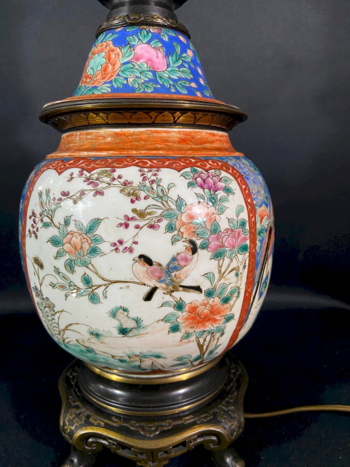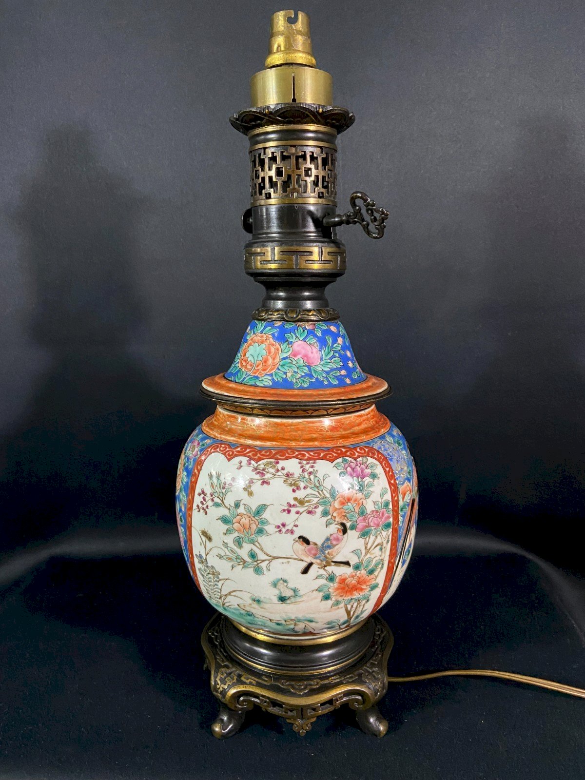 Large Canton porcelain lamp on a bronze mount, late 19th century Qing, Rose Family. Polychrome reserve decoration with birds and court scenes. Functional electrification. Very good condition. Max dimensions: Height 43.8 x 16 cm / Porcelain dimensions only 20 cm. Weight: 2840 grams. Shipping VERY worldwide. Materials from: China.