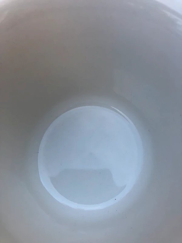 Large vintage earthenware cup with slip-decorated fruit pattern.