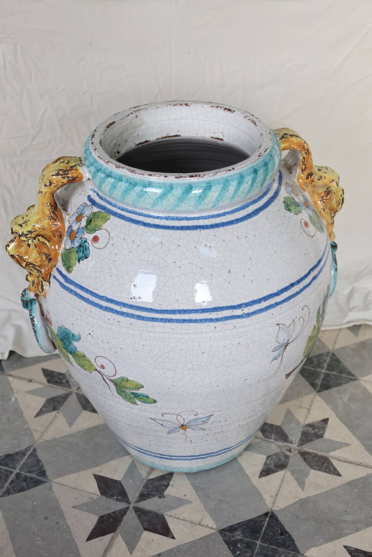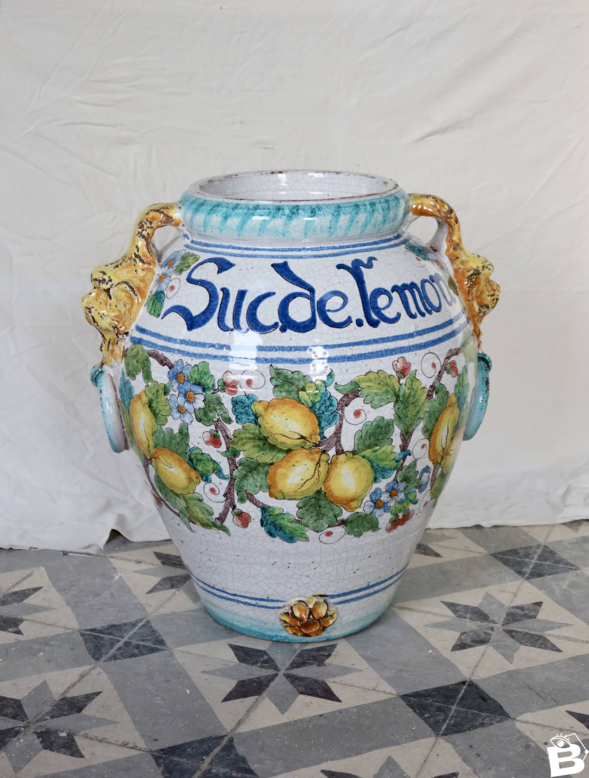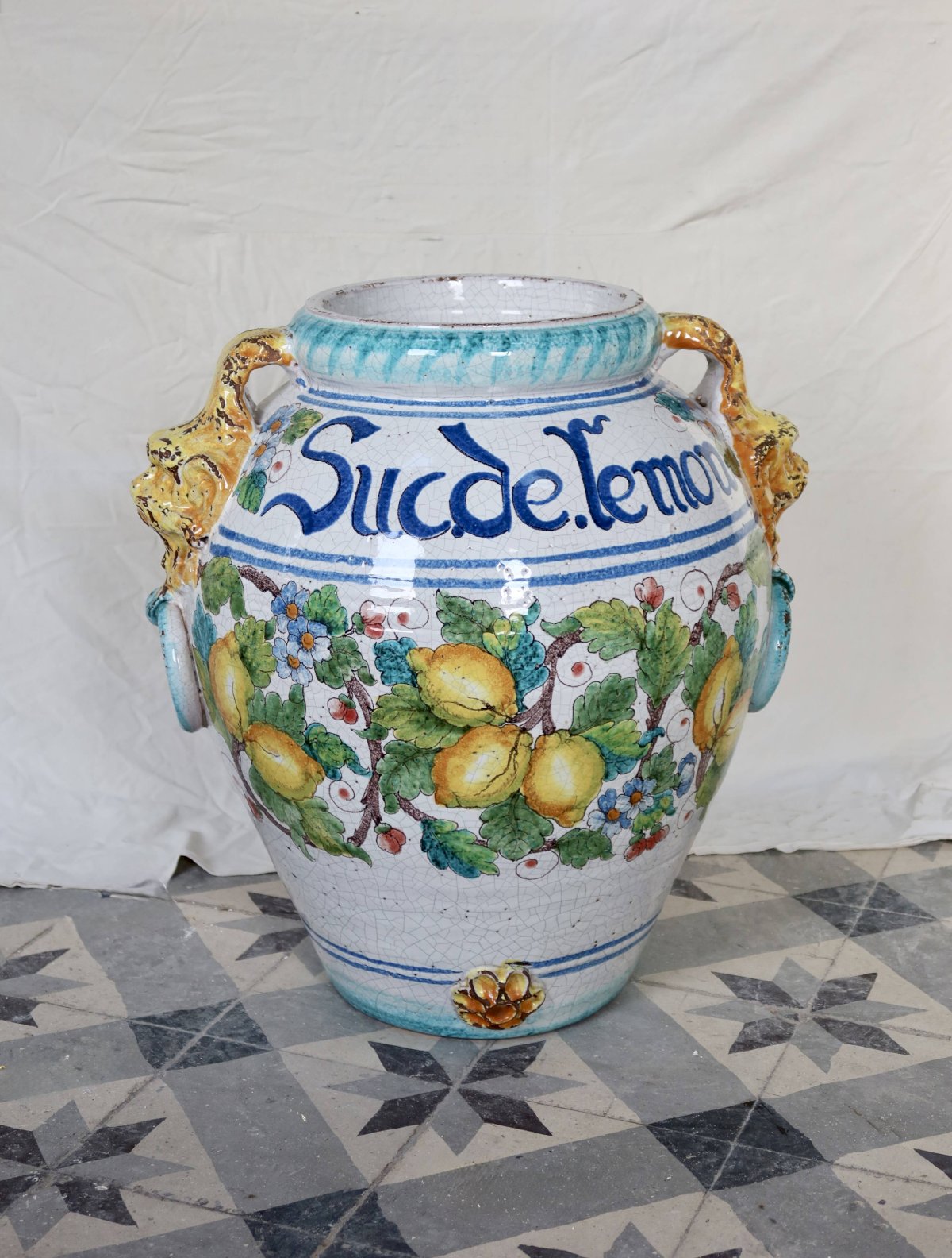 Large decorative glazed ceramic urn, adorned with an Italian design of lemons, foliage, and flowers, featuring the inscription "Suc de lemon" on the belly. The colorful glazes and crackled finish give this piece a lot of character, in excellent condition and particularly heavy. A strong decorative object, ideal for sheltered indoor or outdoor spaces, for a Mediterranean or country house ambiance. Dimensions: 50cm x 50cm. L: 50 W: 50 H: 50