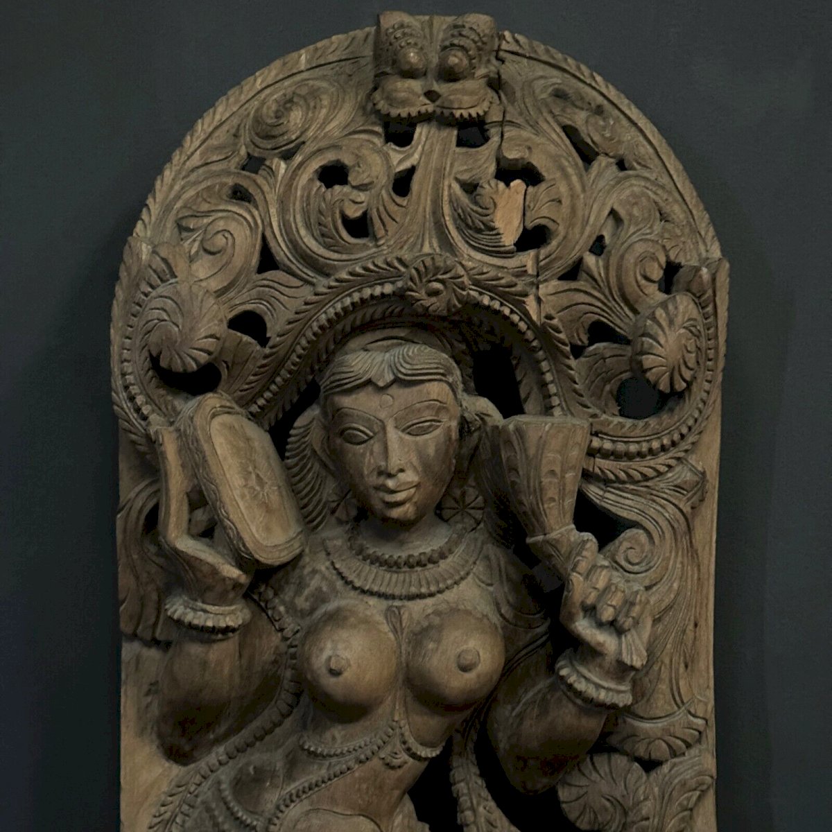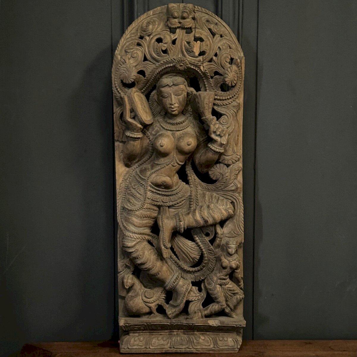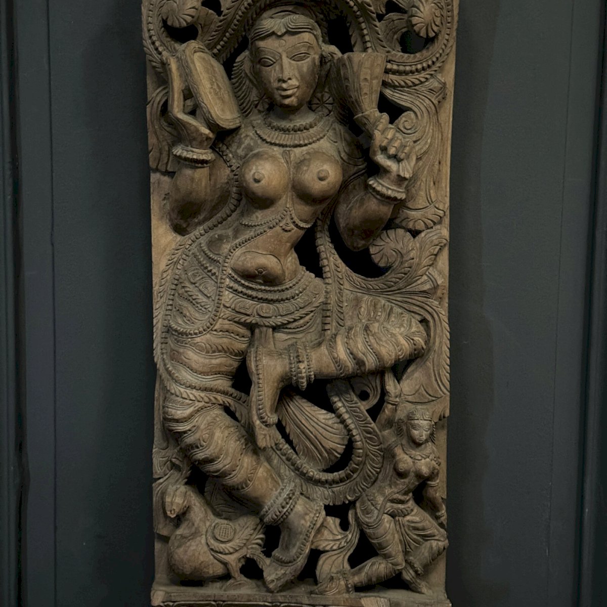 Large Indian wooden bas-relief sculpture of a goddess XXth L8789 Here is an Indian deity created in bas-relief, sculpted from the mass. It is a work from the 20th century with a nice patina, everything is natural. Regarding the condition, there are signs of wear, small losses, and cracks. Our photos allow you to appreciate the quality of this bas-relief. Please detail the photos carefully. Do not hesitate to zoom in. The photos are an integral part of the description. Dimensions: Height: 91.5 cm Width: 34 cm Depth: 7 cm PAM: QKG-2172103 S: FFXGX5U9 I remain at your disposal for any questions. Type: Sculpture Height: 91.5 cm Material: Wood Length: cm Features: Bas-relief Dimension (cm): From 71 to 100 Width: 34 cm Theme: Goddess