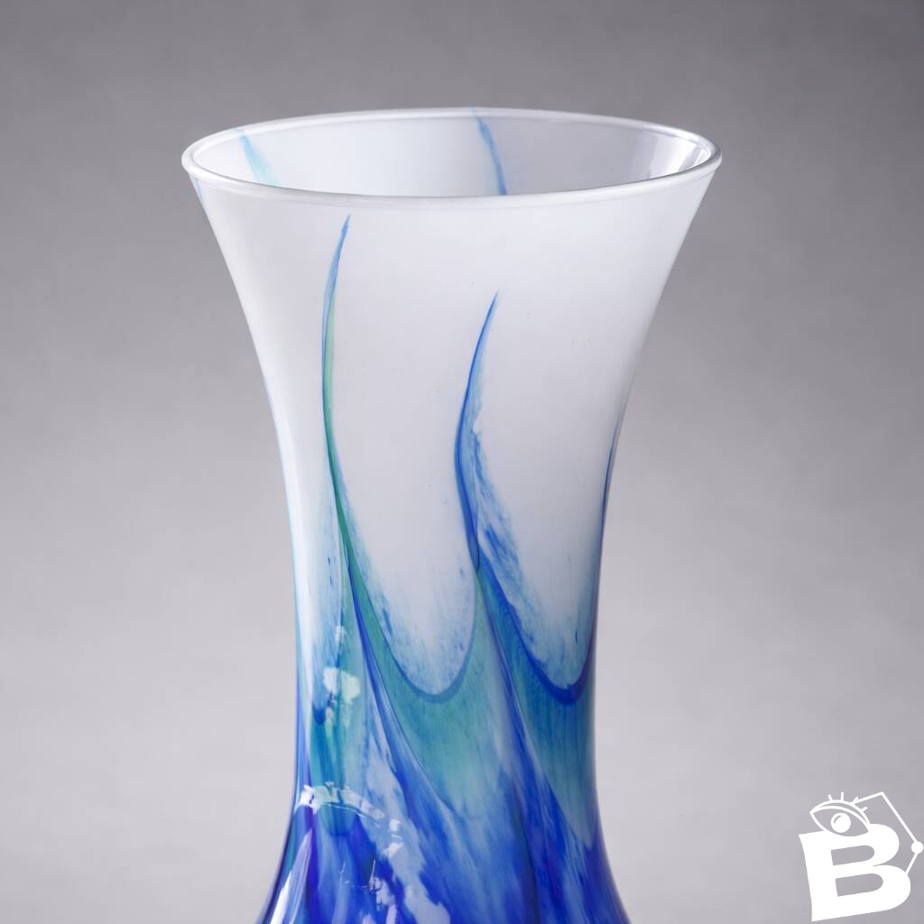 Wonderful large handcrafted opaline glass vase from Murano, with a beautiful height of 30 cm, combining contemporary elegance and artisanal inspiration. Aquatic shades of different blues and whites, with veined marbling. A gradient of opaline white at the base of the neck, enhanced by flowing deep blue and lagoon green marbling.
